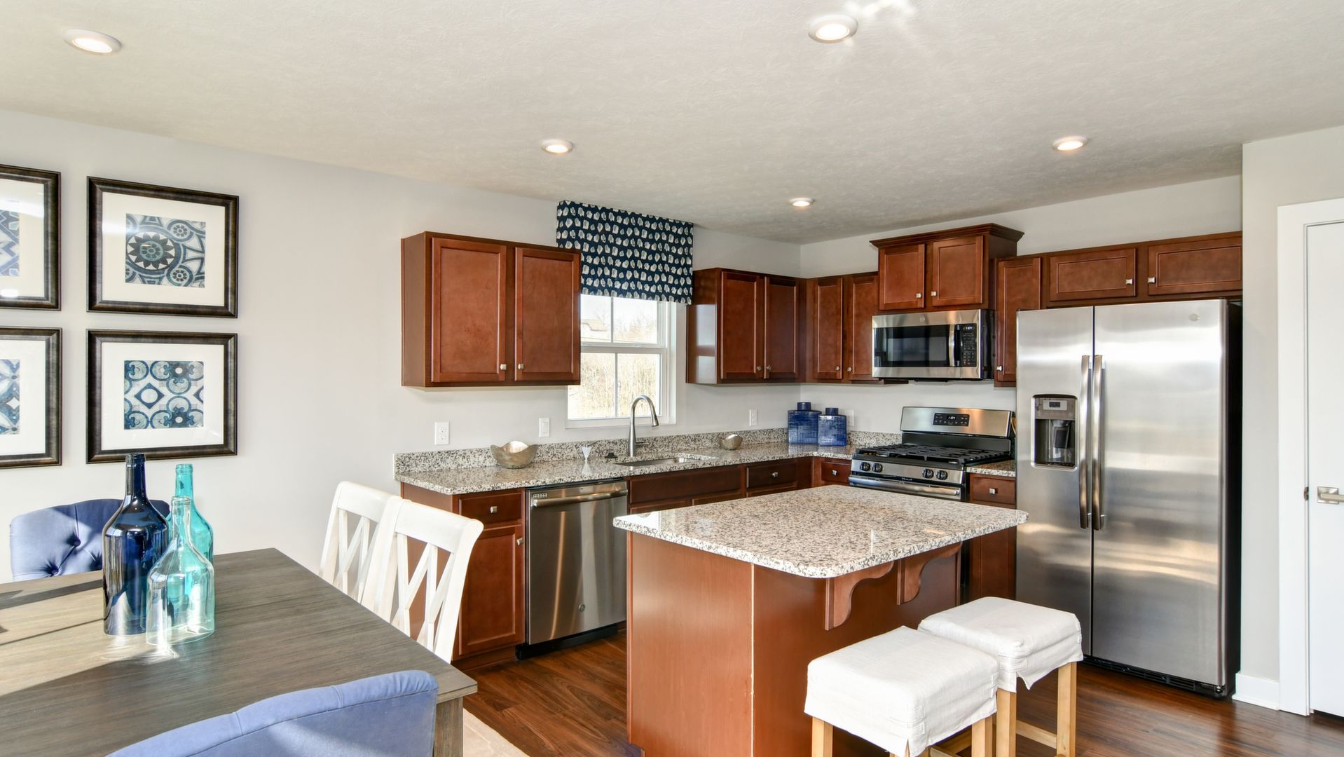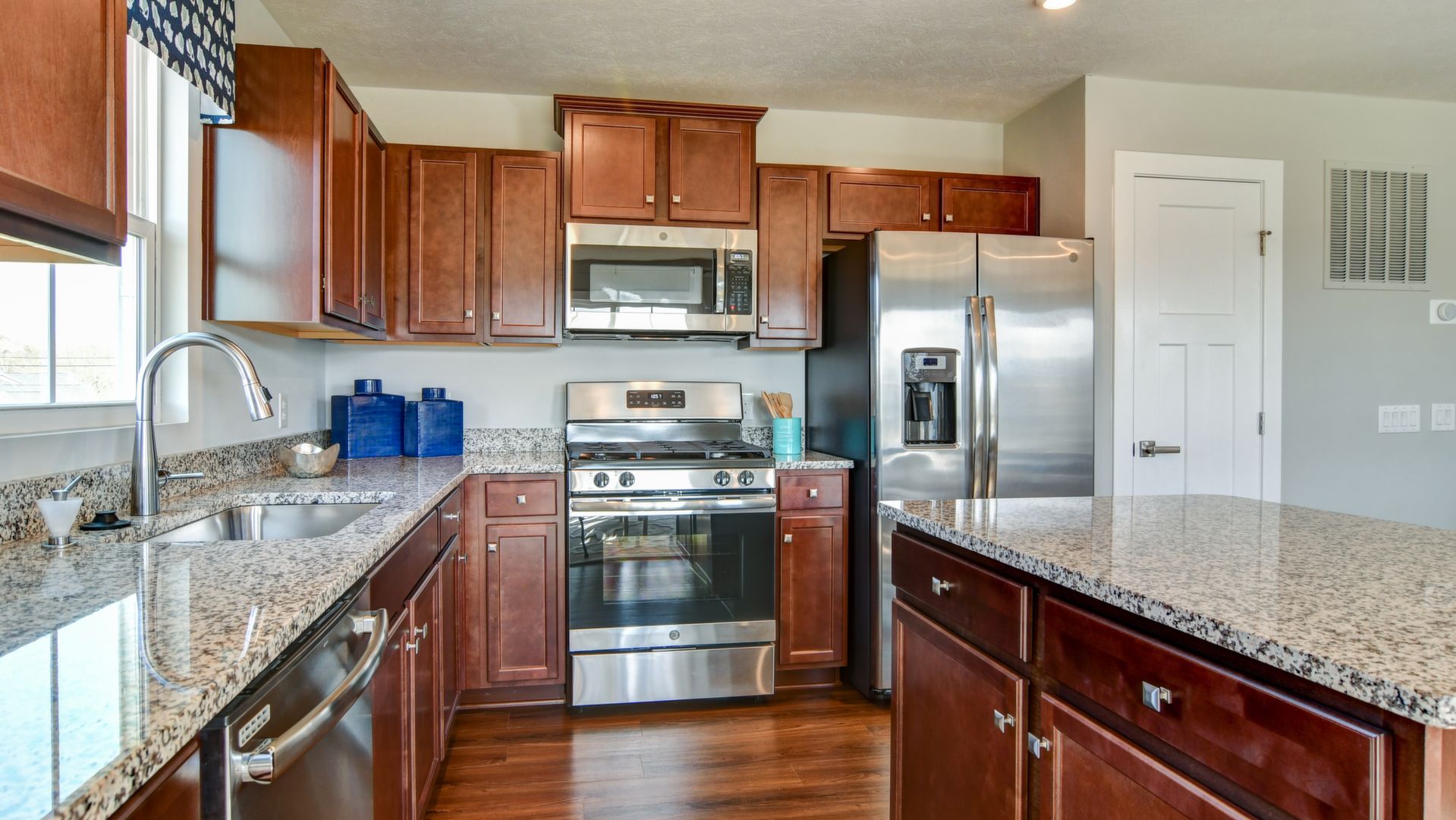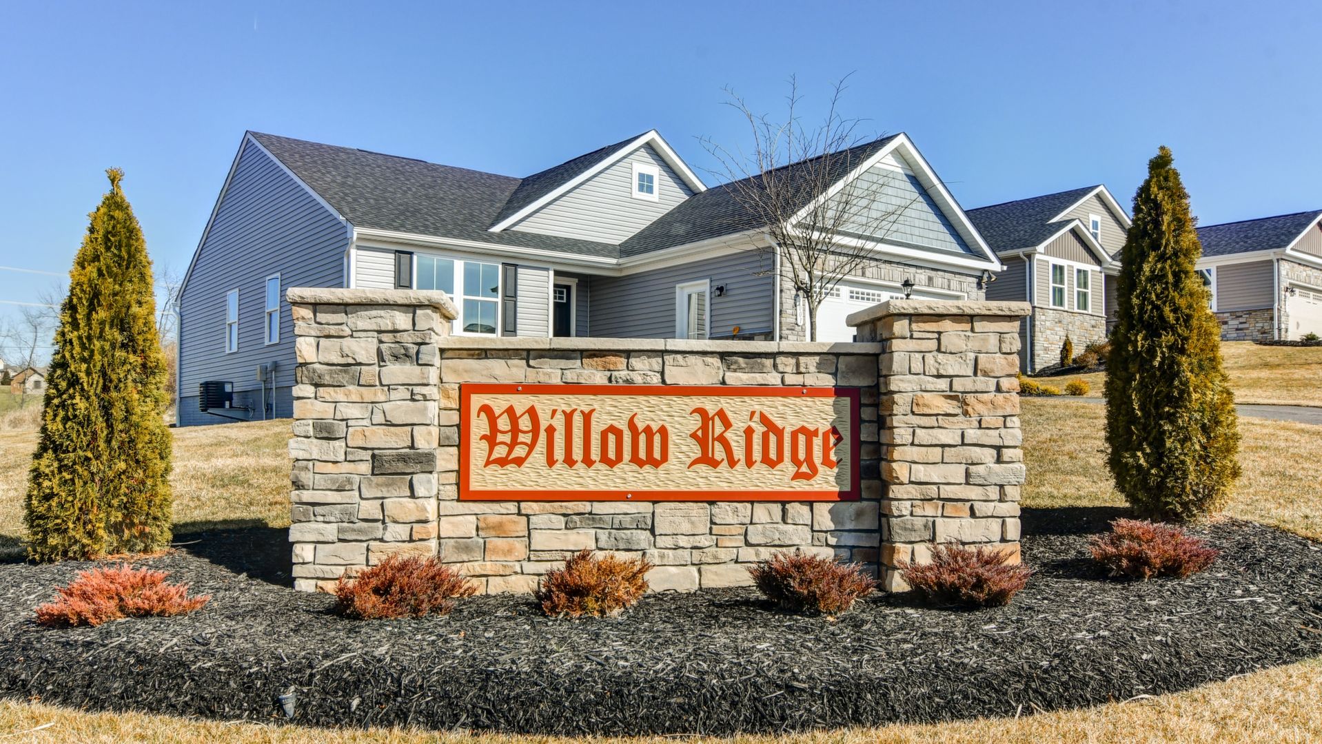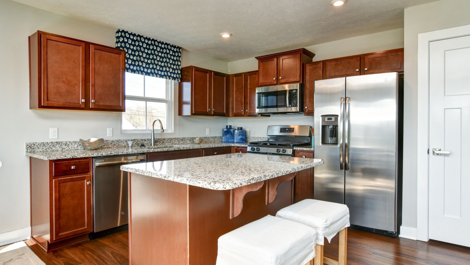 Come see this gorgeous one-level ranch home, it won't last long! Beautiful partial stone cottage style exterior with upgraded landscaping, an irrigation lawn system and spacious backyard. This home features 2 bedrooms, office, 2 full baths, huge laundry room, kitchen island with granite countertops, walk-in shower in master bedroom, ceramic tile in both bathrooms and laundry room, carpet in bedrooms & luxury vinyl flooring throughout the rest of the home. All stainless steel kitchen appliances included. Includes security system. This model home includes all window treatments, area rugs, & bedding. A must see!