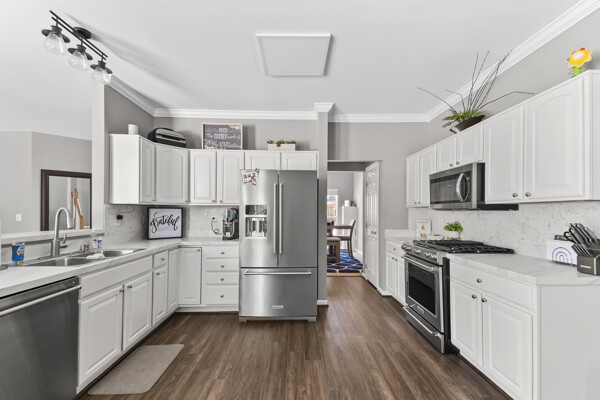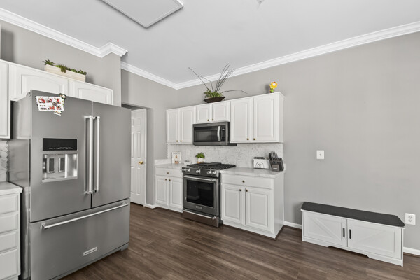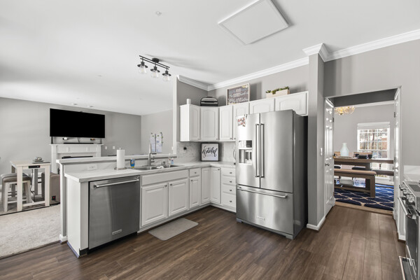 The kitchen is a chef's dream, featuring island with seating, high-end appliances, and plenty of counter space for meal preparation. The spacious bedrooms offer ample closet space, providing plenty of storage for all your belongings.