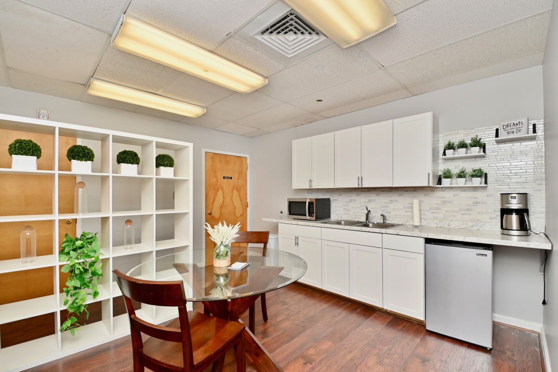 Suite 502 features a large entryway and kitchenette and 5 offices. Ste 501 features 4 offices and a large entry way.