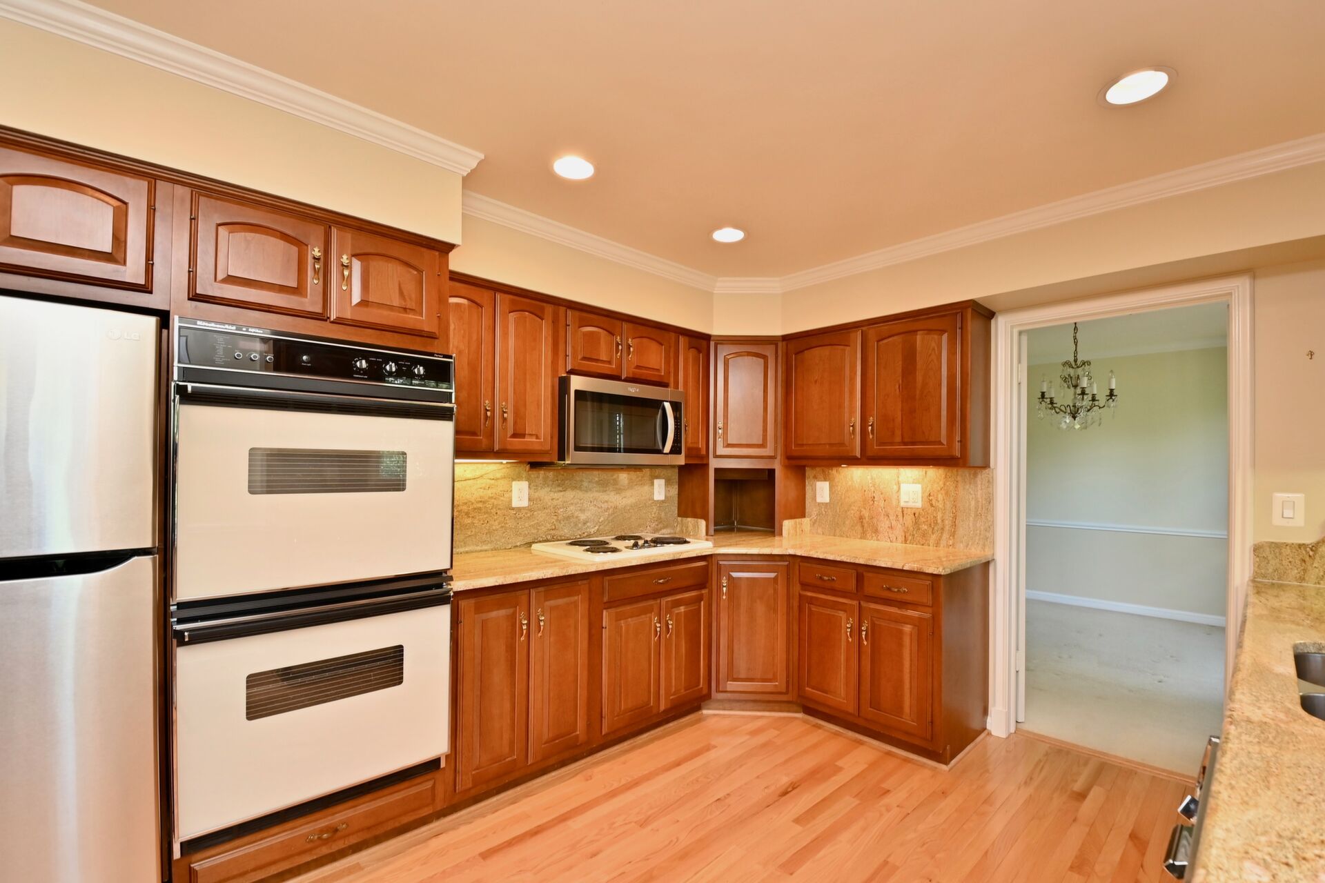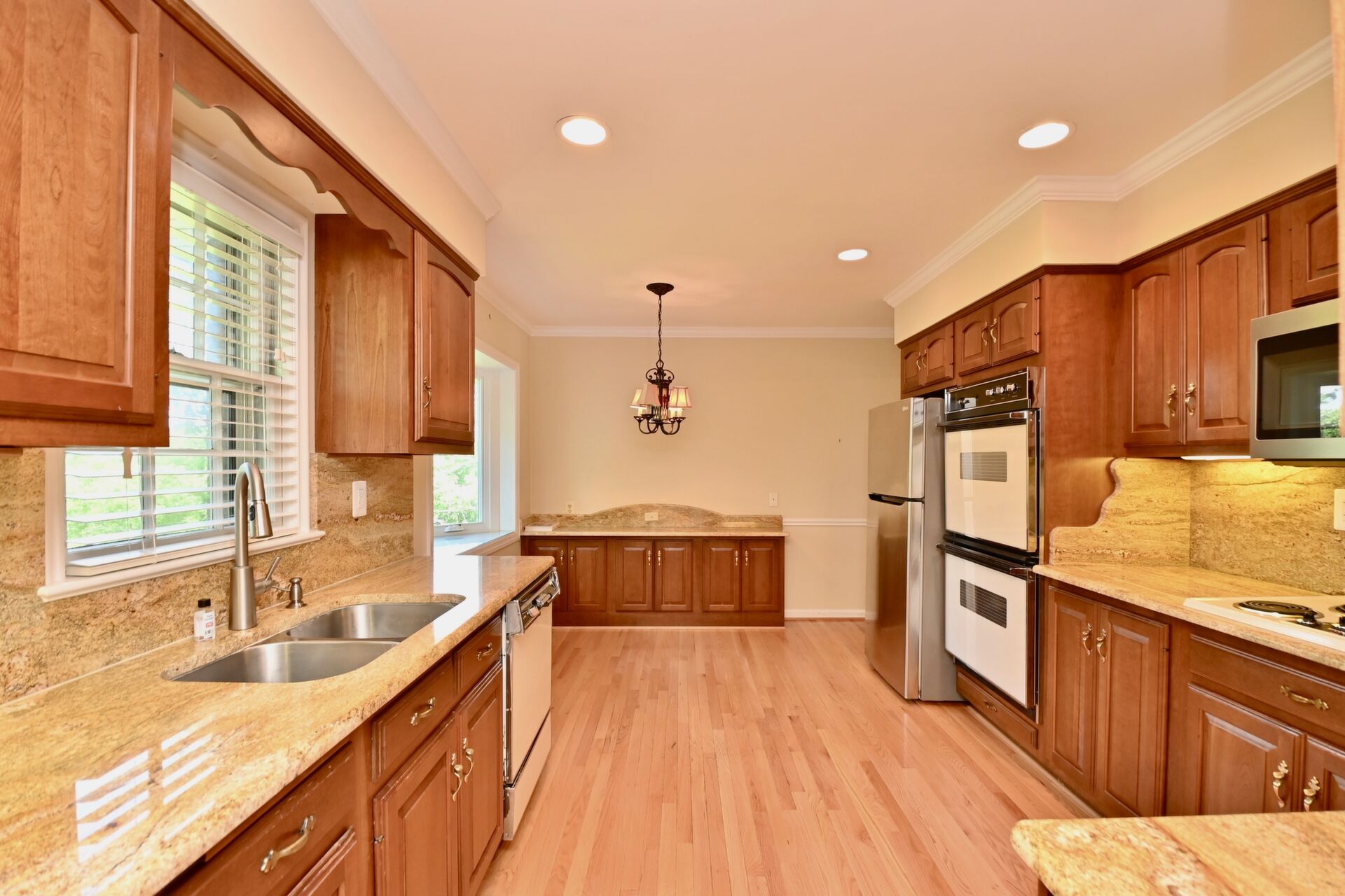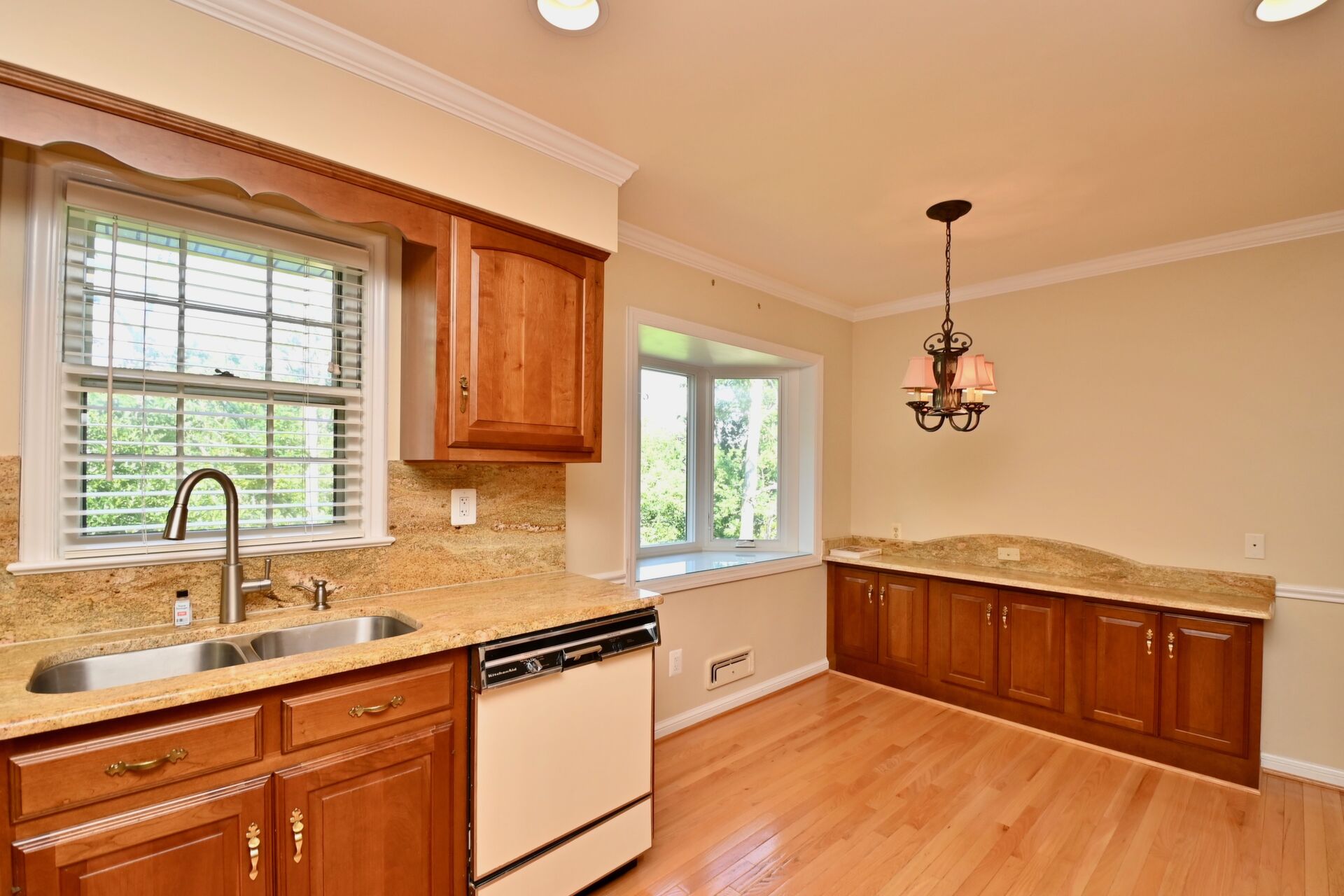 This home features hardwood floors in the kitchen, large living/dining room, TWO fireplaces, finished recreation room which walks out to your beautifully manicured backyard.