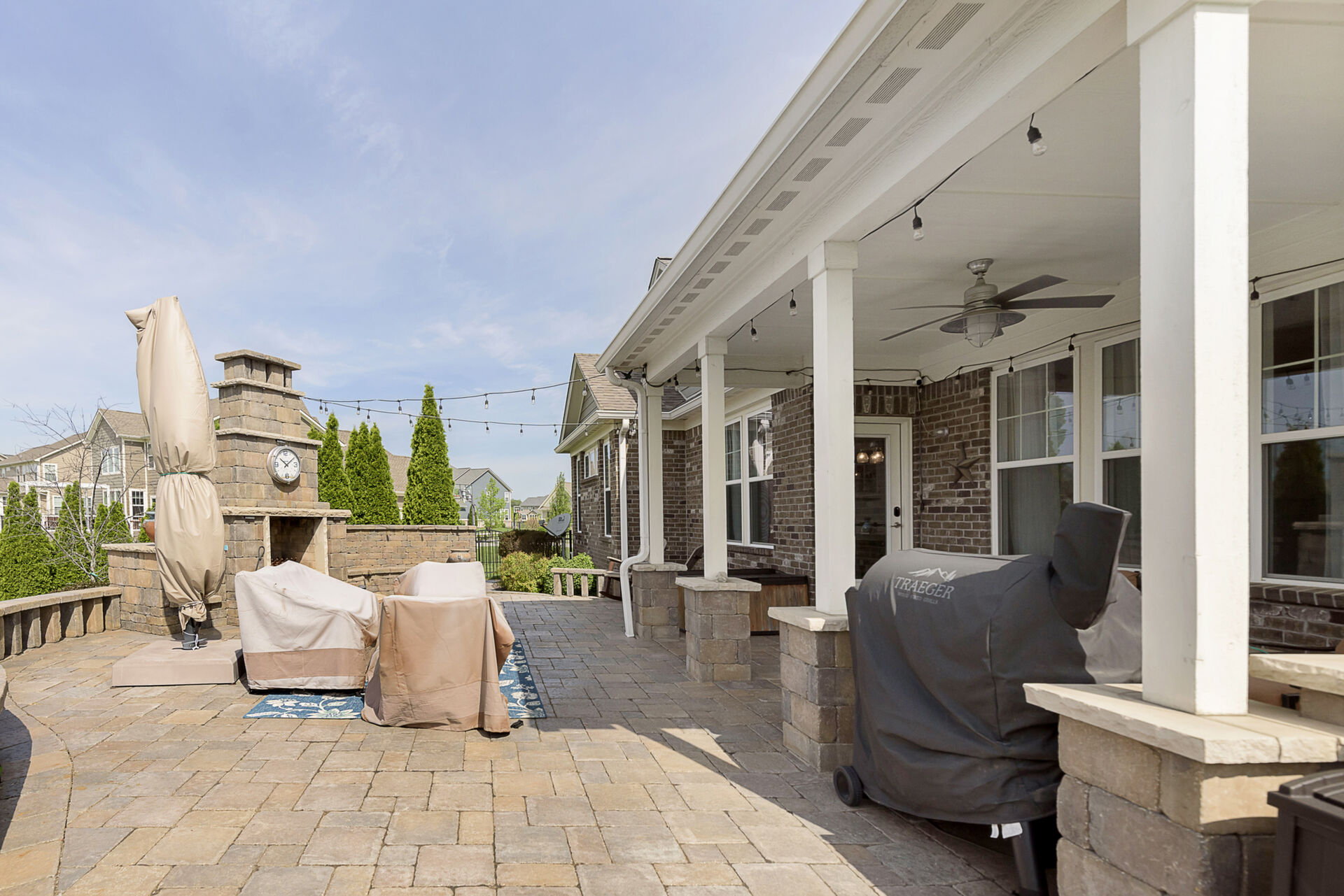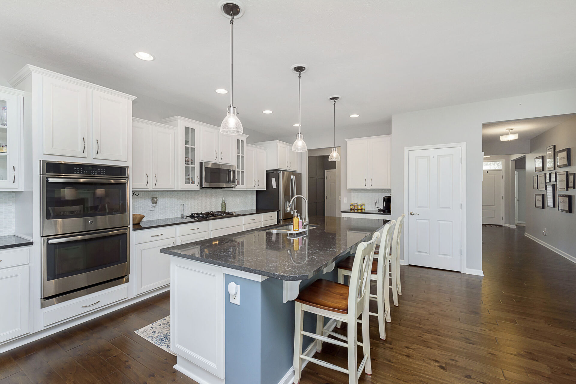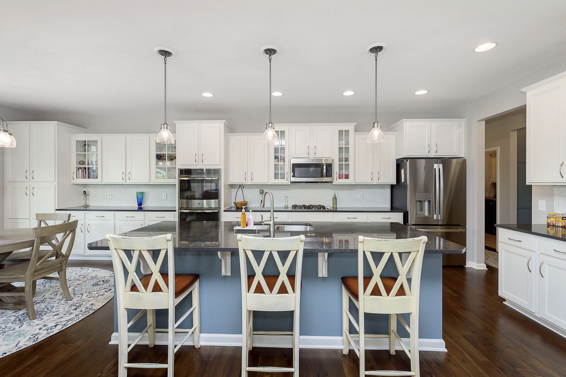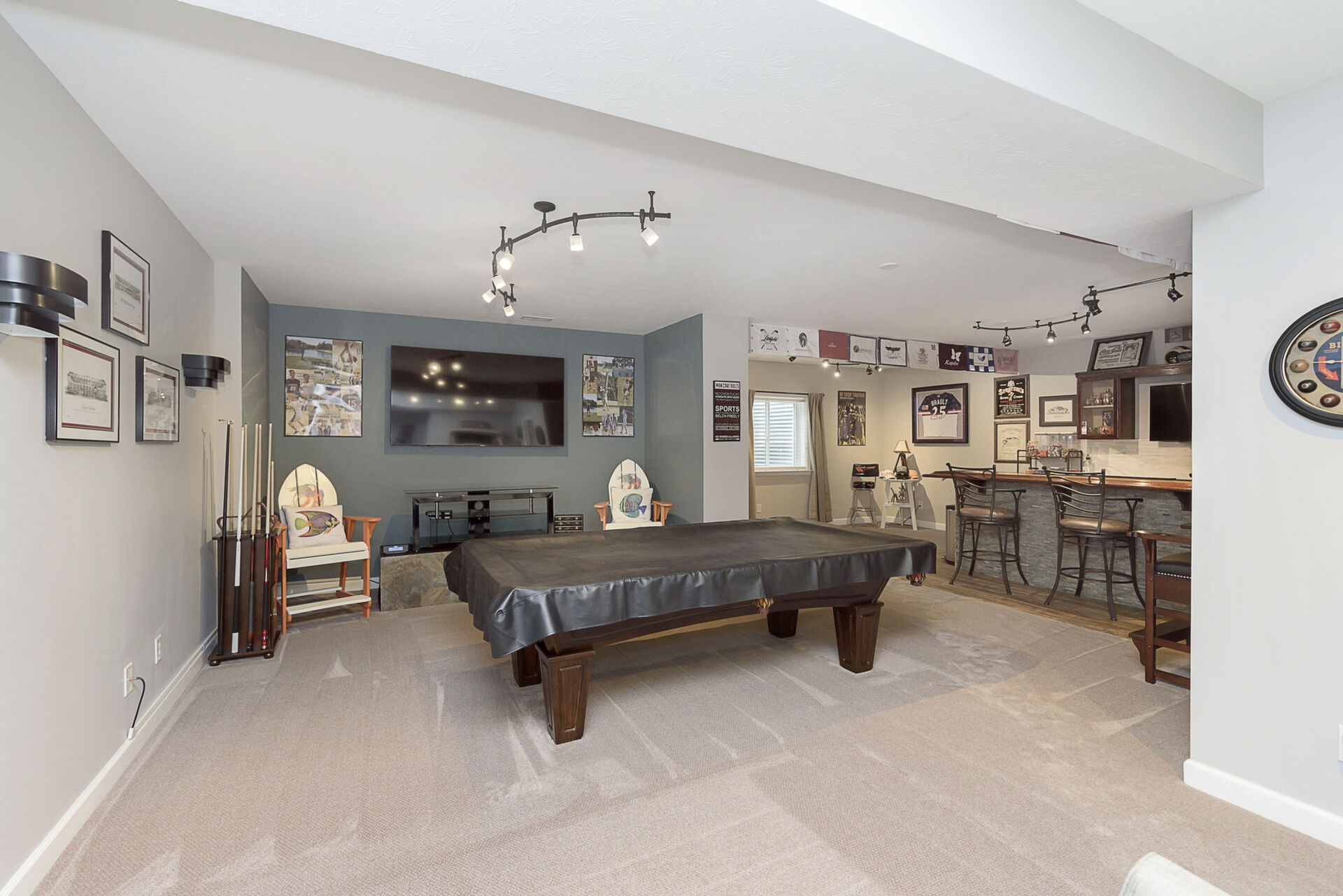 Exceptional 4 bedroom, 4.5 bath ranch style home with spacious floor plan, Pristine Condition. Large open entry brings you into an open Great room with fireplace, tons of windows, Open to Gourmet Kitchen w/tons of counter space, which features an 8-foot Island, SS appliances, double oven, & sandstone countertop, perfect for hosting gatherings! Primary with ensuite on the main level double sinks, oversized shower, and custom finished walk-in closet. Bedrooms 2 & 3 share a Jack-n-Jill bath on the main, an additional bedroom up with a full bath, and a large bonus room. Entertaining is effortless with a fully finished basement, Wet Bar, & Theatre Room, added in 2020. All Components and Memorabilia, Pool Table & Captain Chair, and Mounted TVs in the Basement and Living room stay. The lower level includes a full bath and 2 storage rooms. Amazing serene outdoor oasis w/Custom Paver Patio added in 2017, Outdoor Fireplace, new beverage frig. covered pergola, and extensive established landscaping. All this plus 3 car epoxy garage. This over 5000 sq. ft. of living space is meticulously maintained with many upgrades: New roof 2020, New driveway 2018, Basement & Primary Carpet 2020, Kitchen Frig 2024, Outdoor Frig.
