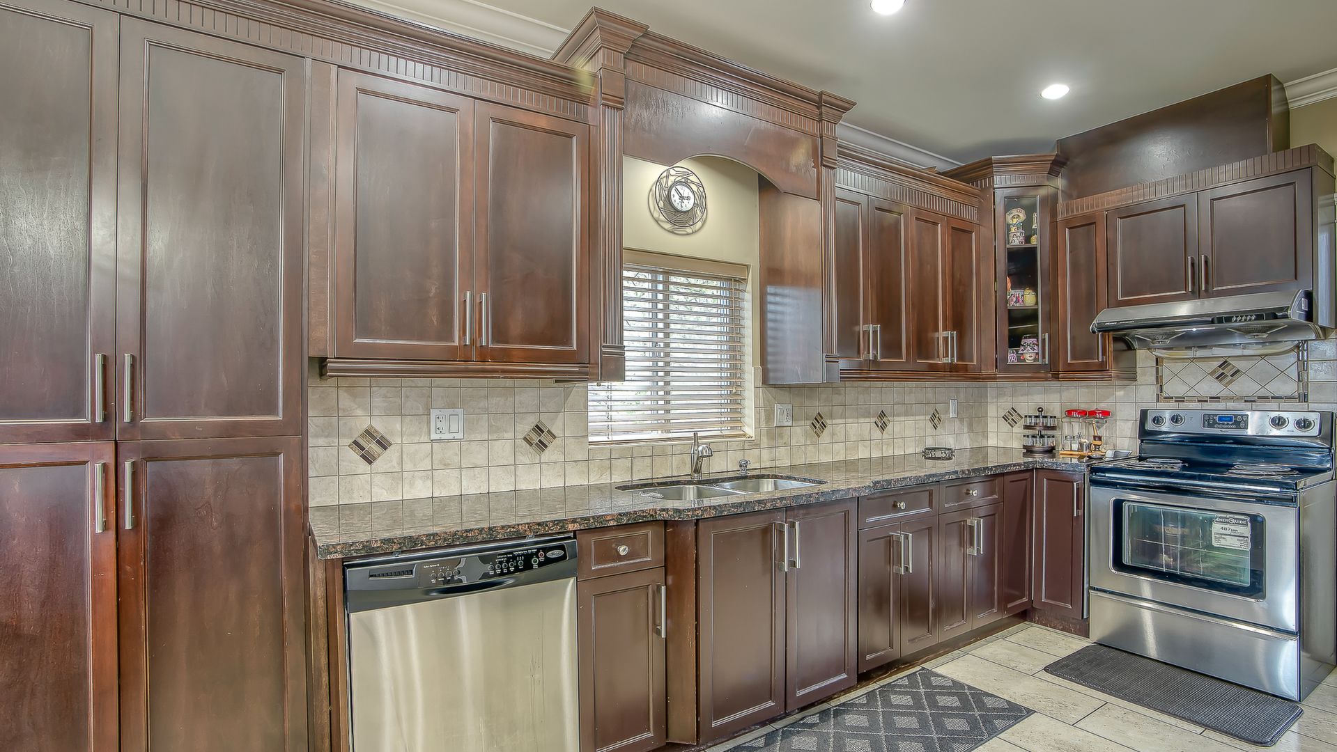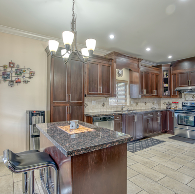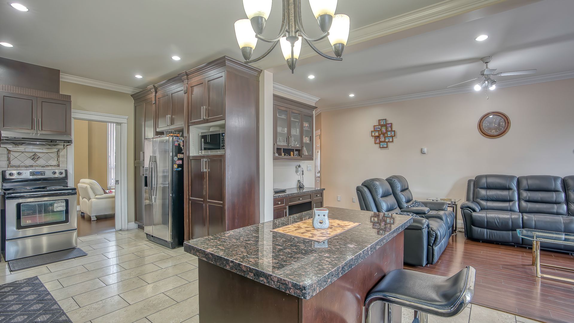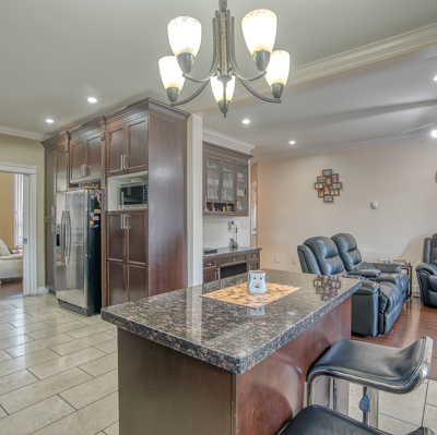 family living with attention to detail and beautiful maple stained wood kitchen with granite counter top and high ceilings. Huge theatre room and bar