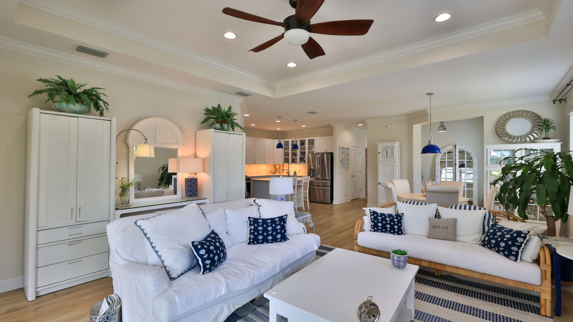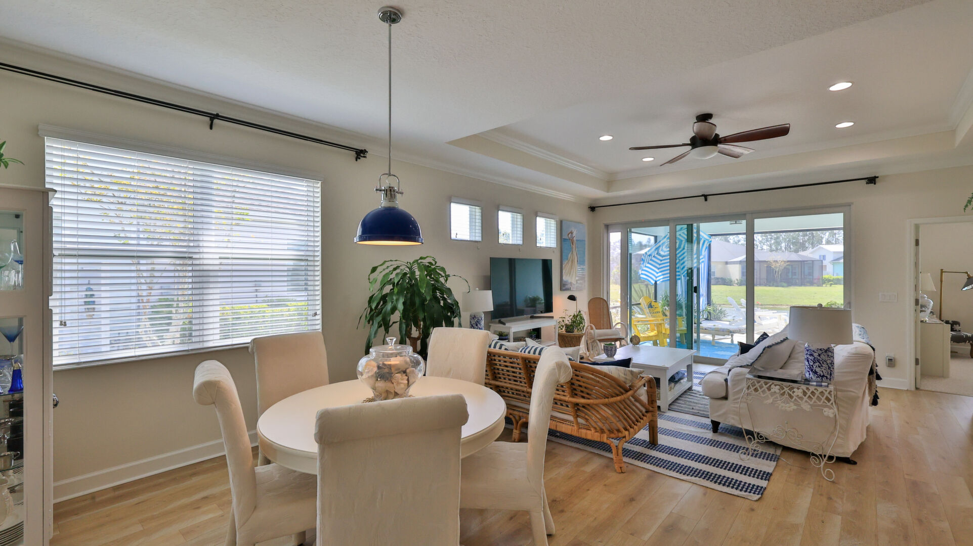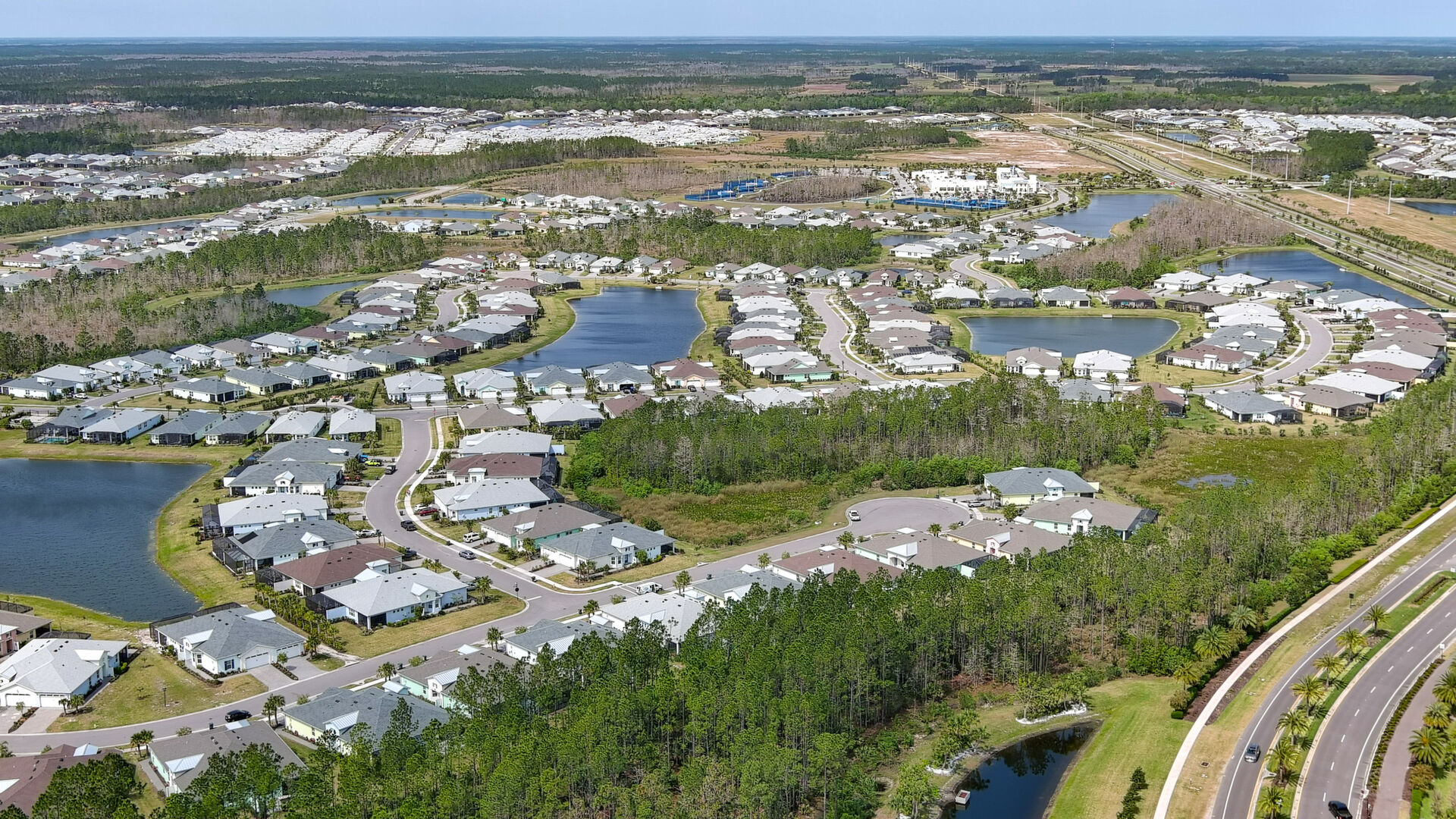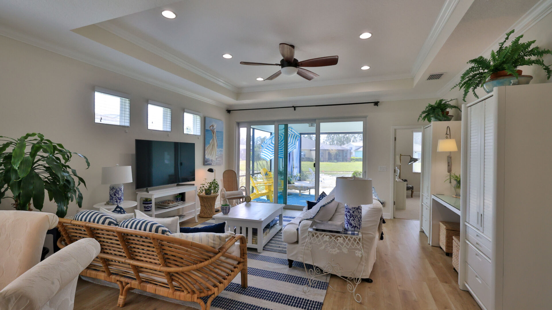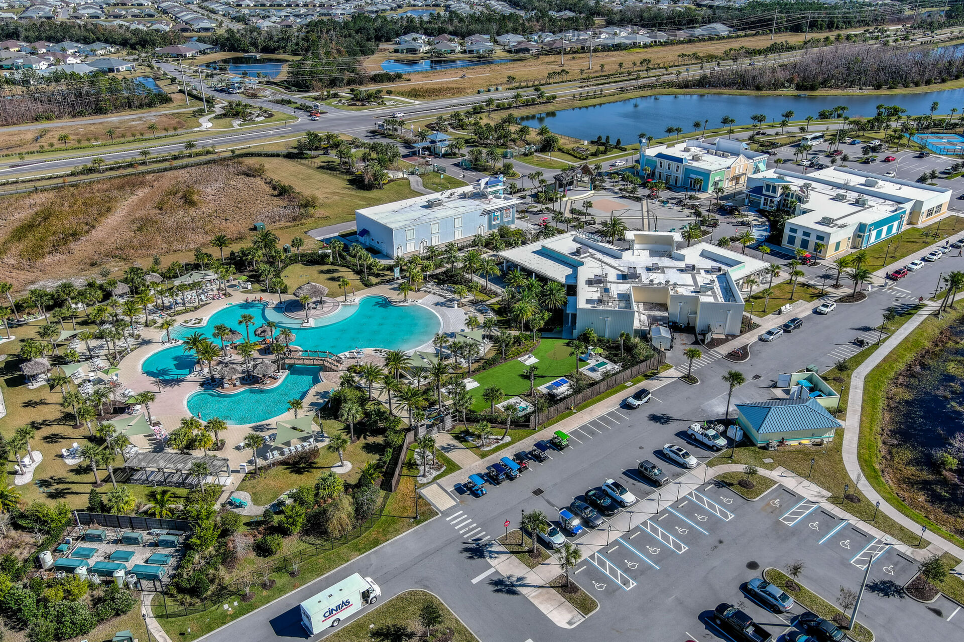 JAW-DROPPING, light, bright, & spacious home -- w/ extended, PANORAMIC screened lanai on which to enjoy gorgeous sunsets over the water! Adjacent to all the RENOWNED AMENITIES for which Margaritaville is famous, this stunning villa is TRULY dog-friendly, w/a small doggie door, outdoor turf, and beautiful, durable laminate flooring. The upgrades are unending, starting with hurricane-rated windows, quartz counters & backsplash, crown molding in EVERY room, upgraded hardware, pull-out & soft-close drawers throughout the kitchen, gas stove, convection oven, & designer tile flooring in the guest bath. This is the ONLY villa floorplan with a 2.5 car garage to store a nice variety of toys-- even more than many of the single-family houses in this award-winning 55+ community. PRICED to SELL, this gem is one you need to see, and offers even more than its own unique beauty. Start living your best life with the fun, beachy vibe and endless neighborhood activities from which to choose. From trivia & karaoke nights, to fitness classes, the Bar & Chill restaurant, to themed parties & events, there's something for EVERYONE in this gated community. Included within your HOA fees, you have access to an on-site office center, state-of-the-art fitness center, three heated pools, free shuttles to the Latitude Margaritaville beach club, a pottery center, a wood shop, an on-site movie theater, dog park, tennis, pickleball, golf cart paths throughout, and more. Grab it while you can!