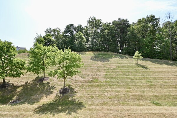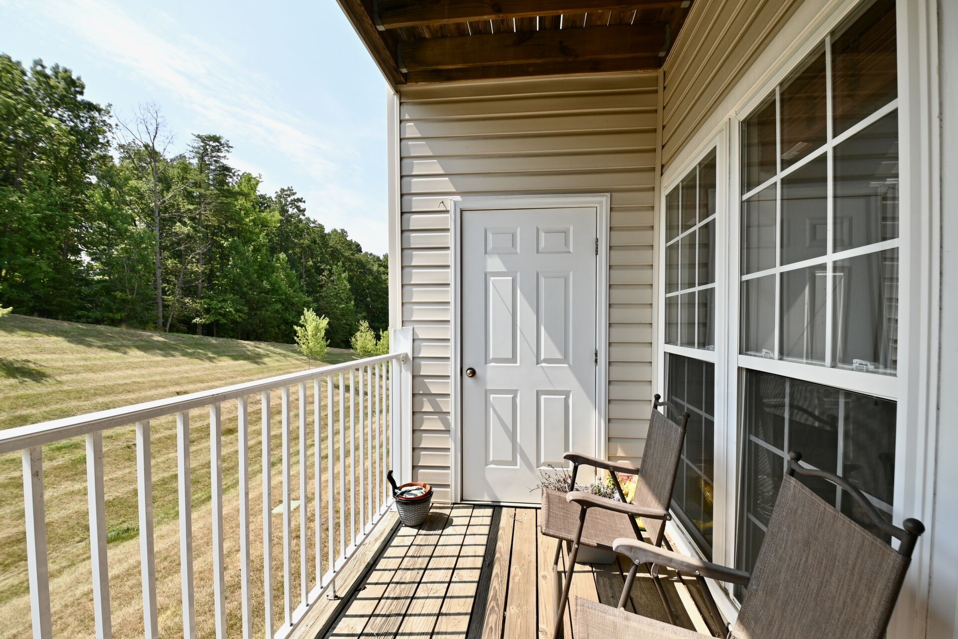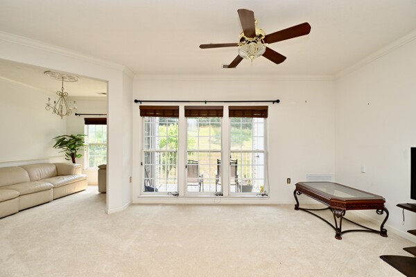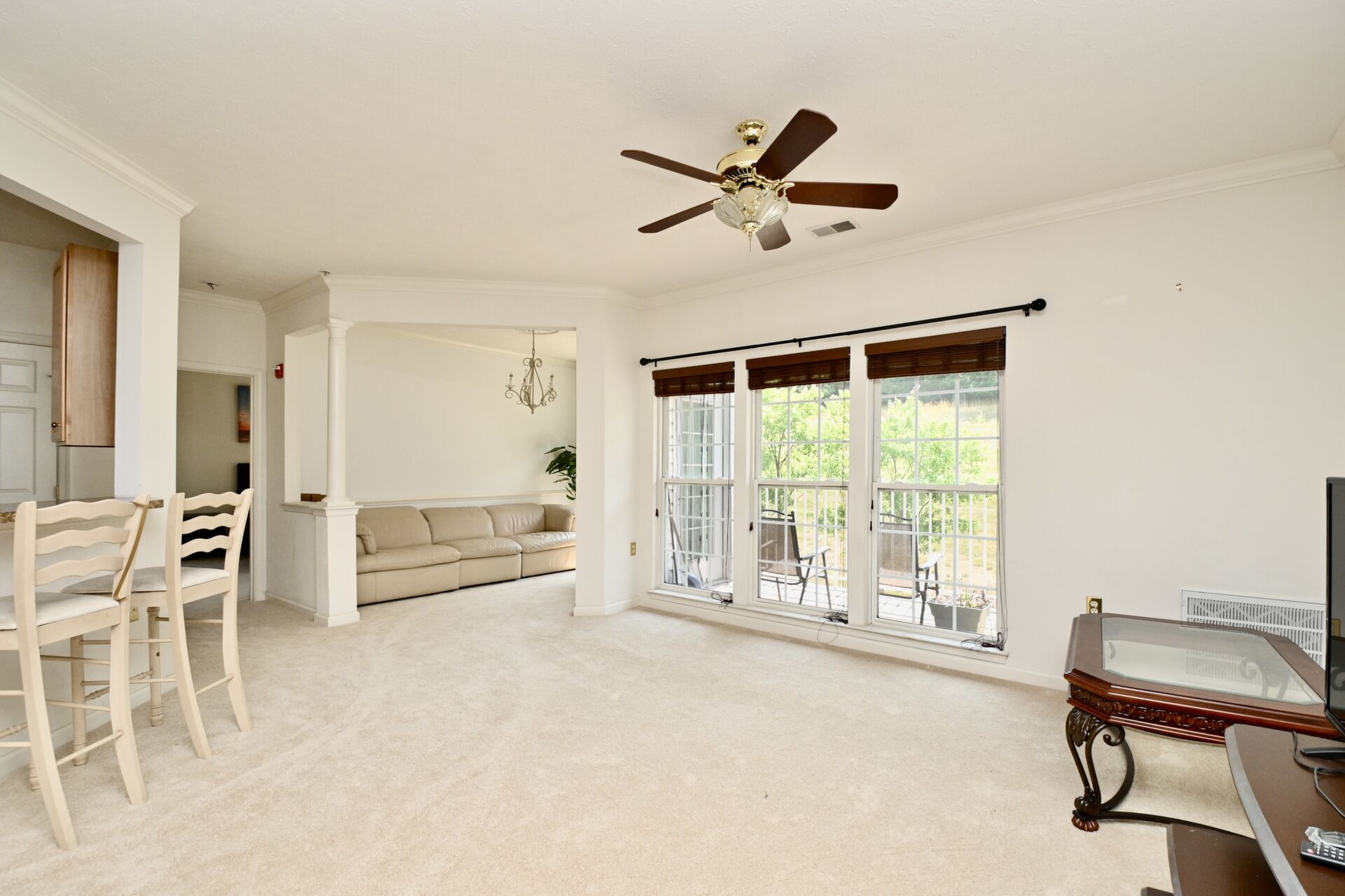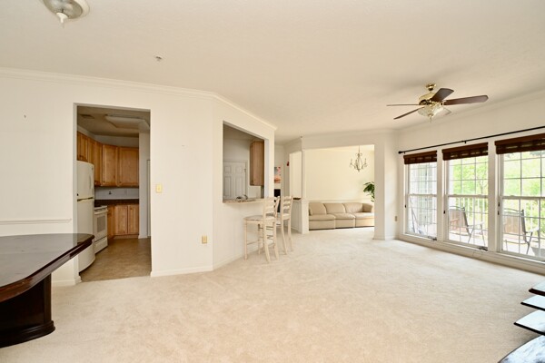 This beautiful home features an open floor plan, kitchen with island seating, crown molding, new carpet, ample closet space, and a balcony that offers privacy and a view of the woods.