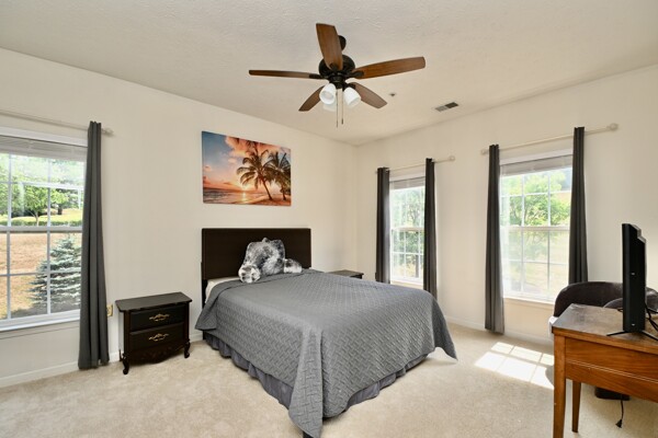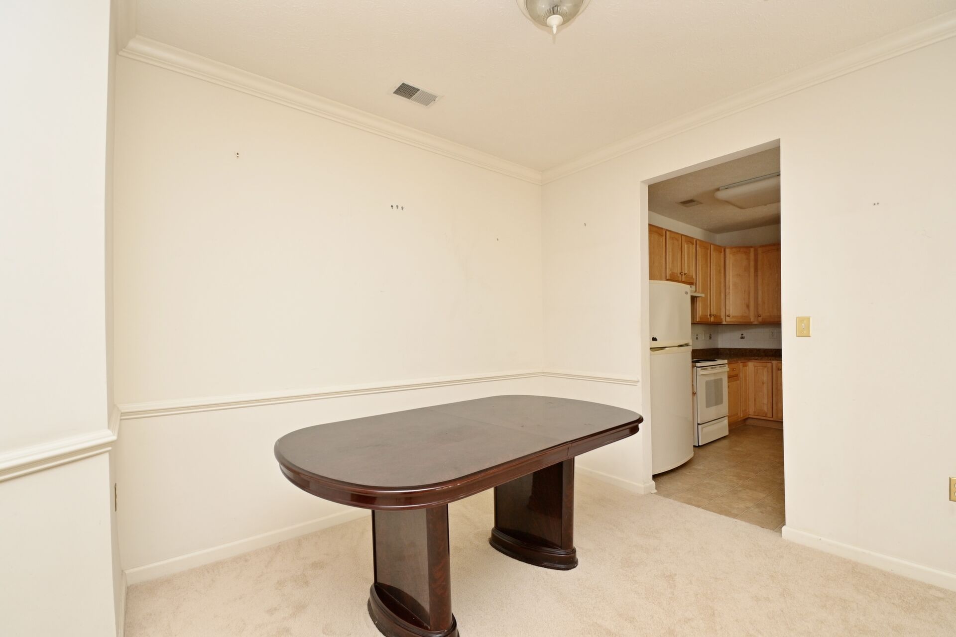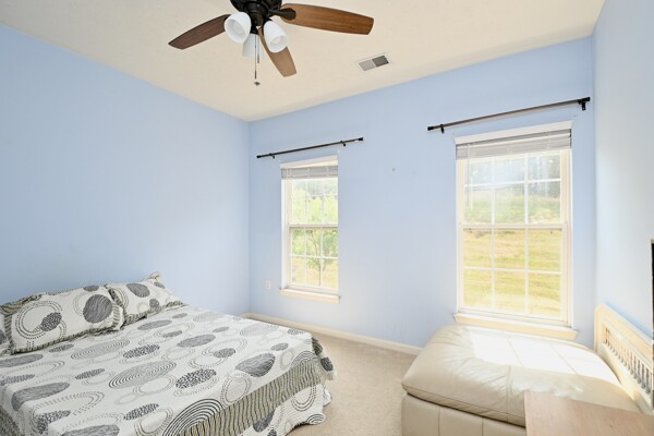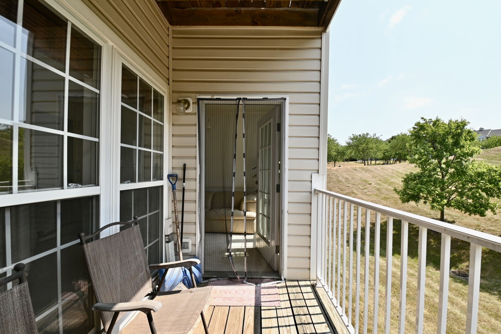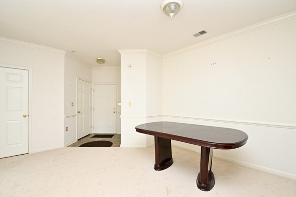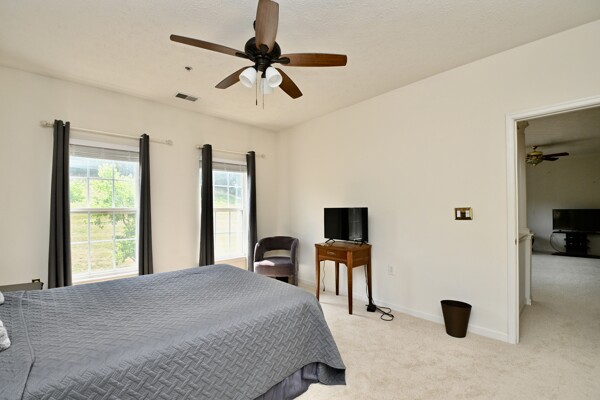 This beautiful home features an open floor plan, kitchen with island seating, crown molding, new carpet, ample closet space, and a balcony that offers privacy and a view of the woods.