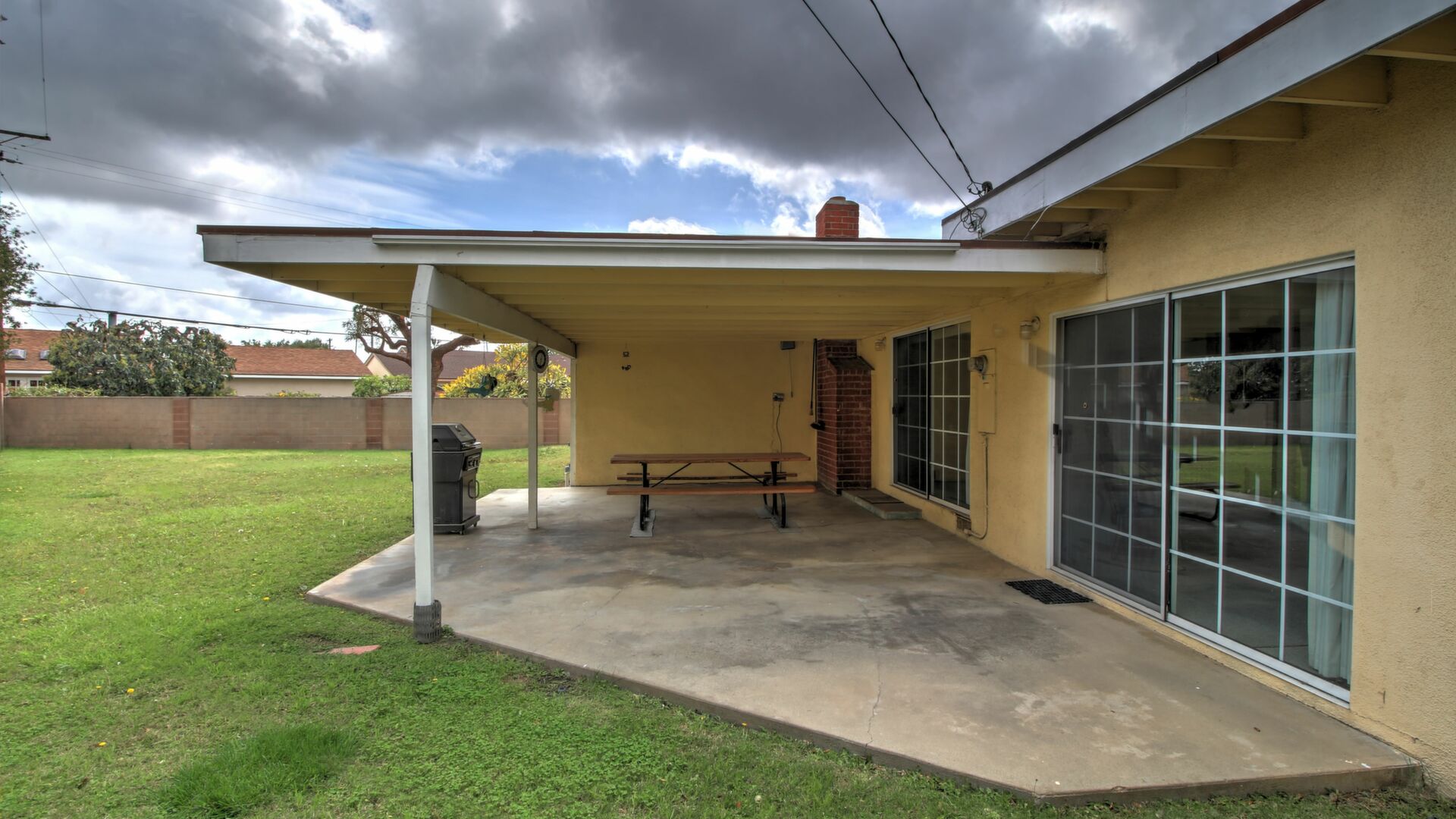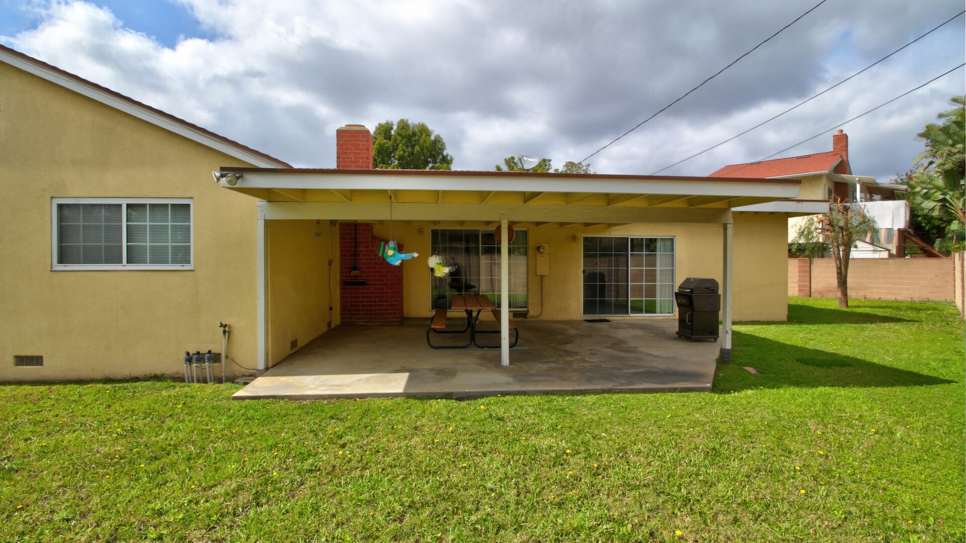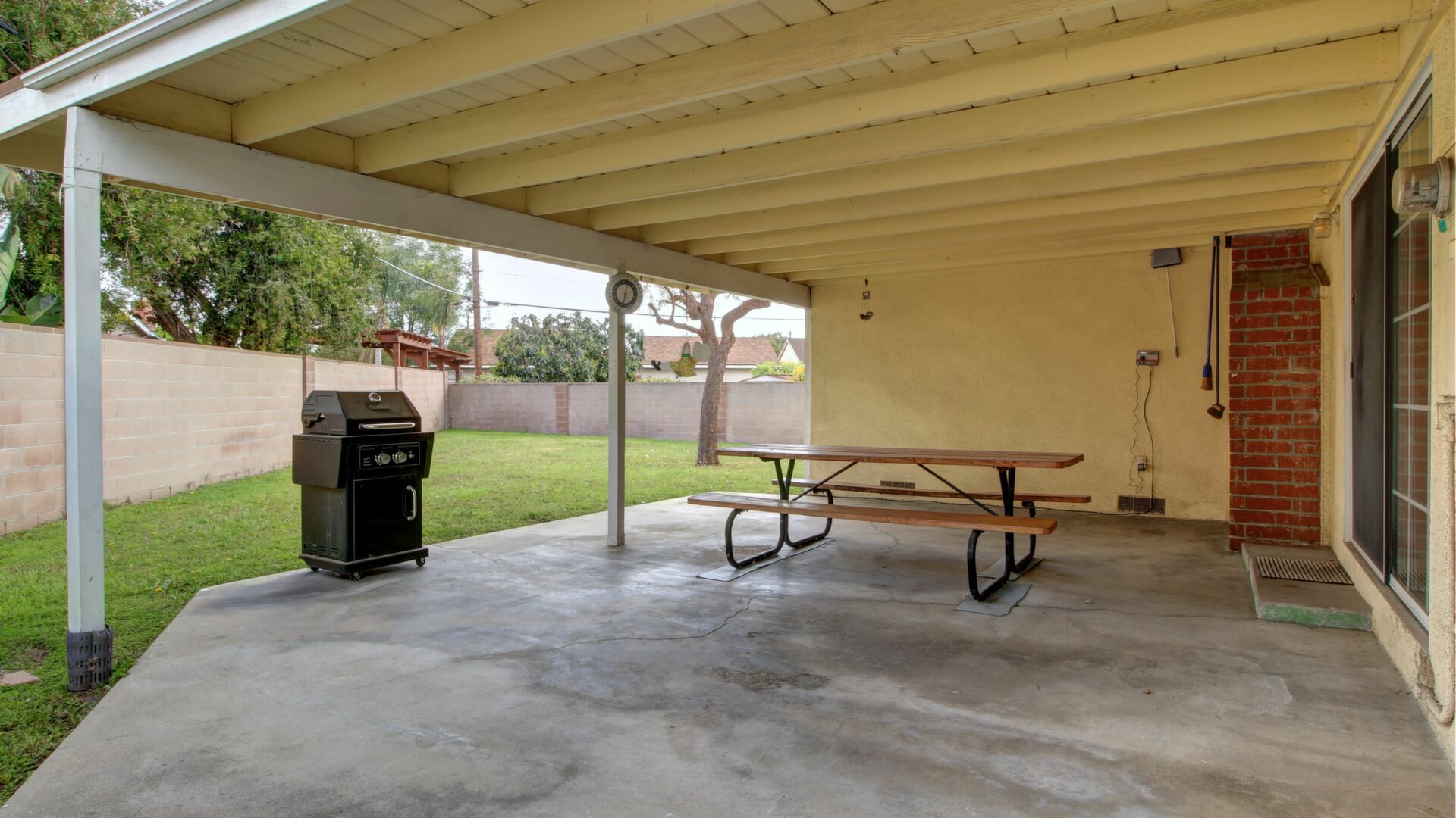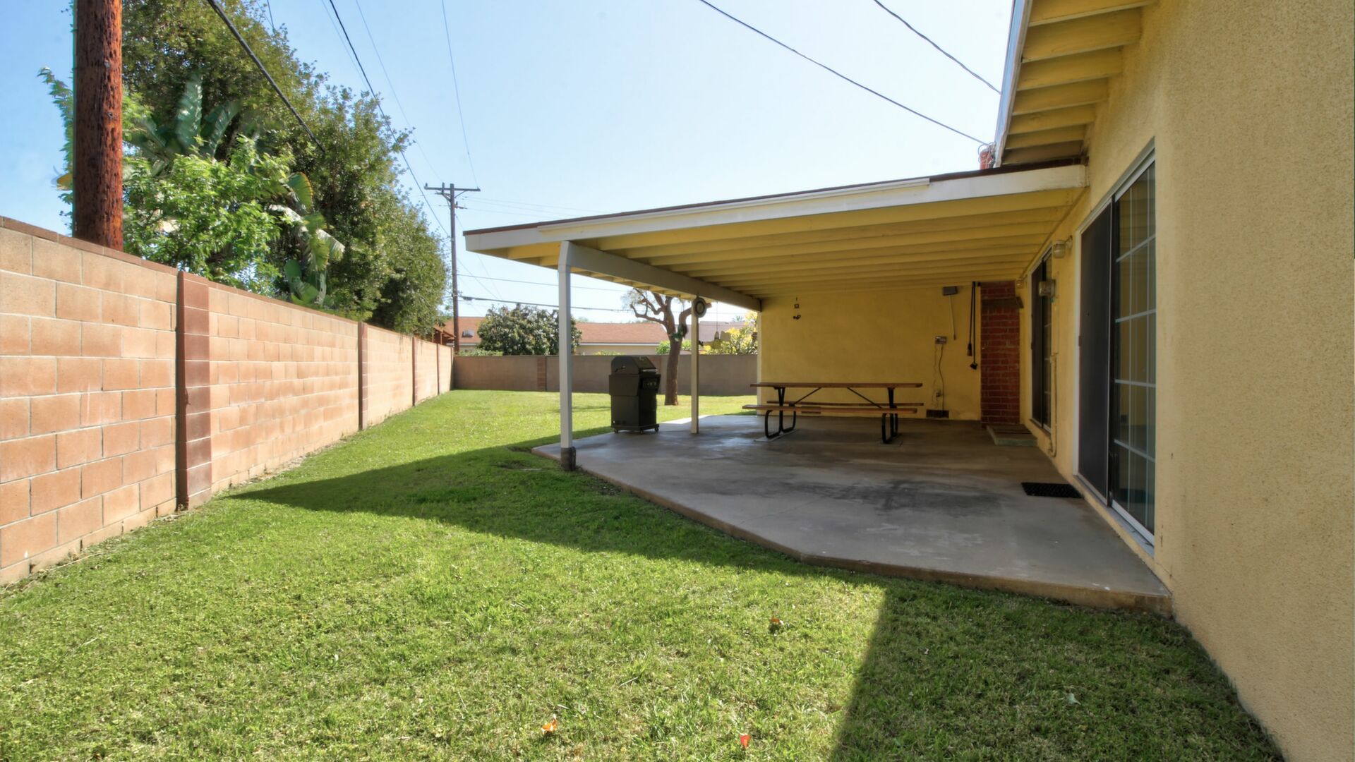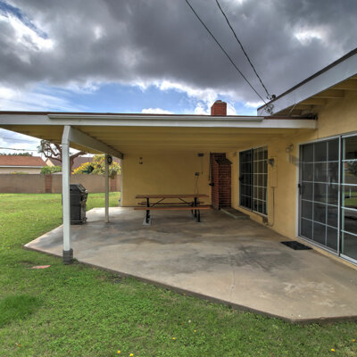 There are two concrete patios. The main patio is a large, covered area that is easily accessible from the great room and the dining area. The other patio is well separated and located in the secondary backyard.
