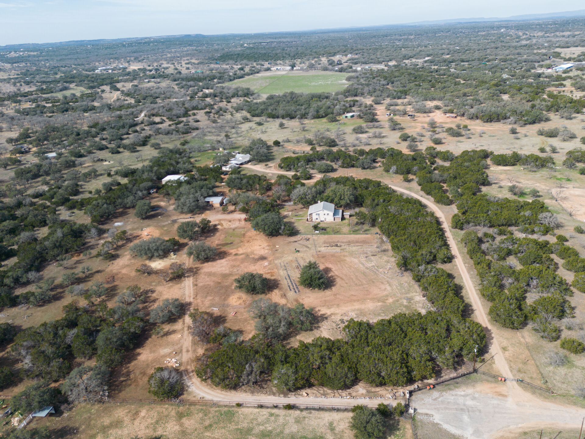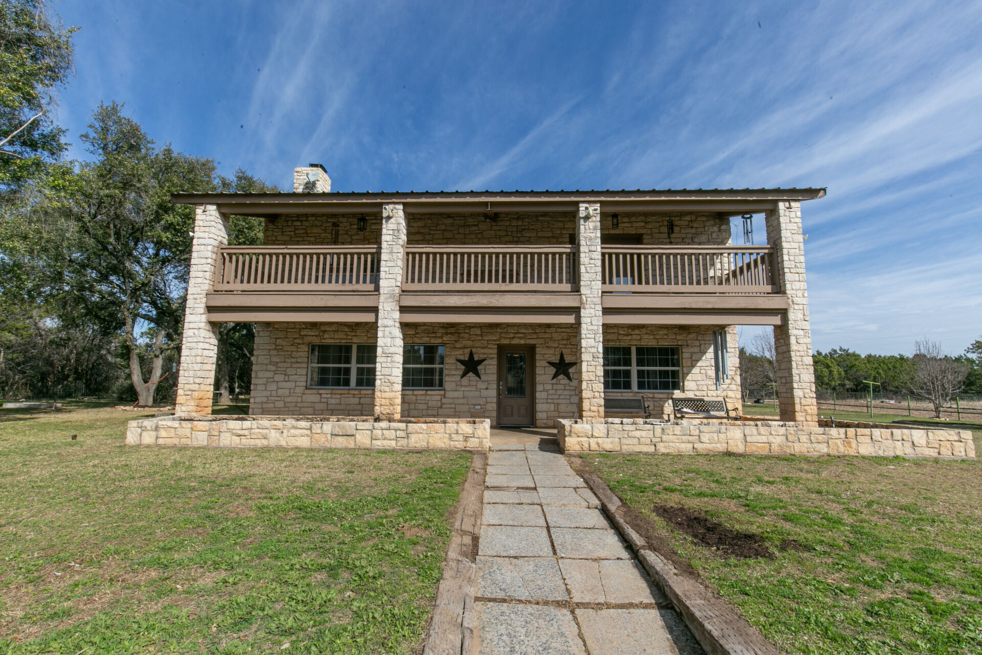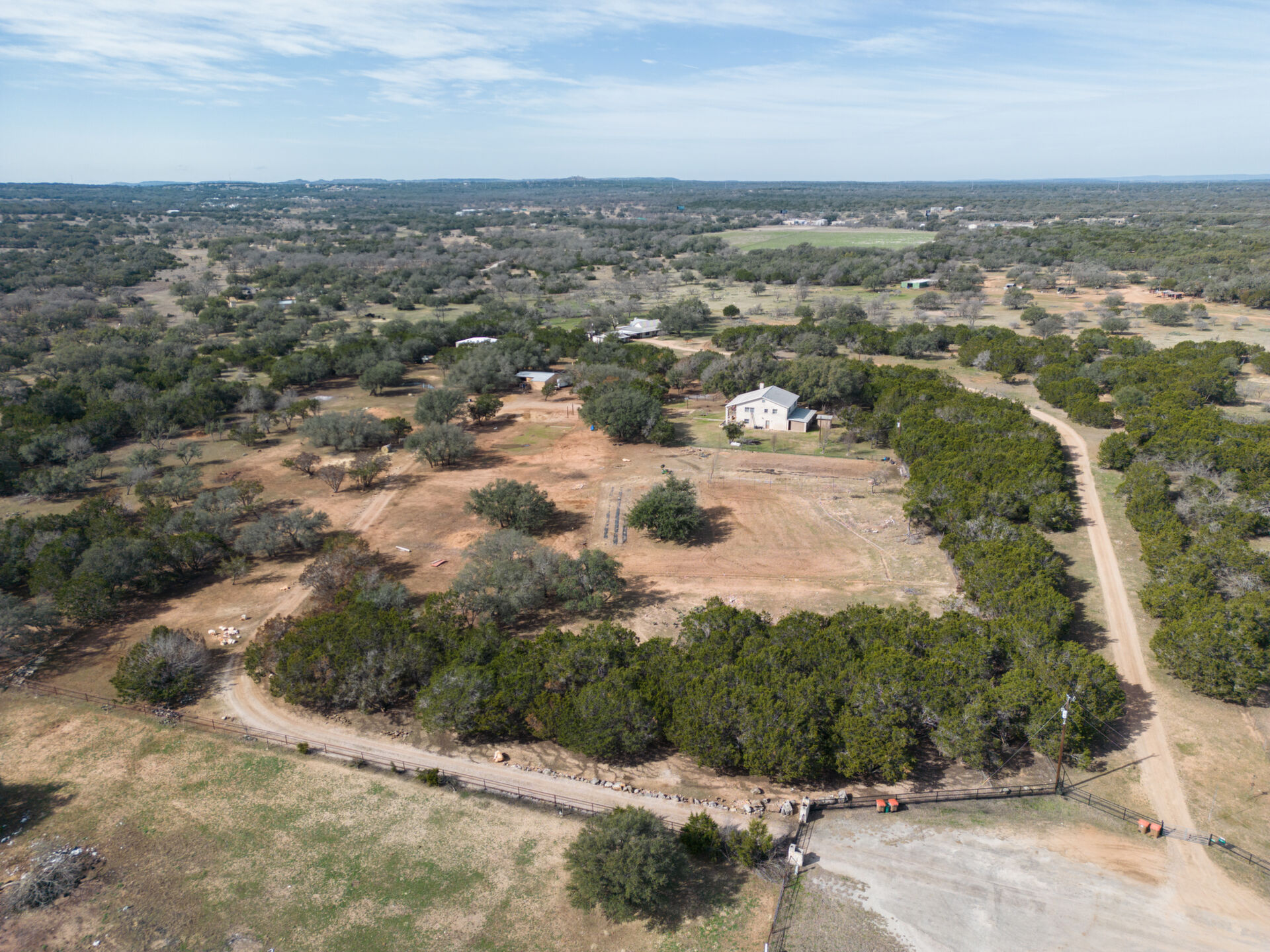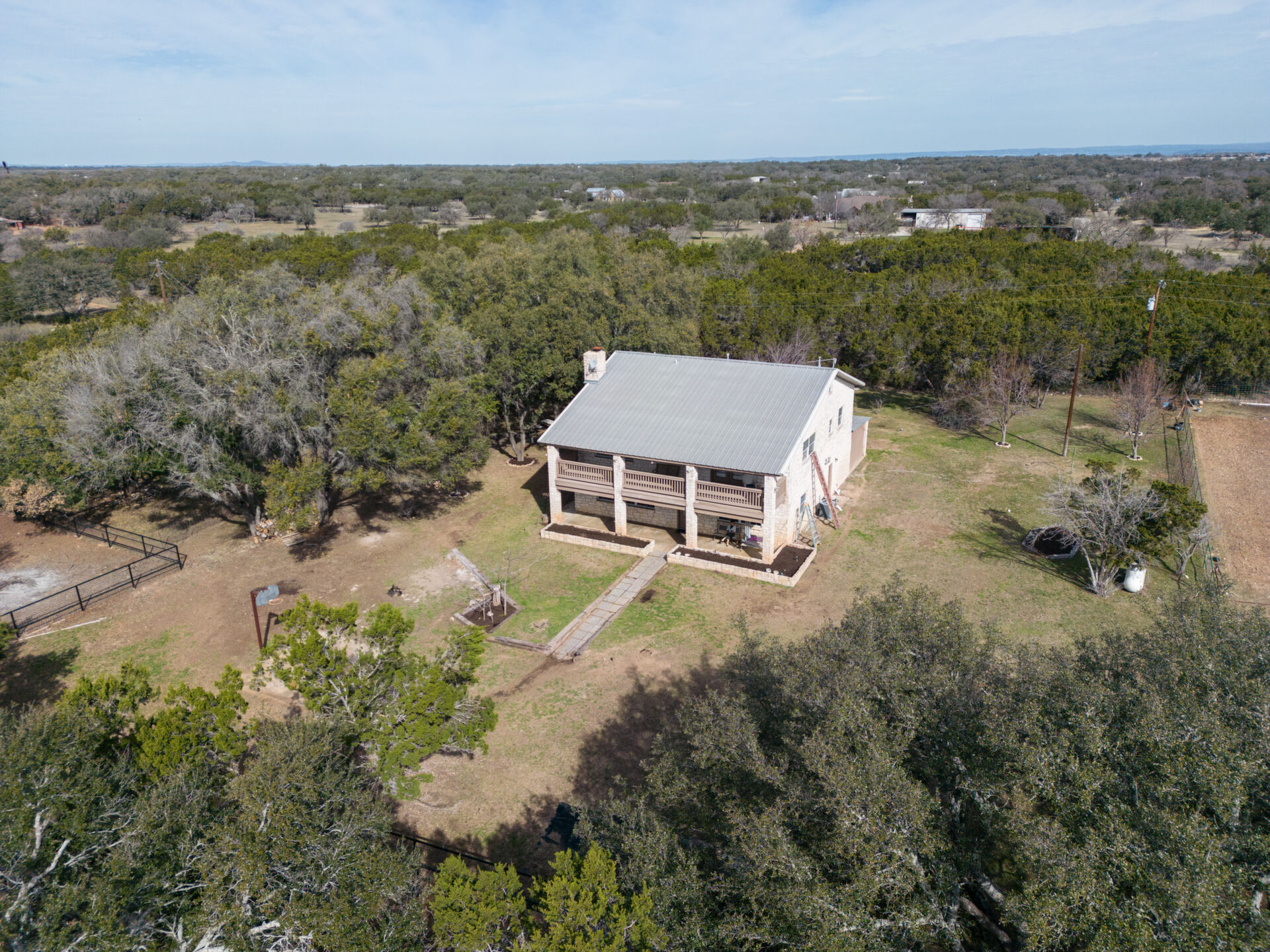 Hill Country ranchette just outside the city of Marble Falls and Horseshoe Bay yet 10 minutes from Lake Marble Falls and 15 minutes from Lake LBJ. 5 bedroom 3 full bath two story home on 10 + Ag Exempt acres. If you're looking for peace, quiet and privacy this is it!Gated and fully fenced at the end of a culdsac. Located just approximately 1 mile off of Highway 281, 3 Minutes from the 281/71intersection. Offering tremendous investment potential and so many possibilities! With an abundance of natural light, huge fireplace with cedar mantle and fans to distribute heat, large utility room, new flooring and paint. Steel construction. Upstairs Primary Bedroom with double doors leading to 320 square foot deck, full of natural beauty and a private hill country view cedar closet and private primary bathroom. 3 spacious guest bedrooms upstairs and 1 bedroom/office downstairs. Large attic with possibility to finish out for additional-living space. Beautiful property to raise a family and bring the livestock, raise some chickens or have a garden. Conveniently located only45 minutes from Austin and San Antonio and centrally located to entertainment, shopping, and eateries in Marble Falls, Horseshoe Bay,Johnson City, Fredericksburg, and Spicewood.