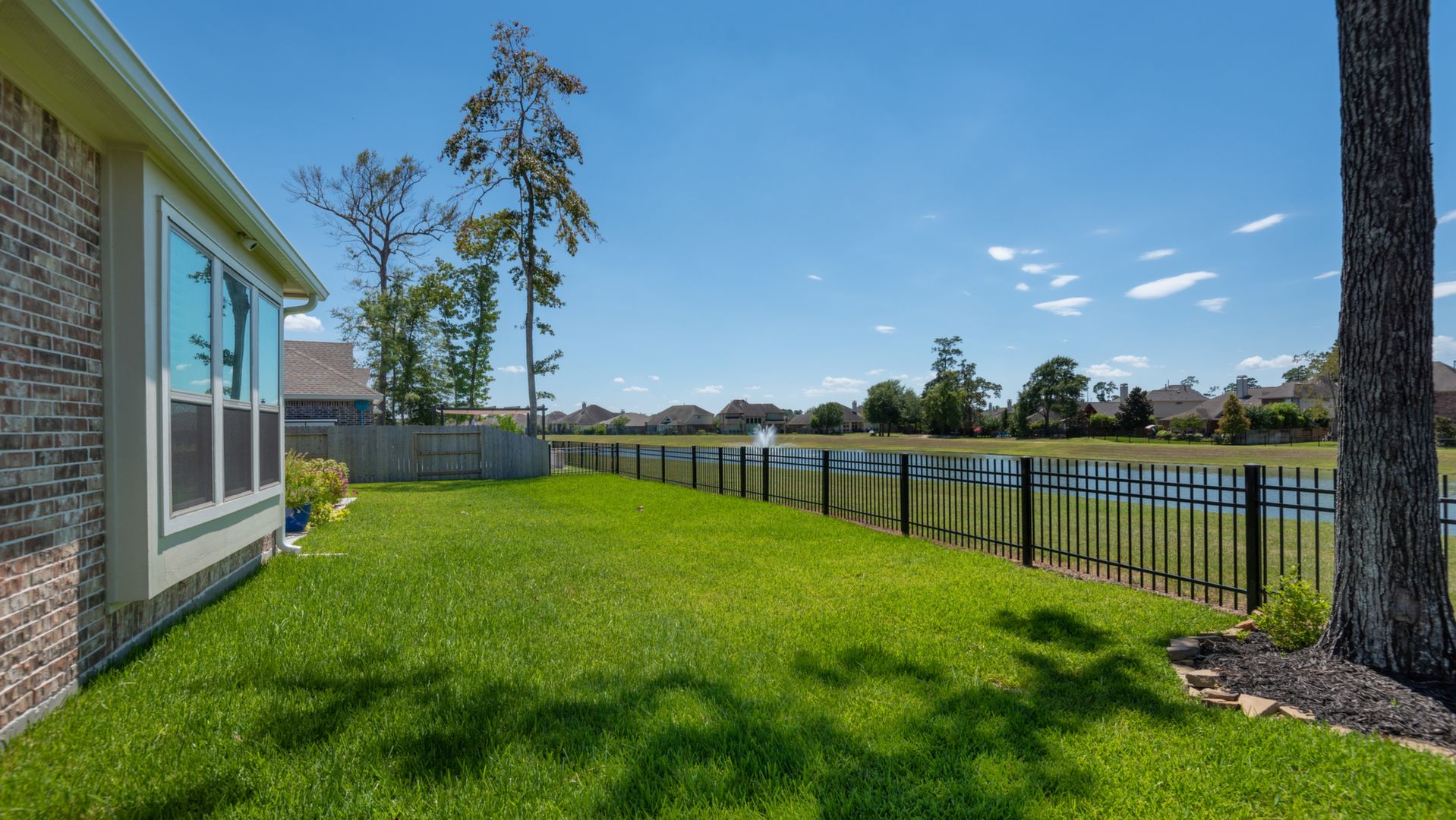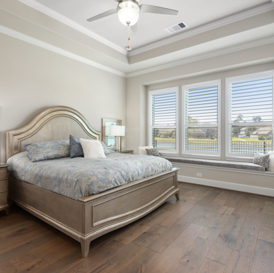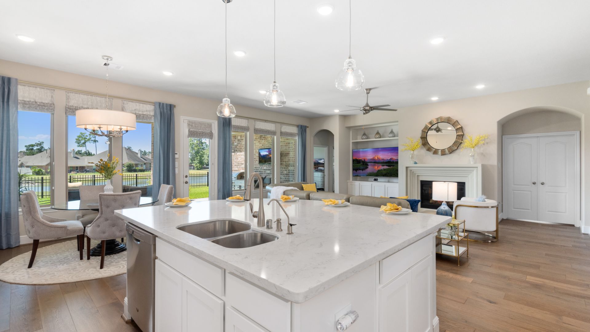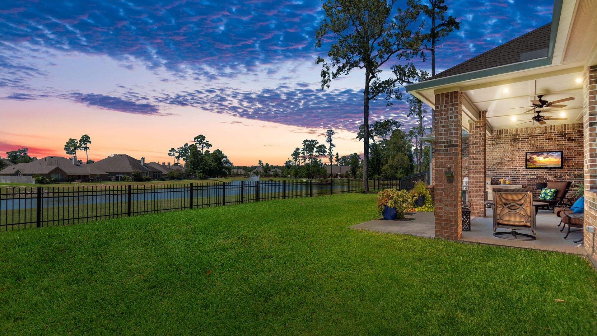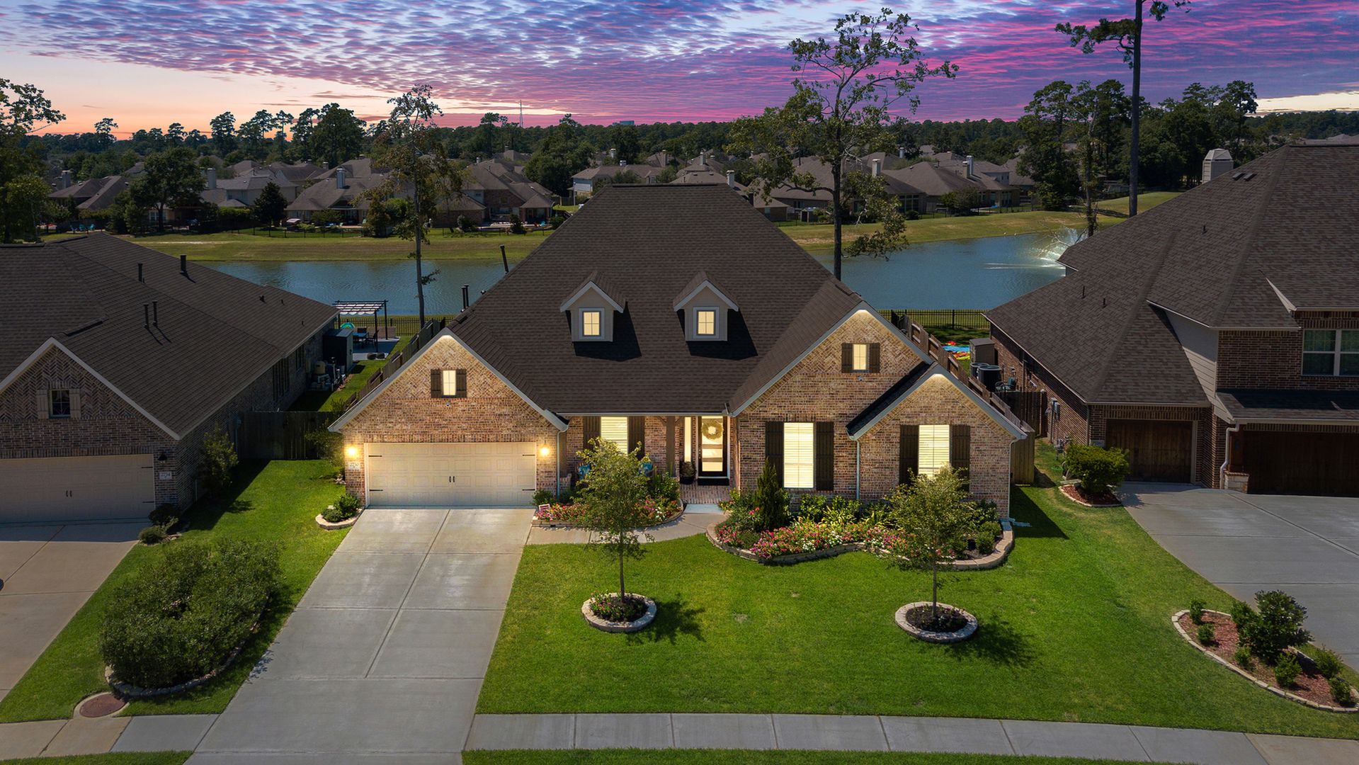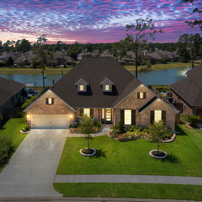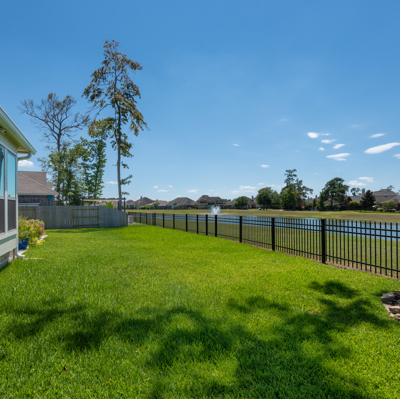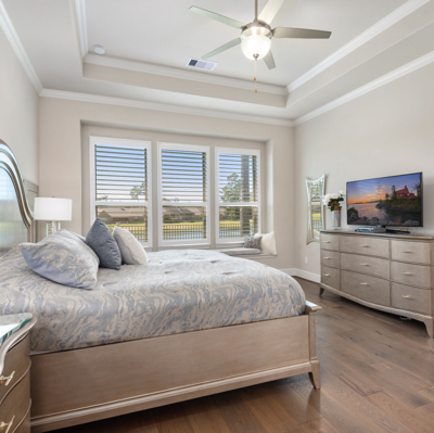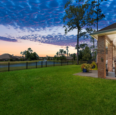 THE WATERFRONT VIEWS & THE SUNSETS ARE A MUST SEE! This stunning 1 story RIVALS NEW CONSTRUCTION, is LOADED WITH UPGRADES & is located in a PRIVATE EXCLUSIVE GATED NEIGHBORHOOD. Great function & flow, open floor plan with grand entry, dramatic rotunda; walls of windows; great storage; plantations shutters; upgraded lighting; built ins; light neutral paint; engineered hardwoods; tray ceilings; crown molding; double French doors into study; open concept kitchen w/quartz counters, stainless appliances, island w/bar seating, painted cabinets, butler's pantry & breakfast area. Private master + spa-like ensuite with dual vanities, frameless shower, soaking tub. Bedroom #2 is a true guest suite with its own bath. GAME ROOM (a RARE FIND in a 1 story). Covered extended patio. Sprinklers, gutters (half w/leaf guard system) & WHOLE HOUSE GENERATOR. Amenities: pools, splash pad, playground, pavilion, rec center, fishing dock & walking trails. A+ rated schools. STILL COVERED BY BUILDER'S WARRANTY.