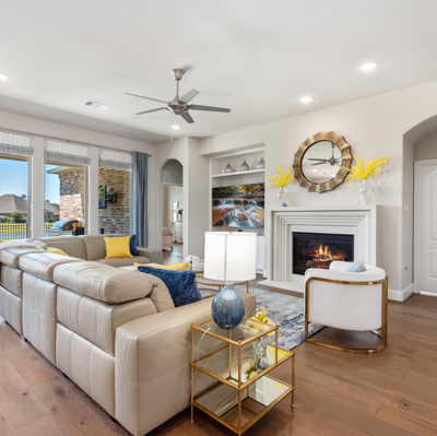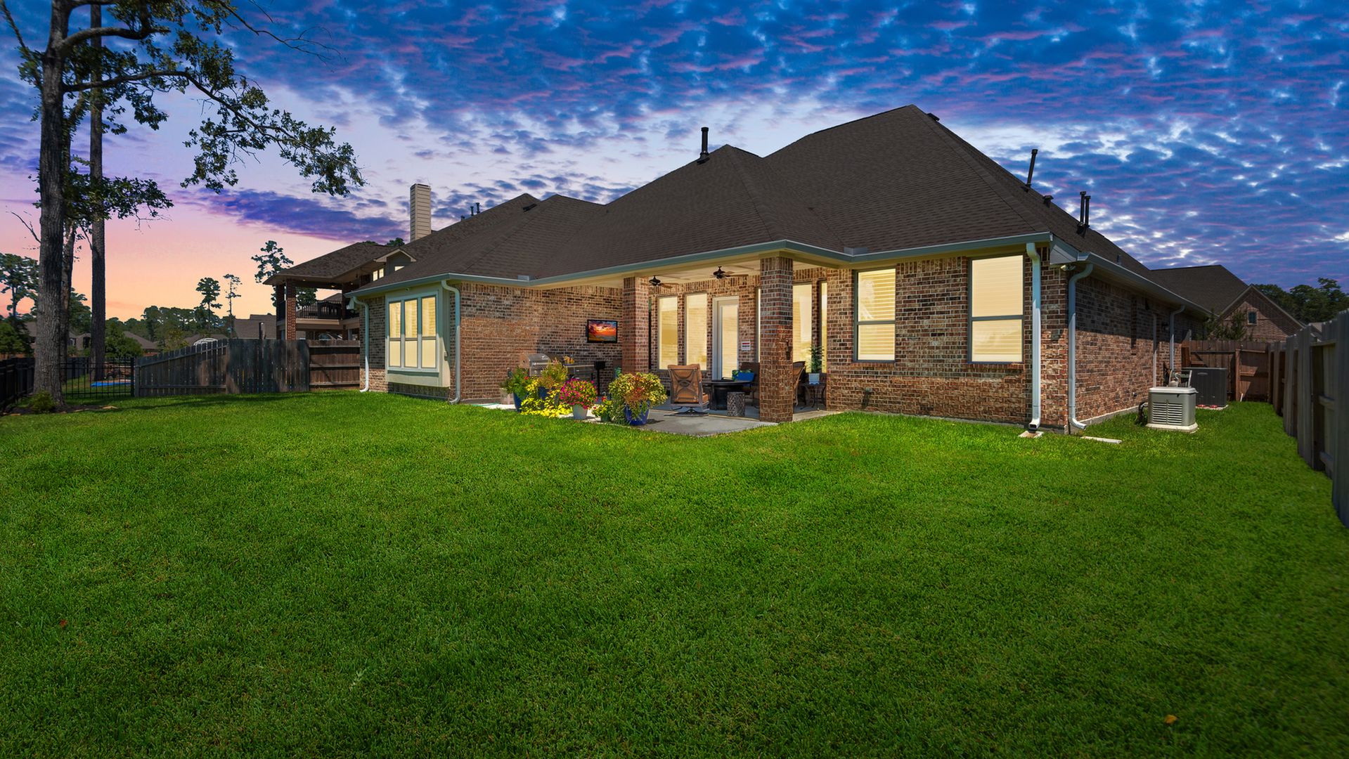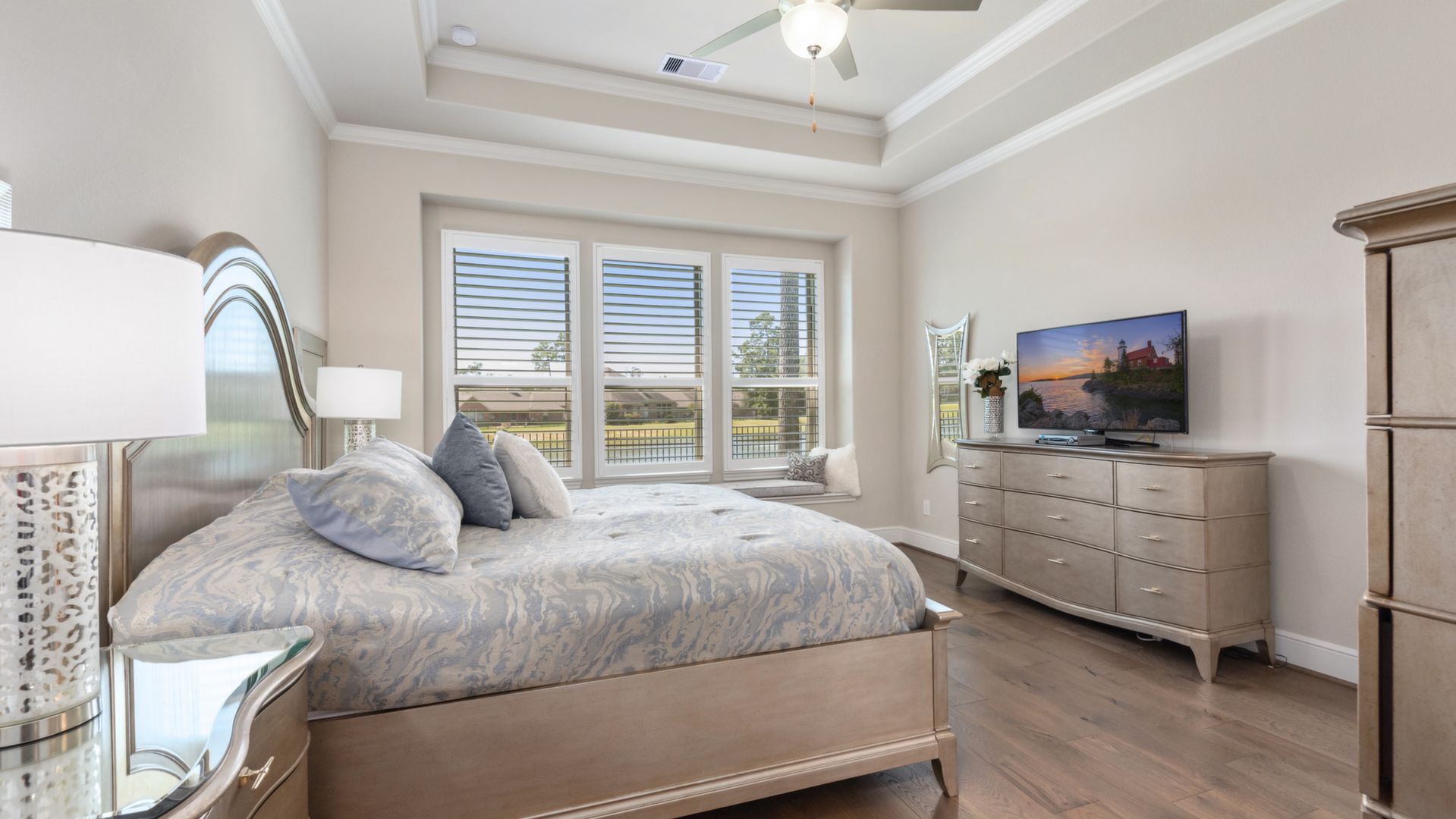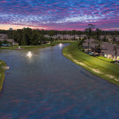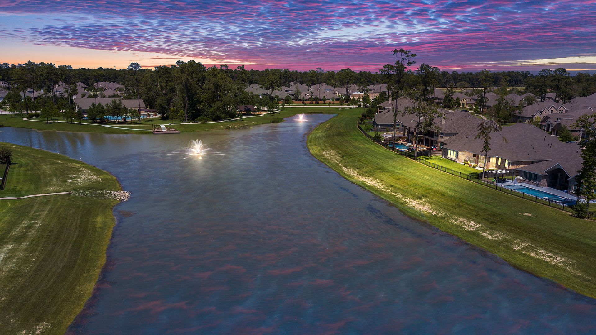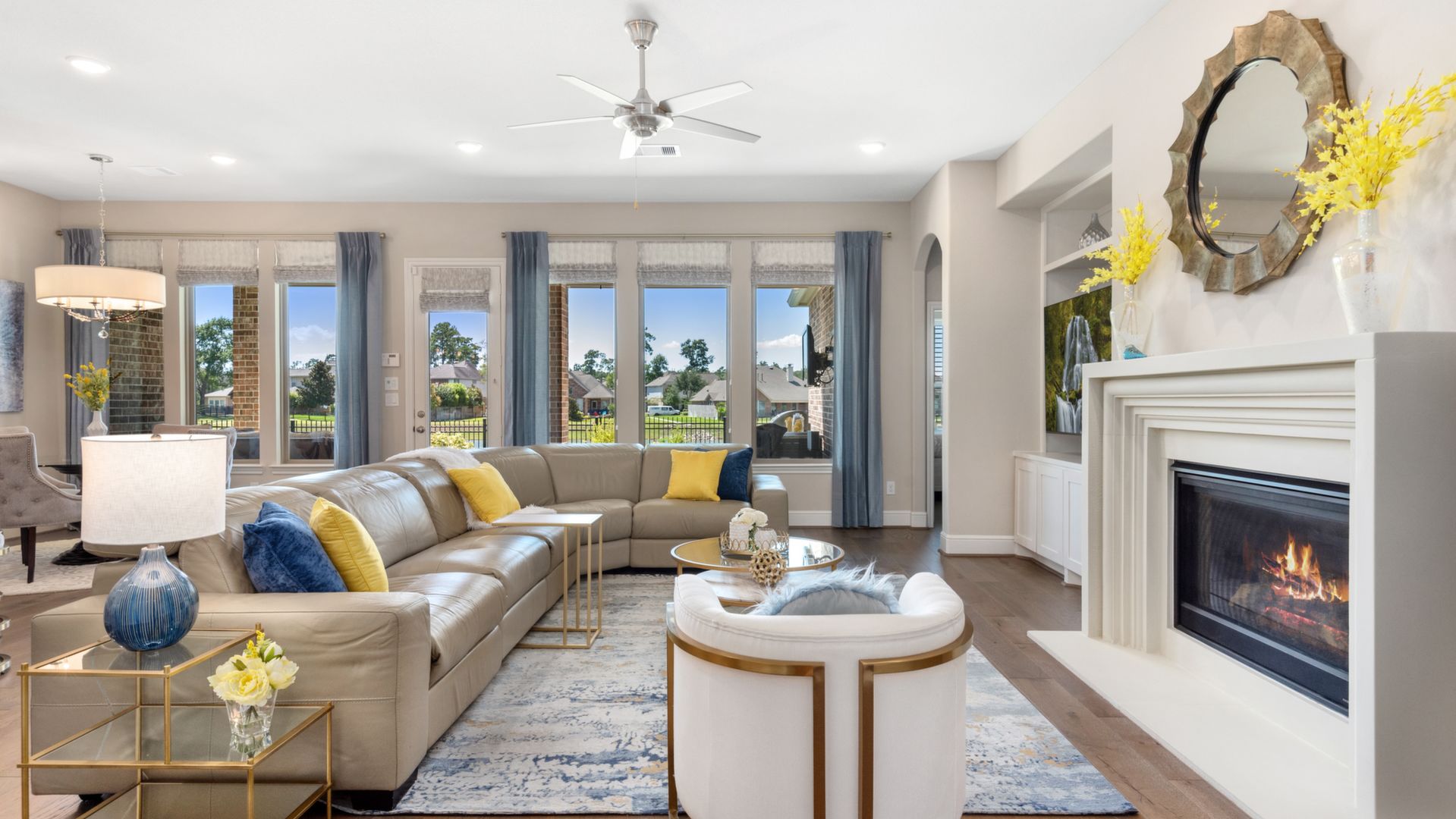 THE WATERFRONT VIEWS & THE SUNSETS ARE A MUST SEE! This stunning 1 story RIVALS NEW CONSTRUCTION, is LOADED WITH UPGRADES & is located in a PRIVATE EXCLUSIVE GATED NEIGHBORHOOD. Great function & flow, open floor plan with grand entry, dramatic rotunda; walls of windows; great storage; plantations shutters; upgraded lighting; built ins; light neutral paint; engineered hardwoods; tray ceilings; crown molding; double French doors into study; open concept kitchen w/quartz counters, stainless appliances, island w/bar seating, painted cabinets, butler's pantry & breakfast area. Private master + spa-like ensuite with dual vanities, frameless shower, soaking tub. Bedroom #2 is a true guest suite with its own bath. GAME ROOM (a RARE FIND in a 1 story). Covered extended patio. Sprinklers, gutters (half w/leaf guard system) & WHOLE HOUSE GENERATOR. Amenities: pools, splash pad, playground, pavilion, rec center, fishing dock & walking trails. A+ rated schools. STILL COVERED BY BUILDER'S WARRANTY.