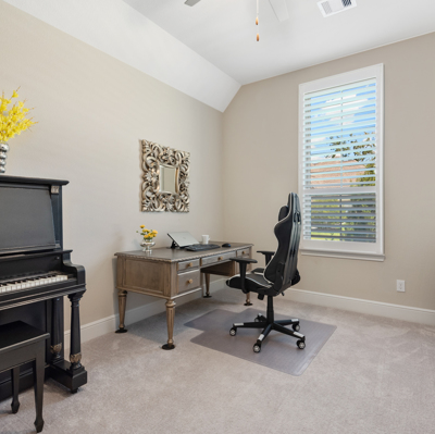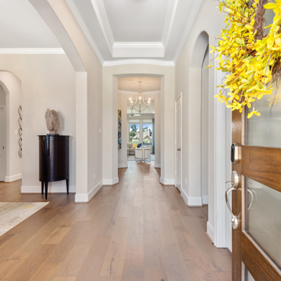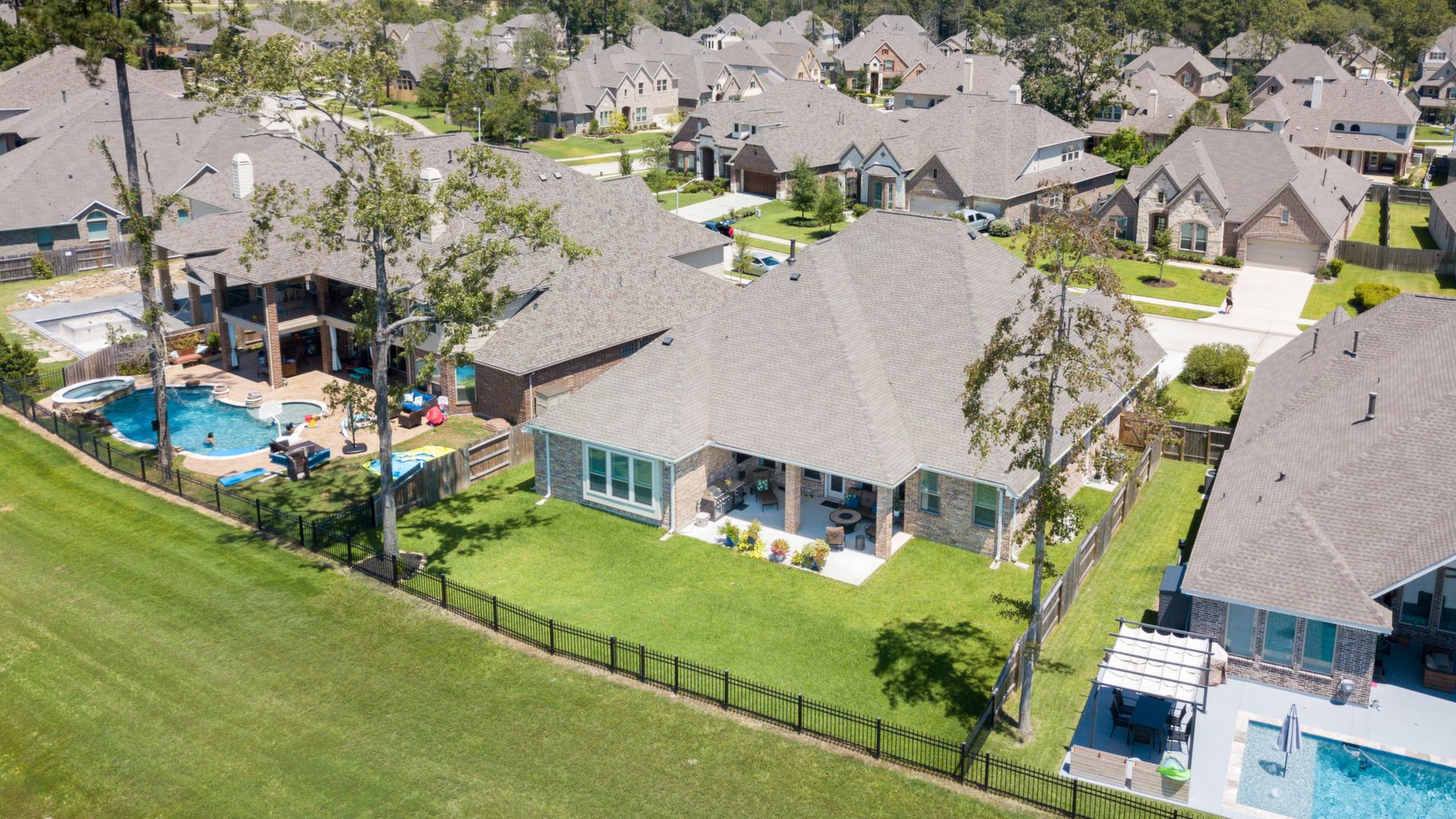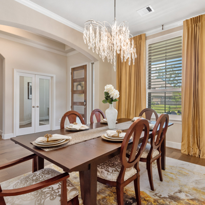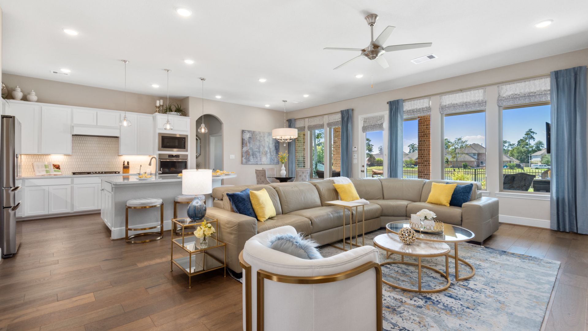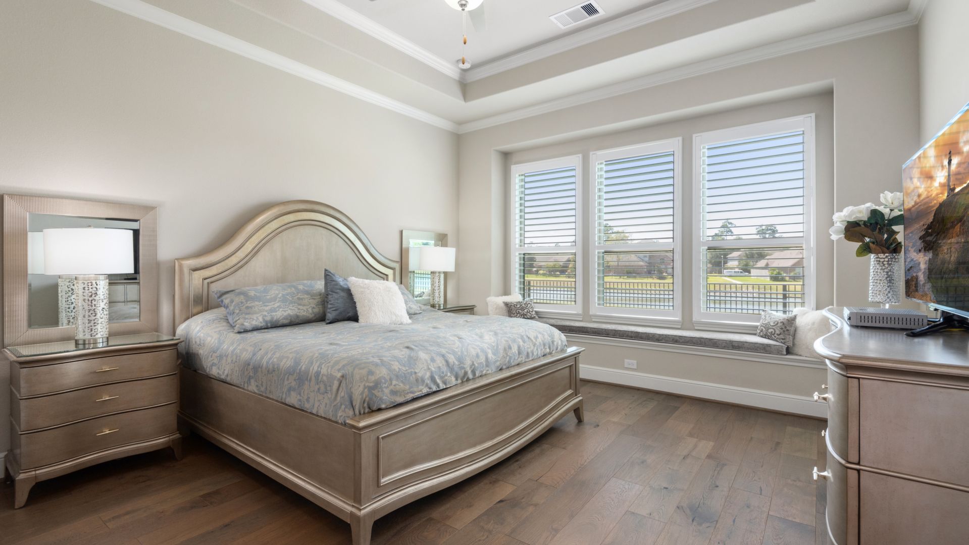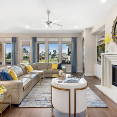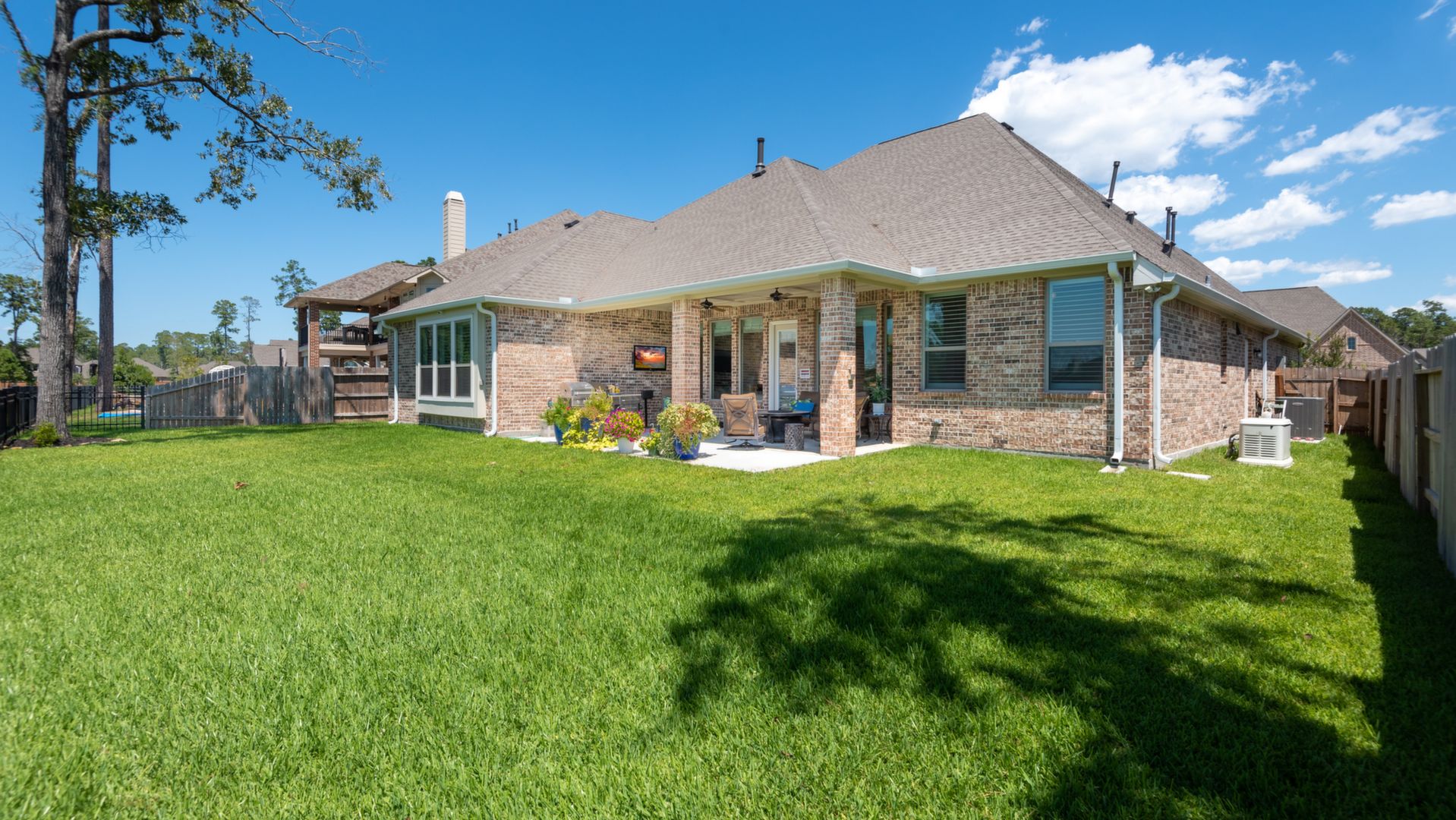 THE WATERFRONT VIEWS & THE SUNSETS ARE A MUST SEE! This stunning 1 story RIVALS NEW CONSTRUCTION, is LOADED WITH UPGRADES & is located in a PRIVATE EXCLUSIVE GATED NEIGHBORHOOD. Great function & flow, open floor plan with grand entry, dramatic rotunda; walls of windows; great storage; plantations shutters; upgraded lighting; built ins; light neutral paint; engineered hardwoods; tray ceilings; crown molding; double French doors into study; open concept kitchen w/quartz counters, stainless appliances, island w/bar seating, painted cabinets, butler's pantry & breakfast area. Private master + spa-like ensuite with dual vanities, frameless shower, soaking tub. Bedroom #2 is a true guest suite with its own bath. GAME ROOM (a RARE FIND in a 1 story). Covered extended patio. Sprinklers, gutters (half w/leaf guard system) & WHOLE HOUSE GENERATOR. Amenities: pools, splash pad, playground, pavilion, rec center, fishing dock & walking trails. A+ rated schools. STILL COVERED BY BUILDER'S WARRANTY.