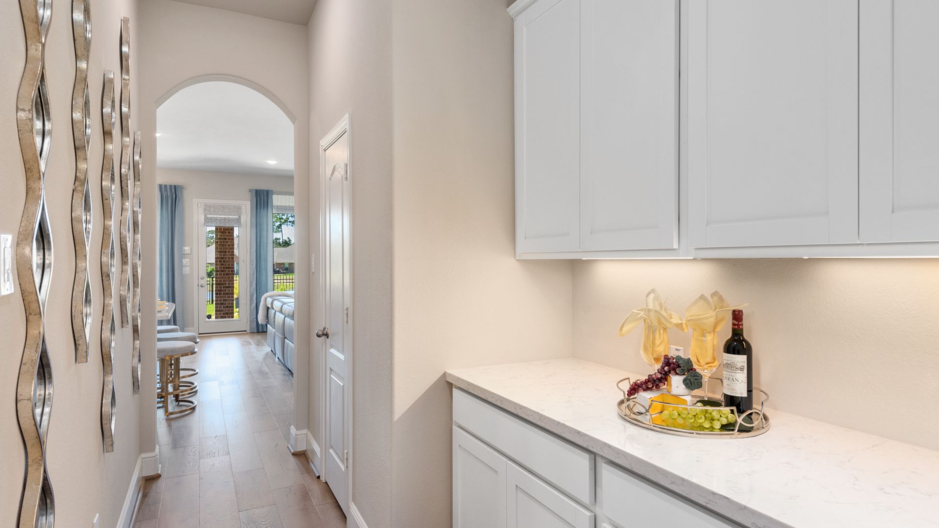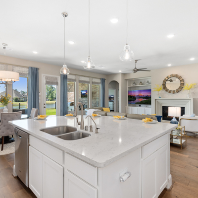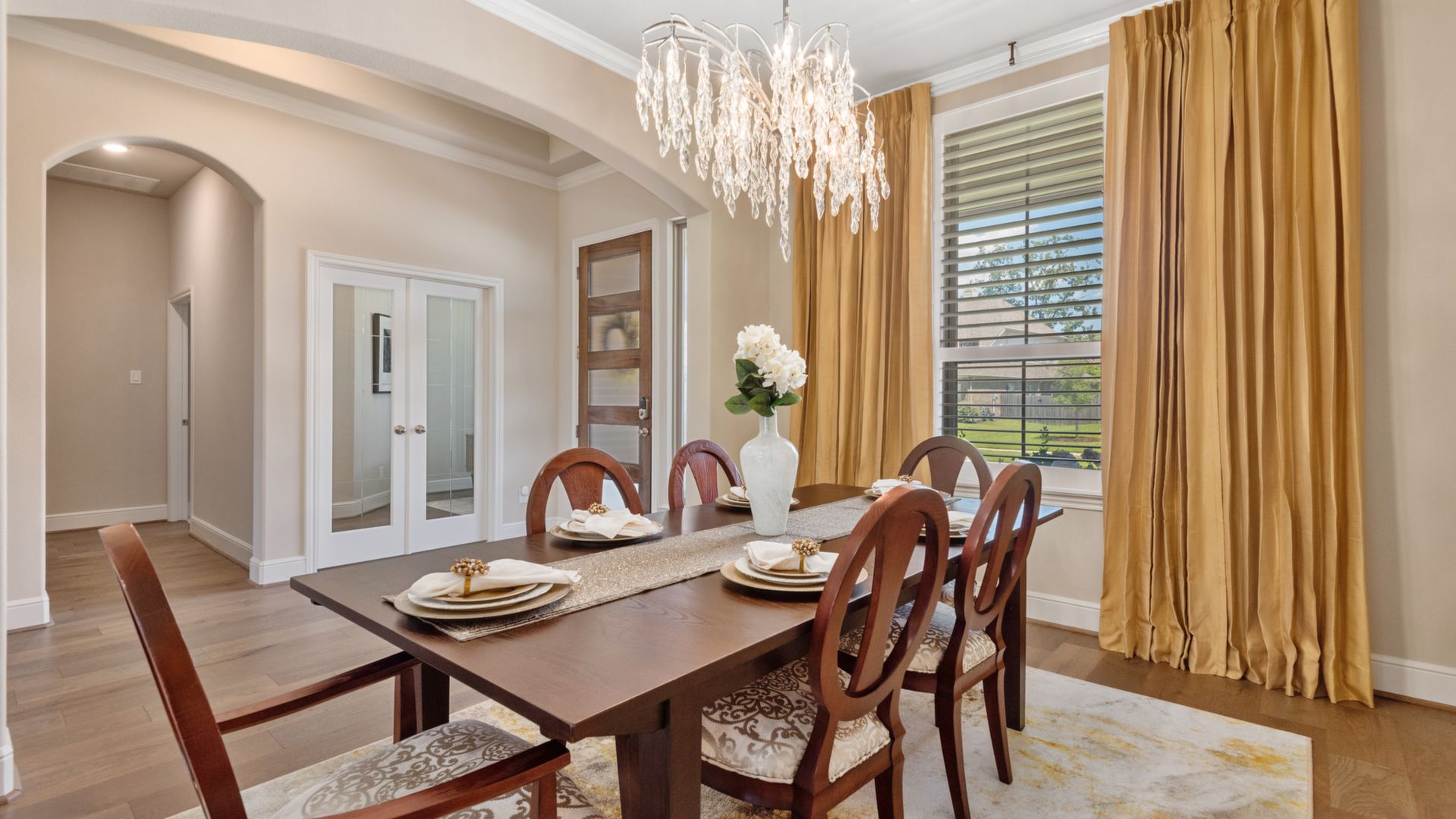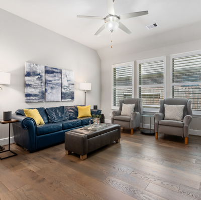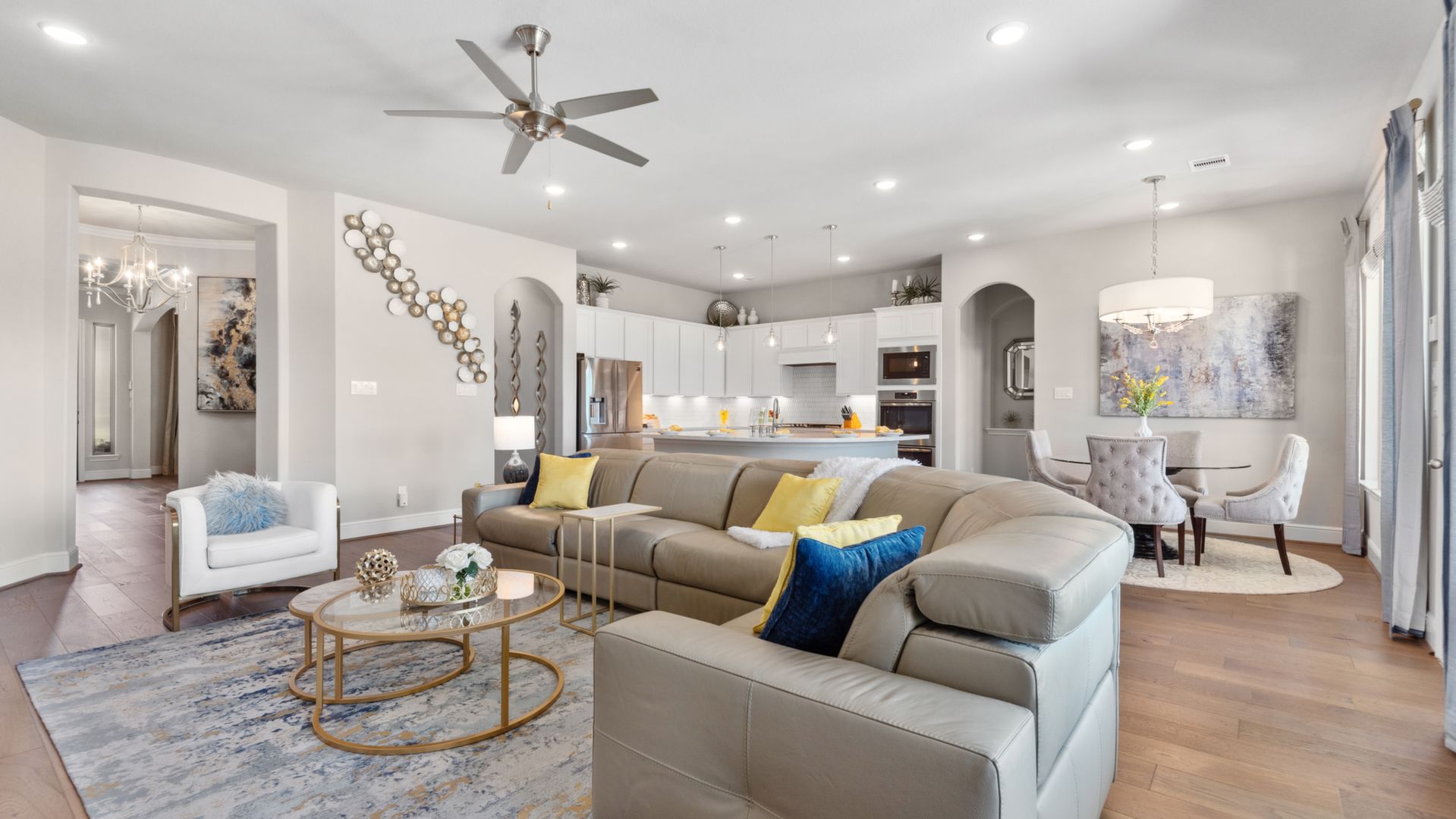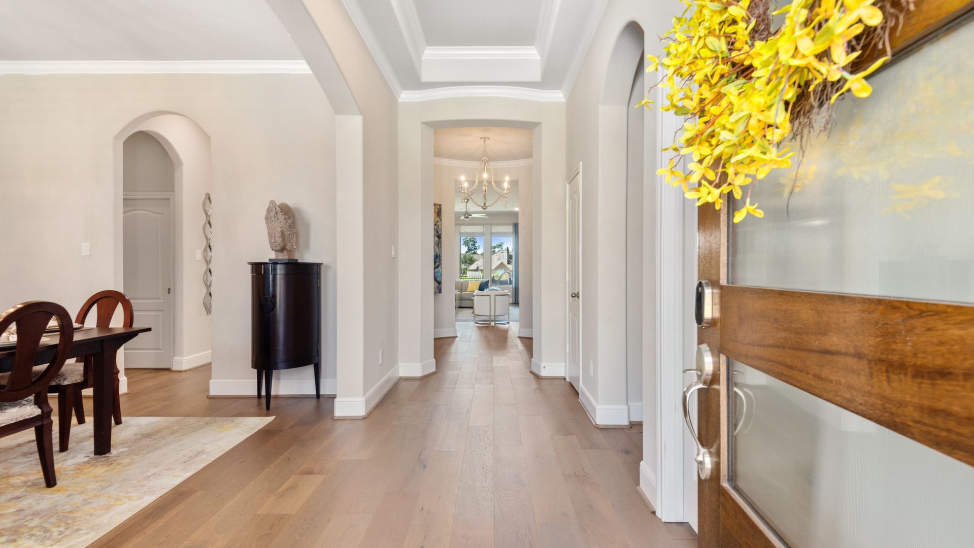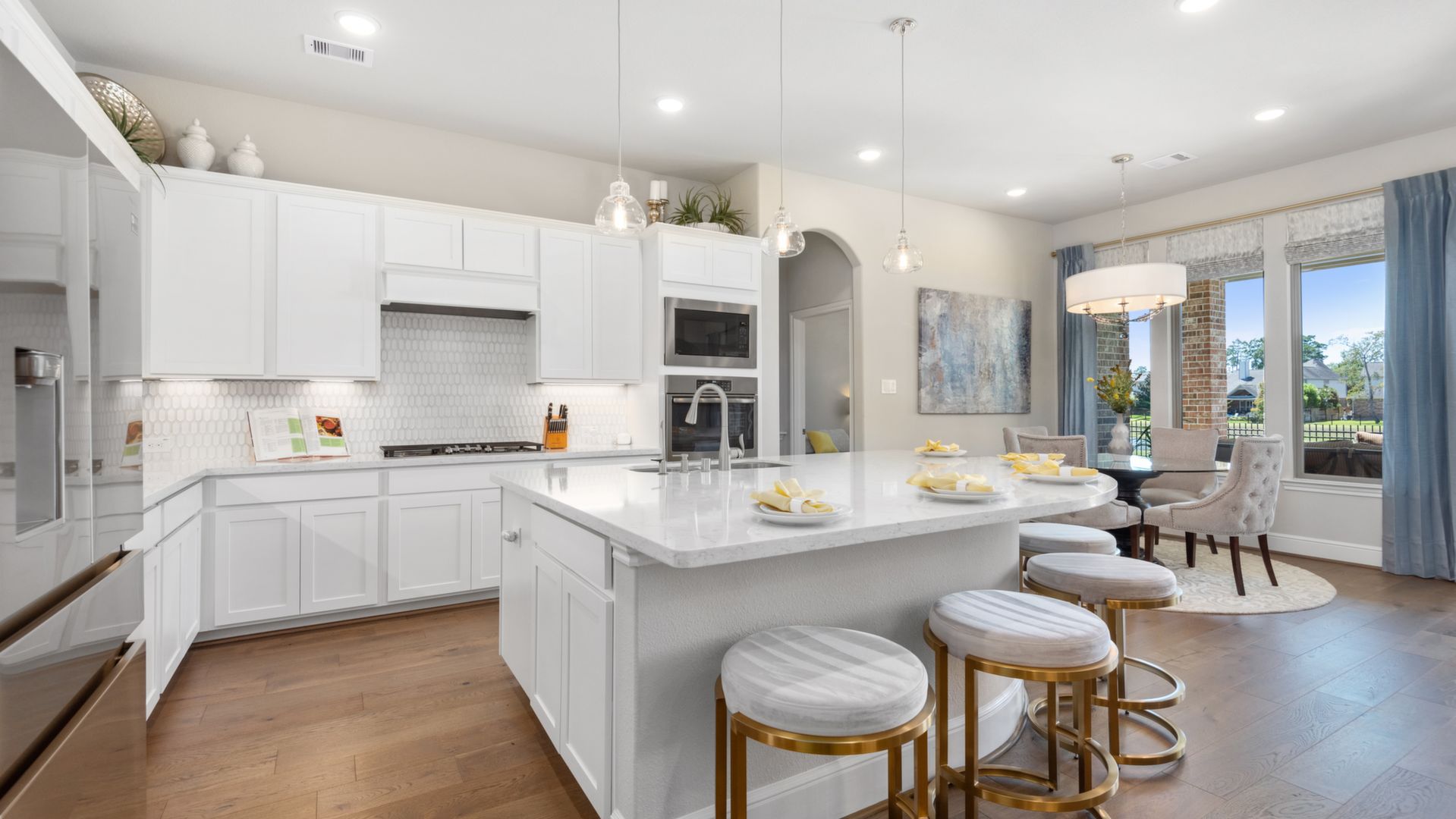 THE WATERFRONT VIEWS & THE SUNSETS ARE A MUST SEE! This stunning 1 story RIVALS NEW CONSTRUCTION, is LOADED WITH UPGRADES & is located in a PRIVATE EXCLUSIVE GATED NEIGHBORHOOD. Great function & flow, open floor plan with grand entry, dramatic rotunda; walls of windows; great storage; plantations shutters; upgraded lighting; built ins; light neutral paint; engineered hardwoods; tray ceilings; crown molding; double French doors into study; open concept kitchen w/quartz counters, stainless appliances, island w/bar seating, painted cabinets, butler's pantry & breakfast area. Private master + spa-like ensuite with dual vanities, frameless shower, soaking tub. Bedroom #2 is a true guest suite with its own bath. GAME ROOM (a RARE FIND in a 1 story). Covered extended patio. Sprinklers, gutters (half w/leaf guard system) & WHOLE HOUSE GENERATOR. Amenities: pools, splash pad, playground, pavilion, rec center, fishing dock & walking trails. A+ rated schools. STILL COVERED BY BUILDER'S WARRANTY.