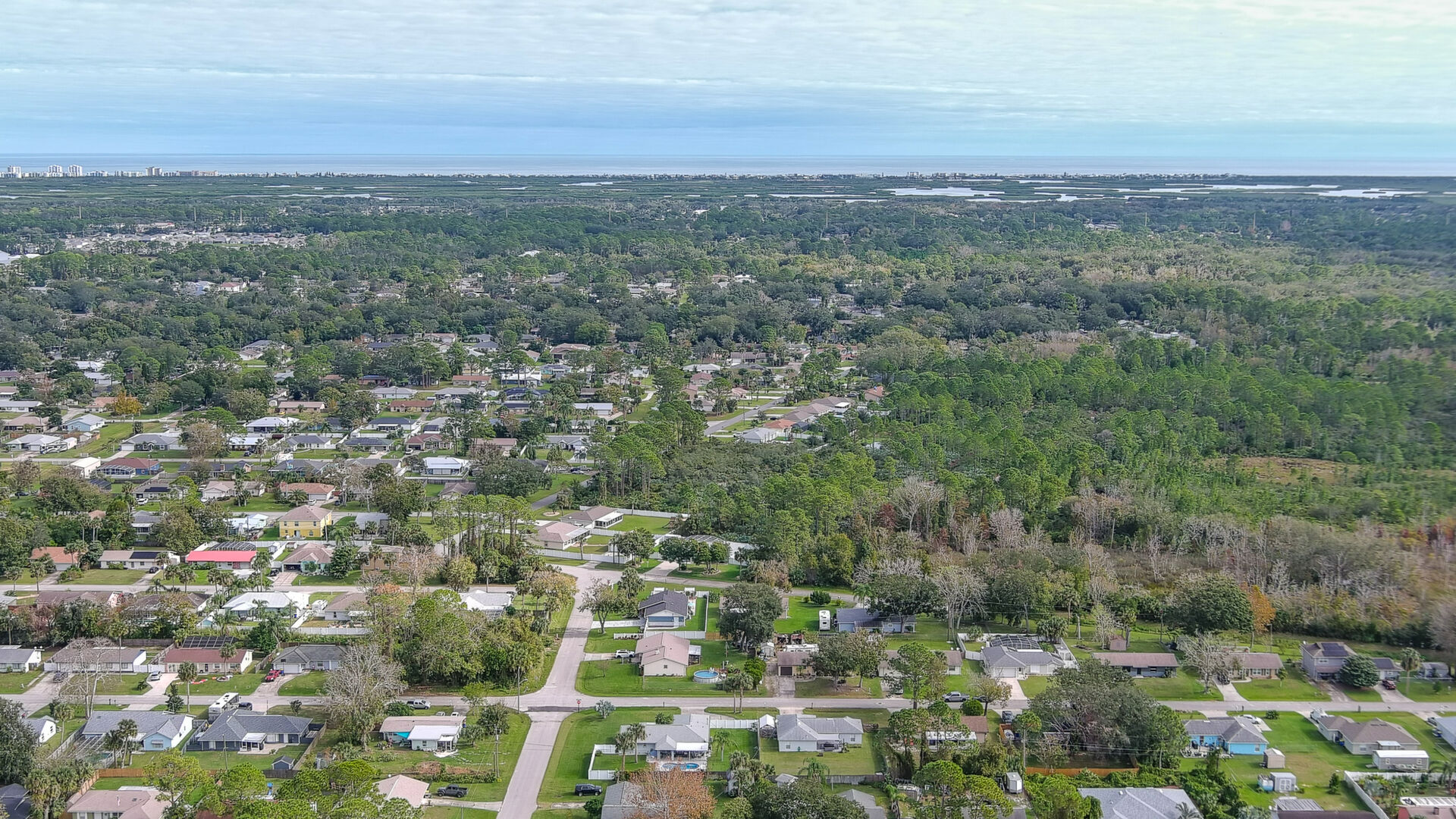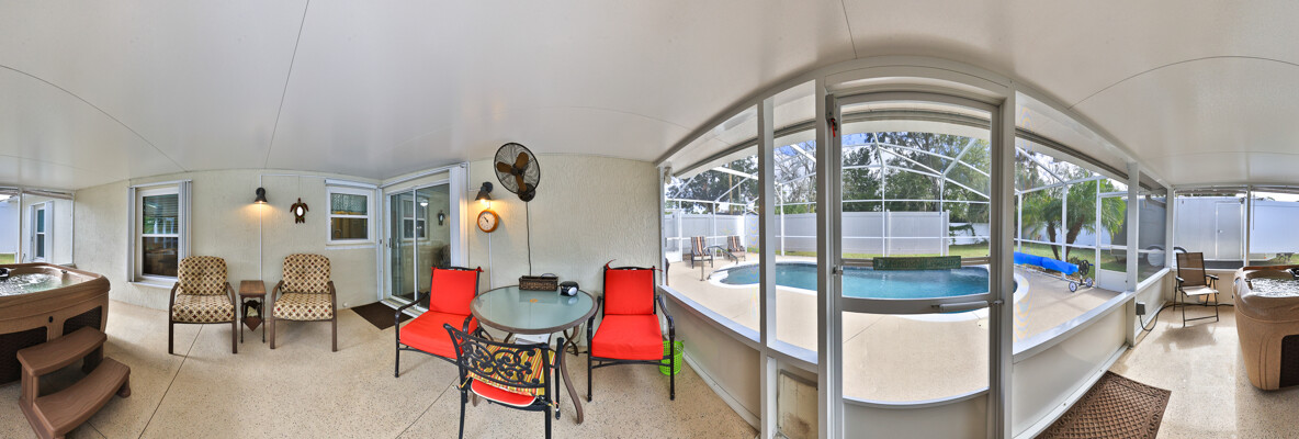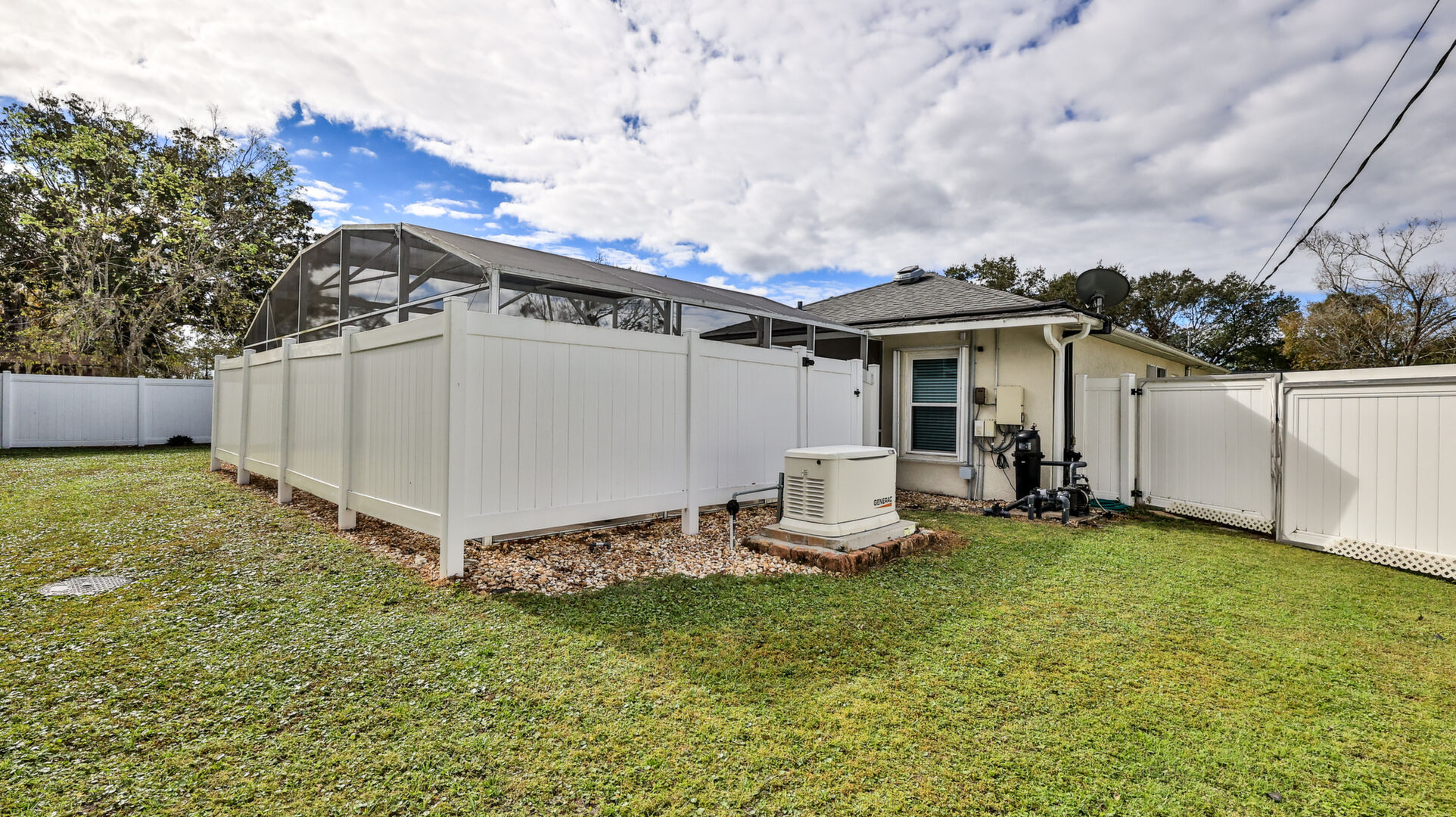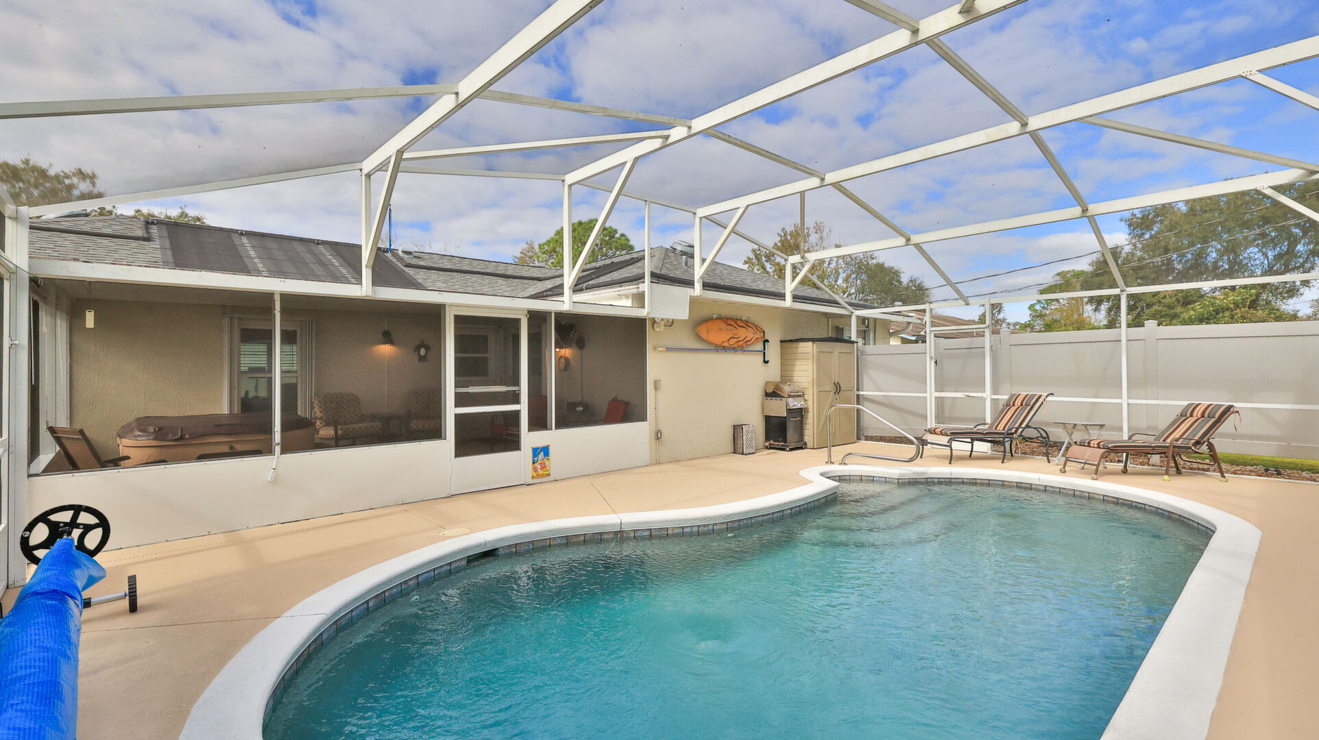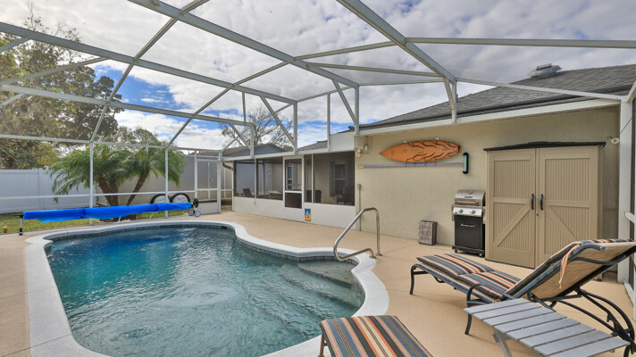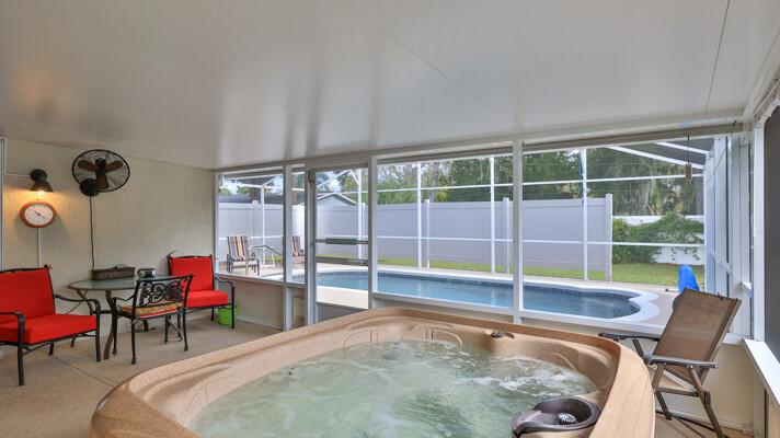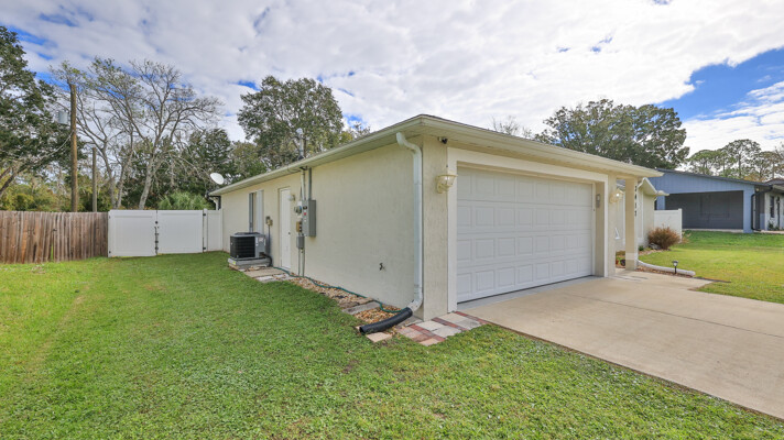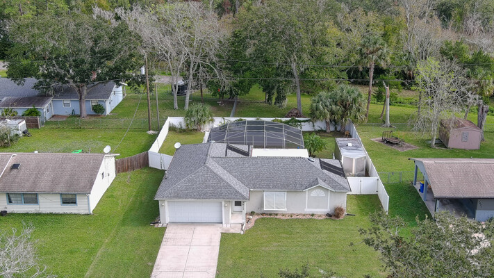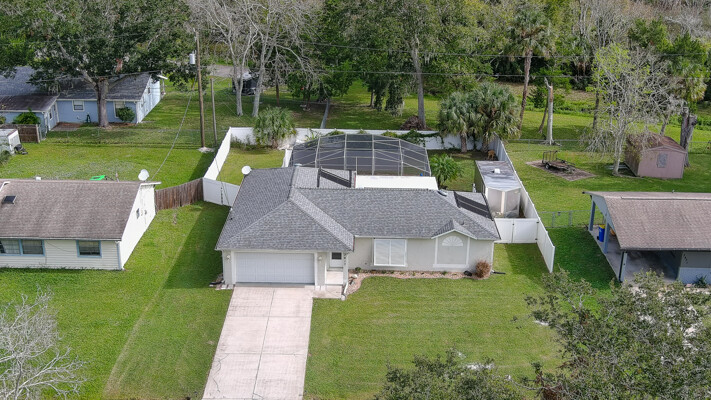 MOVE IN READY SALTWATER POOL HOME! You will love this Holiday Builders, concrete block home with 3 bedrooms, 2 baths, and 2 car garage! Well designed split plan with vaulted ceiling, ceramic tile & wood look flooring throughout. Updated kitchen with stainless steel appliances, granite countertops, pull out drawers, LED lighting, water filter, and built in pantry. Find relaxation at the outdoor oasis with a dip in the 2016 screened in pool, a soak in the hot tub, or enjoy a great book on the 14x20 covered Lanai, all surrounded with privacy fencing. Pool has solar panels for heating, pool cover, & 1 Year old salt cell. This home is storm ready, with a 2021 Entire Home 22KW Generac Generator w/Transferable Warranty, 500 Gal buried Propane Tank, 2018 Window World Storm Windows w/ Lifetime Warranty, plus Accordion Style Storm Shutters! Roof 2016, A/C & Water Heater 2024. Back Yard Fenced (2016). Washer/Dryer Included (2017). Furniture Negotiable! Garage has Epoxy flooring, Shelving & Cabinets, Attic Stairs, & Solar Ventilators. Hot Tub Included! Furniture Negotiable! Great location at the very south end of Florida Shores. Fifth house from the end of the community! Easy access to US1 from Volco Road. 5 minutes to Publix, restaurants, shopping, churches & 10 minutes to medical. 20 Minutes to beautiful New Smyrna beaches! 30 Minutes to Titusville for antique shops, local restaurants, Wildlife Refuge and 50 Minutes to the Kennedy Space Center or watch the launches from home! NO storm damage or flooding! Home is built with metal studs.