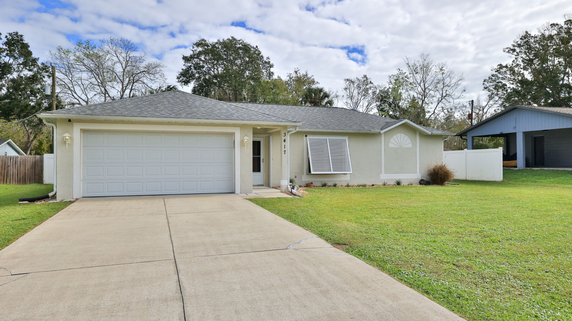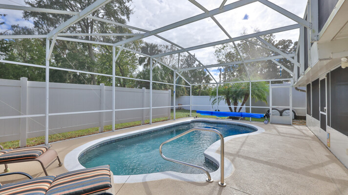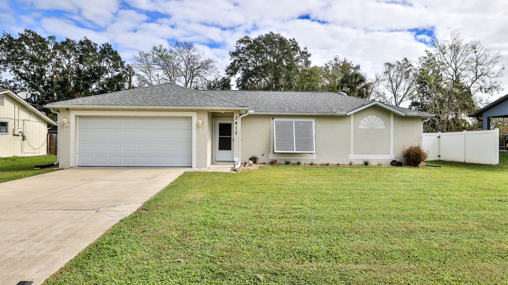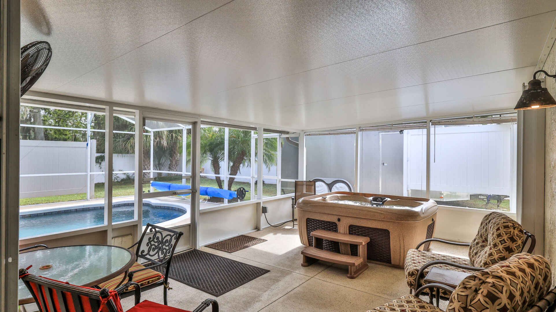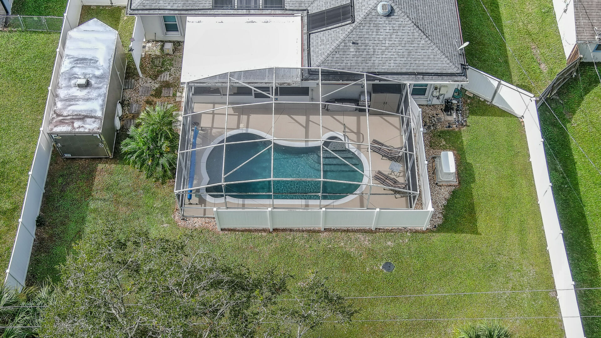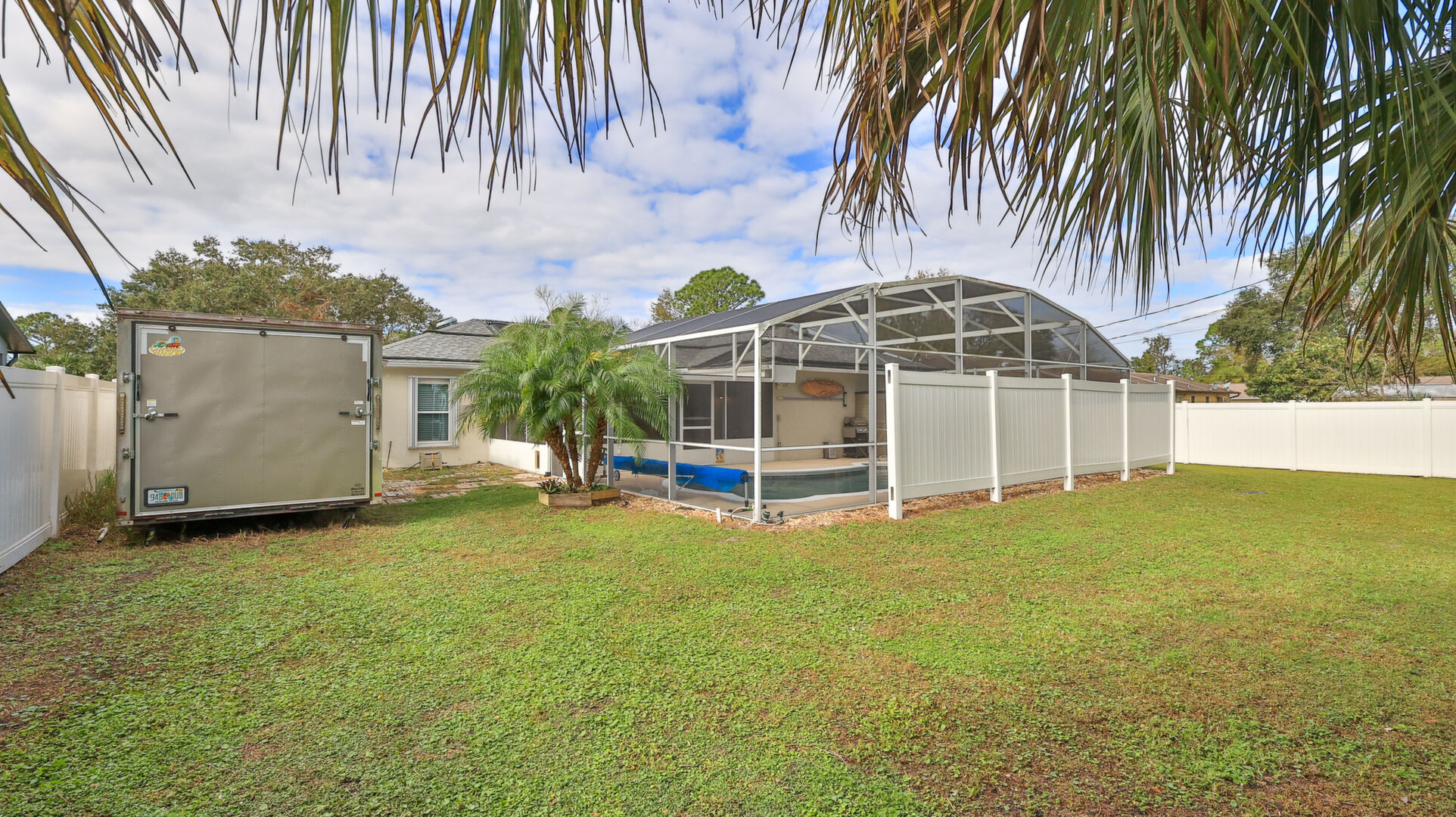 MOVE IN READY SALTWATER POOL HOME! You will love this Holiday Builders, concrete block home with 3 bedrooms, 2 baths, and 2 car garage! Well designed split plan with vaulted ceiling, ceramic tile & wood look flooring throughout. Updated kitchen with stainless steel appliances, granite countertops, pull out drawers, LED lighting, water filter, and built in pantry. Find relaxation at the outdoor oasis with a dip in the 2016 screened in pool, a soak in the hot tub, or enjoy a great book on the 14x20 covered Lanai, all surrounded with privacy fencing. Pool has solar panels for heating, pool cover, & 1 Year old salt cell. This home is storm ready, with a 2021 Entire Home 22KW Generac Generator w/Transferable Warranty, 500 Gal buried Propane Tank, 2018 Window World Storm Windows w/ Lifetime Warranty, plus Accordion Style Storm Shutters! Roof 2016, A/C & Water Heater 2024. Back Yard Fenced (2016). Washer/Dryer Included (2017). Furniture Negotiable! Garage has Epoxy flooring, Shelving & Cabinets, Attic Stairs, & Solar Ventilators. Hot Tub Included! Furniture Negotiable! Great location at the very south end of Florida Shores. Fifth house from the end of the community! Easy access to US1 from Volco Road. 5 minutes to Publix, restaurants, shopping, churches & 10 minutes to medical. 20 Minutes to beautiful New Smyrna beaches! 30 Minutes to Titusville for antique shops, local restaurants, Wildlife Refuge and 50 Minutes to the Kennedy Space Center or watch the launches from home! NO storm damage or flooding! Home is built with metal studs.