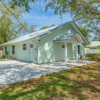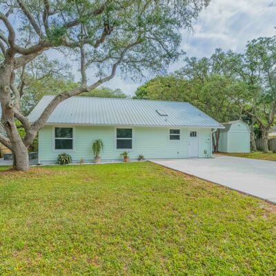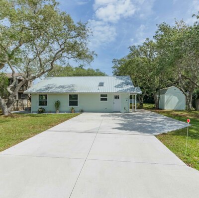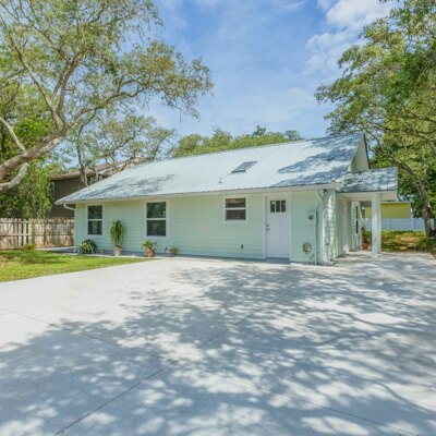 This beachy 3 bedroom, 2 bath home nestled on almost a quarter of an acre amidst shade trees in Sunset Park on Anastasia Island has been totally updated for the discerning buyer. In the spacious, open-concept kitchen new quartz countertops, custom white cabinetry and skylight make for a bright workspace. New microwave, new water heater, and stainless appliances and new sink with updated faucet along with a large island make the beautiful kitchen space functional. Life-proof laminate flooring throughout the home provides continuity while all new electrical outlets, switches and wiring guarantee safety and efficiency. Updated interior doors, fresh paint, new bathroom sinks and faucets, metal roof and fabric-style hurricane shutters, which are easily installed or stored for all windows, and all new interior and exterior doors make this newly renovated home efficiently safe as well as clean and inviting. There is no HOA in this family-friendly neighborhood which allows boat and RV storage with no restrictions, and no flood insurance required. A short 10-minute drive to downtown St. Augustine, and walking distance to beach access at Ocean Hammock Park boardwalk proves to make this location the perfect neighborhood. If desired, the home can also be rented short-term as an investment opportunity. There are two sheds provided on the property which boast 10-ft ceilings, lofts and large barn doors for easy access for extra storage space. The 10 x 12 shed could easily be converted to a she-shed, man cave, office or studio space. A newly pavered patio lit by timed inset LED lights makes a great outdoor entertainment space complete with sliding doors leading from the living area, and another pavered space for a fire pit for those cooler fall evenings. The exterior of the home boasts freshly painted Hardie board siding, all new plumbing throughout, newly poured concrete driveway, new air conditioning and ductwork, and new gutters with leaf guards. The owners have truly made this 1248 sq ft St. Augustine home close to the beach and shopping move-in ready ! Will not be entertaining/reviewing offers until Monday, May 24th.