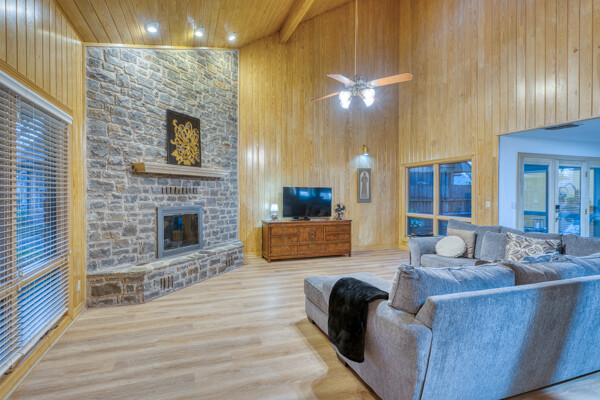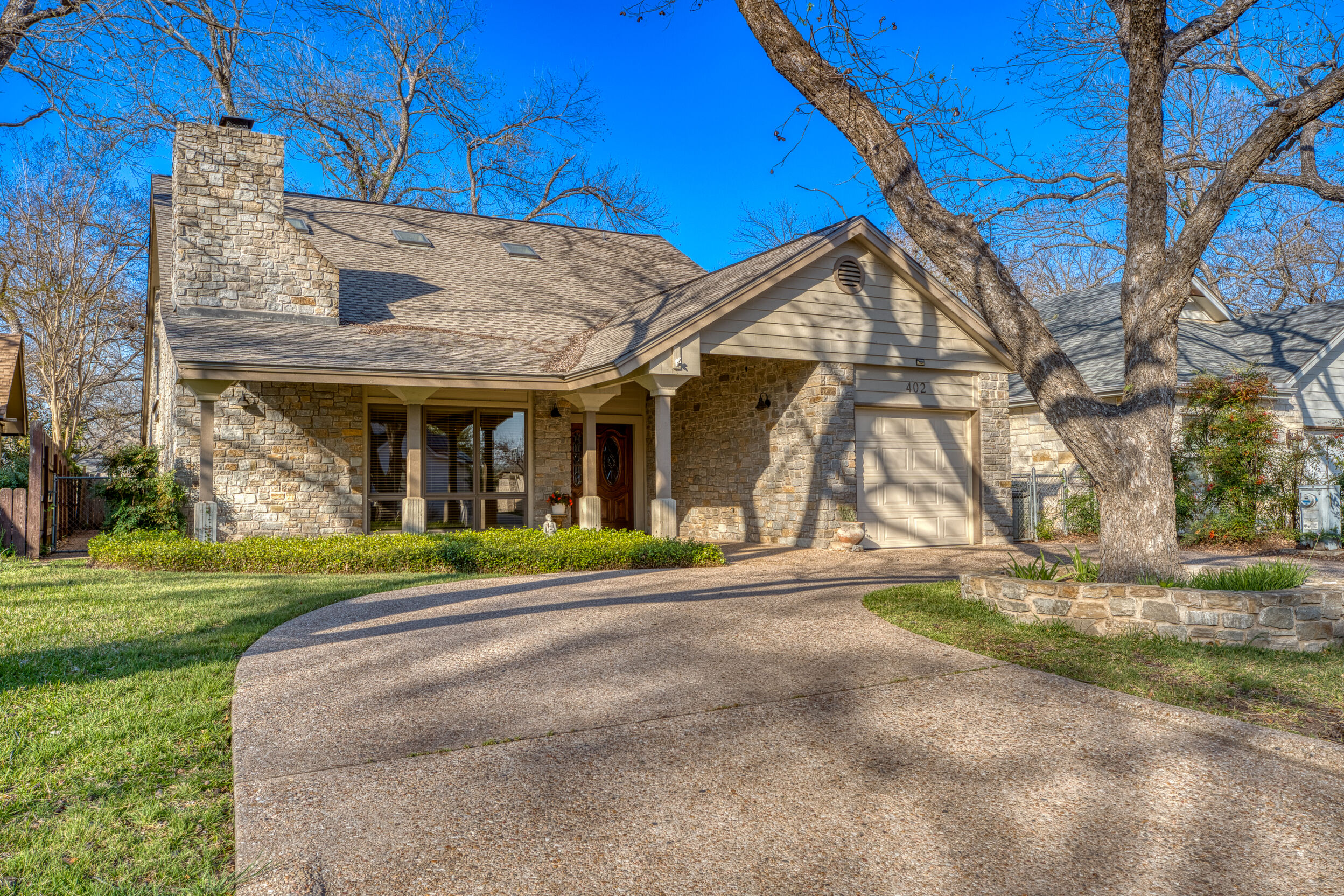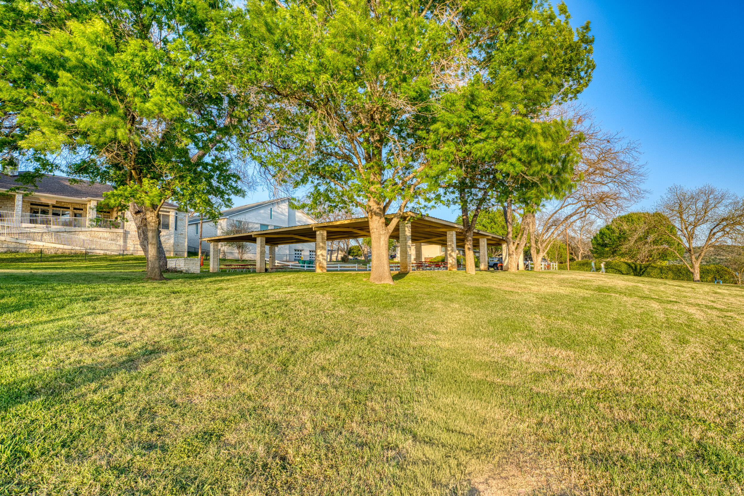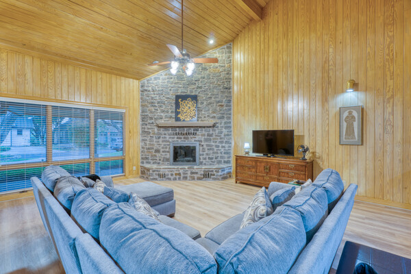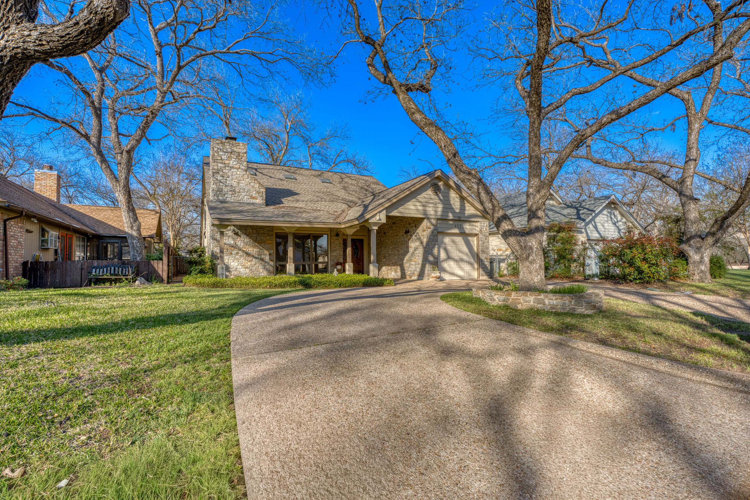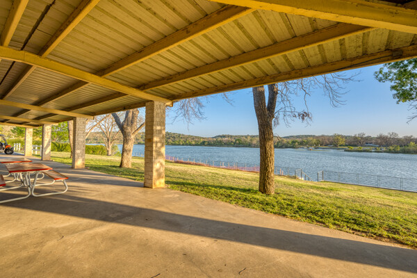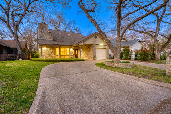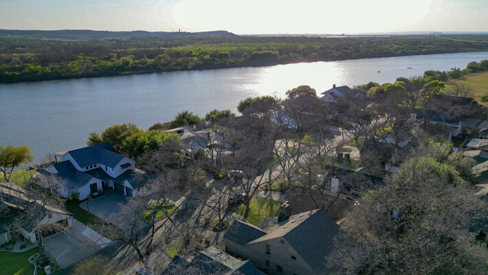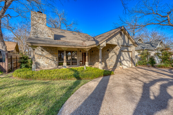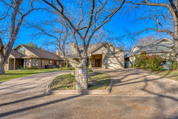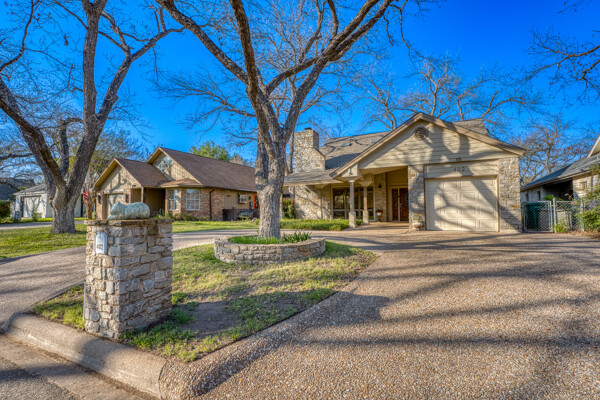 Welcome to this charming 4 bedroom, 3 bath home located in the orchard of Meadowlakes , a gated, golf course neighborhood on the shores of Lake Marble Falls. Residents enjoy 24-hour security, an 18 hole golf course and new clubhouse coming soon, waterfront property owners park with boat ramp, fishing dock, and scenic lake access, all just minutes from downtown Marble Falls. From the moment you arrive, the stunning curb appeal makes a lasting impression, with mature, towering trees and a circular drive that adds both beauty and convenience. This cozy yet spacious home is full of character, featuring soaring ceilings, a stunning floor-to-ceiling masonry fireplace, and warm natural wood accents throughout. The inviting front porch sets the tone, while a peaceful side porch offers the perfect spot for morning coffee or relaxing evenings. Inside, the flexible floor plan includes a primary suite on the main level along with an additional bedroom and full bath downstairs, ideal for guests or multi-generational living. Upstairs, you’ll find two additional bedrooms and a full bath, along with a charming balcony that fills the space with beautiful natural light. Enjoy Lake Marble Falls with ease, and take advantage of the unbeatable location less than half a mile from the community lakeside park, where you can launch your boat, fish, or simply unwind by the water.