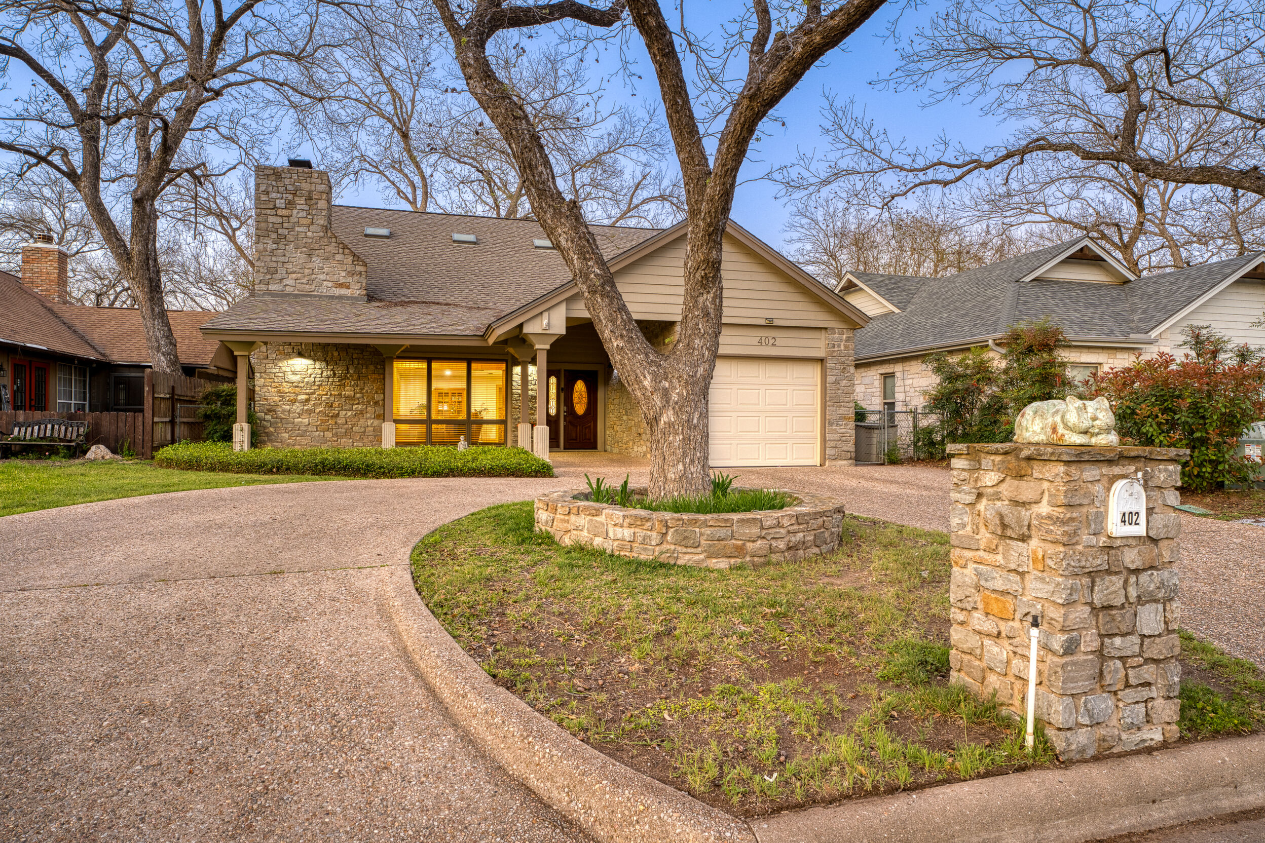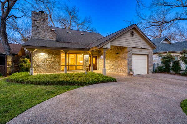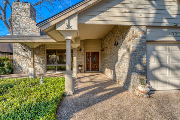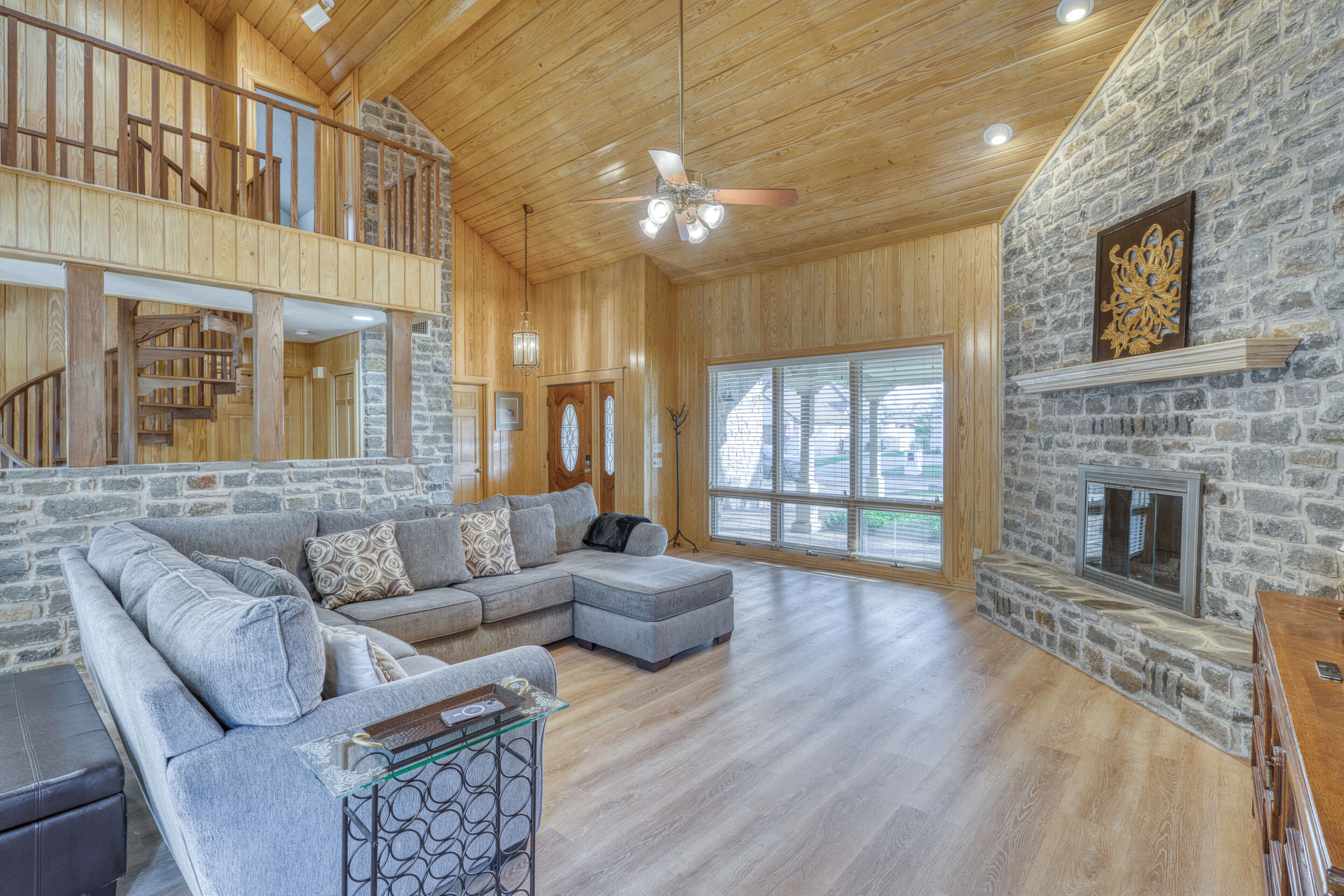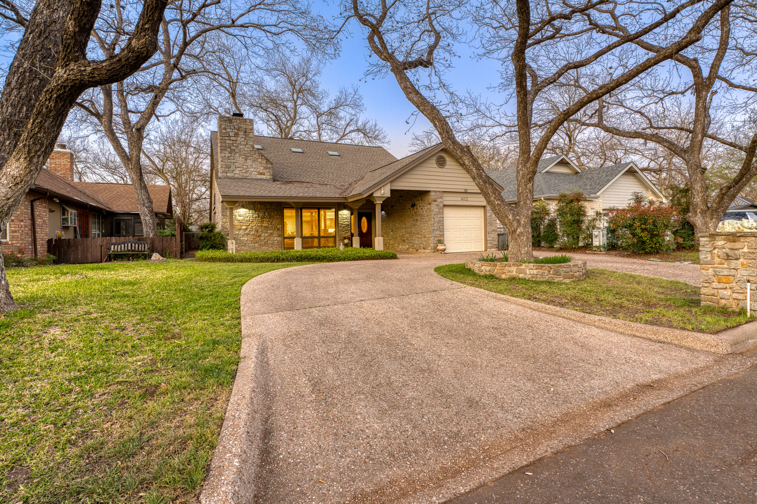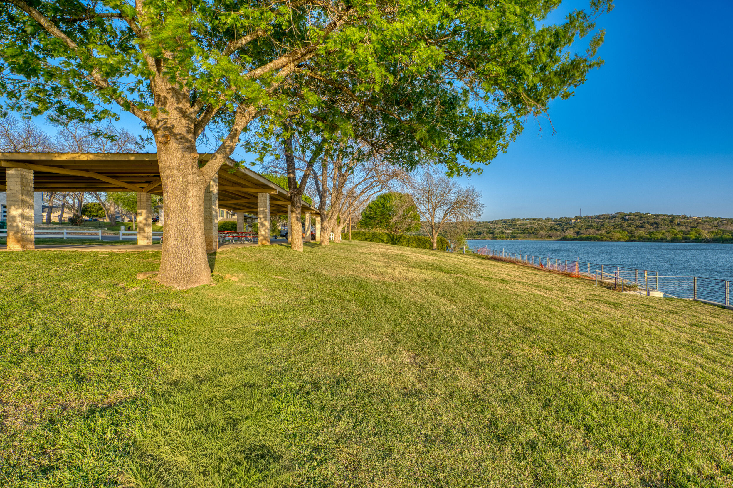 Welcome to this charming 4 bedroom, 3 bath home located in the orchard of Meadowlakes , a gated, golf course neighborhood on the shores of Lake Marble Falls. Residents enjoy 24-hour security, an 18 hole golf course and new clubhouse coming soon, waterfront property owners park with boat ramp, fishing dock, and scenic lake access, all just minutes from downtown Marble Falls. From the moment you arrive, the stunning curb appeal makes a lasting impression, with mature, towering trees and a circular drive that adds both beauty and convenience. This cozy yet spacious home is full of character, featuring soaring ceilings, a stunning floor-to-ceiling masonry fireplace, and warm natural wood accents throughout. The inviting front porch sets the tone, while a peaceful side porch offers the perfect spot for morning coffee or relaxing evenings. Inside, the flexible floor plan includes a primary suite on the main level along with an additional bedroom and full bath downstairs, ideal for guests or multi-generational living. Upstairs, you’ll find two additional bedrooms and a full bath, along with a charming balcony that fills the space with beautiful natural light. Enjoy Lake Marble Falls with ease, and take advantage of the unbeatable location less than half a mile from the community lakeside park, where you can launch your boat, fish, or simply unwind by the water.