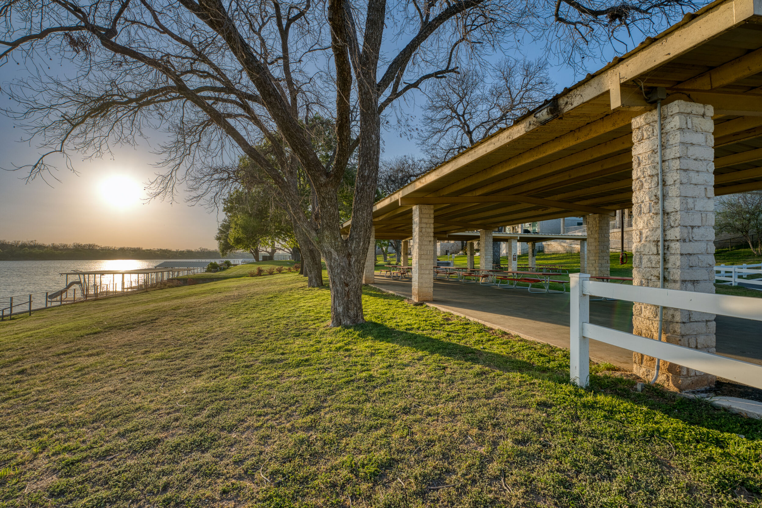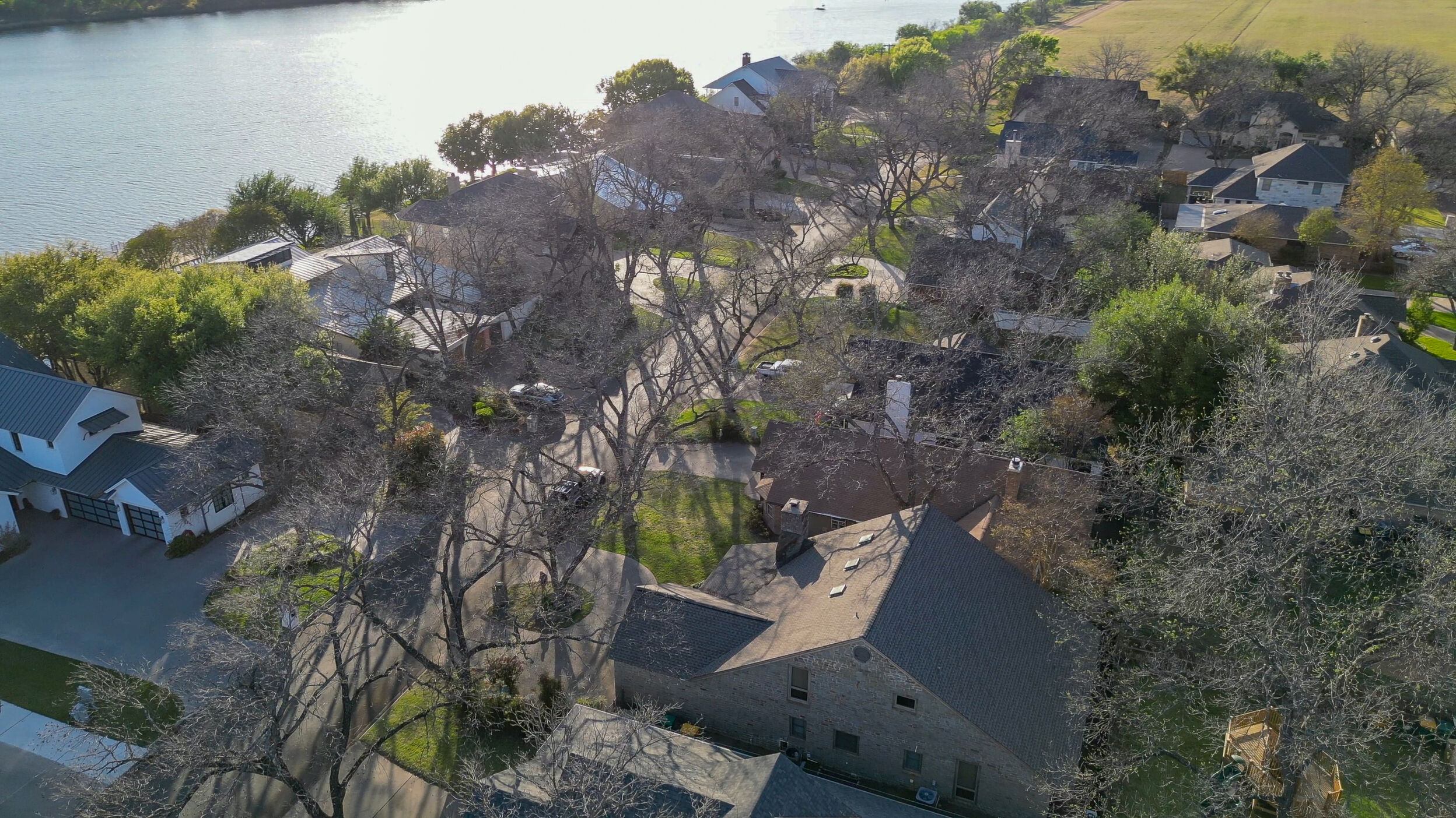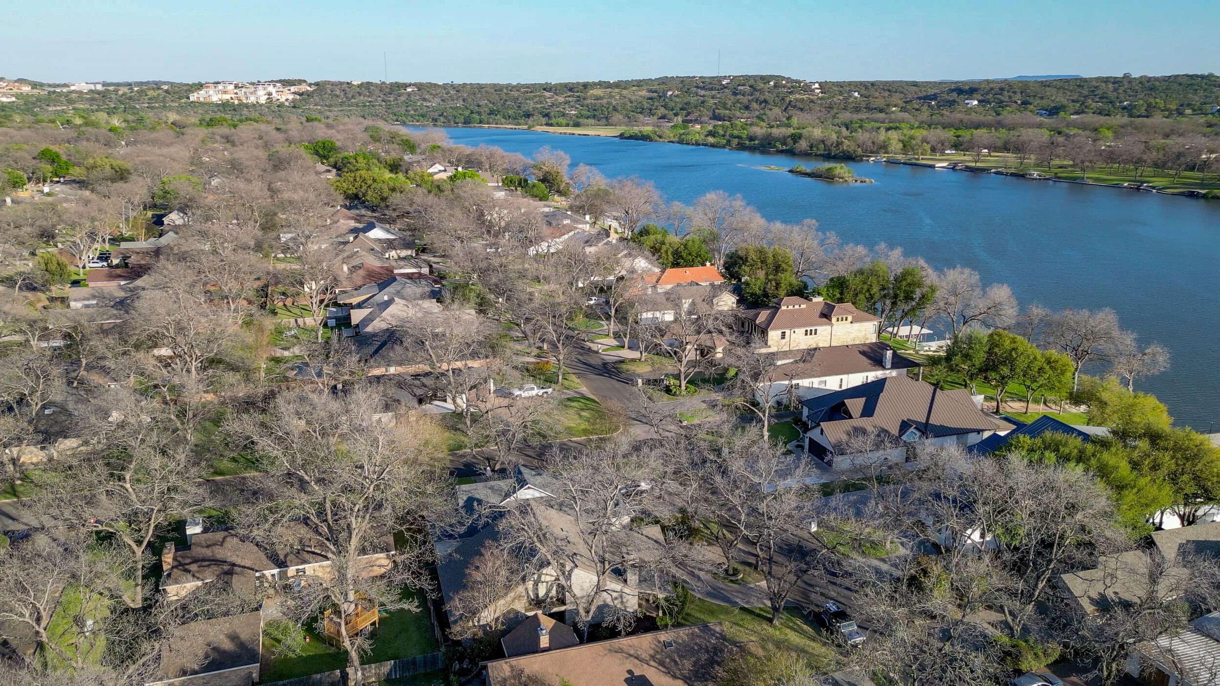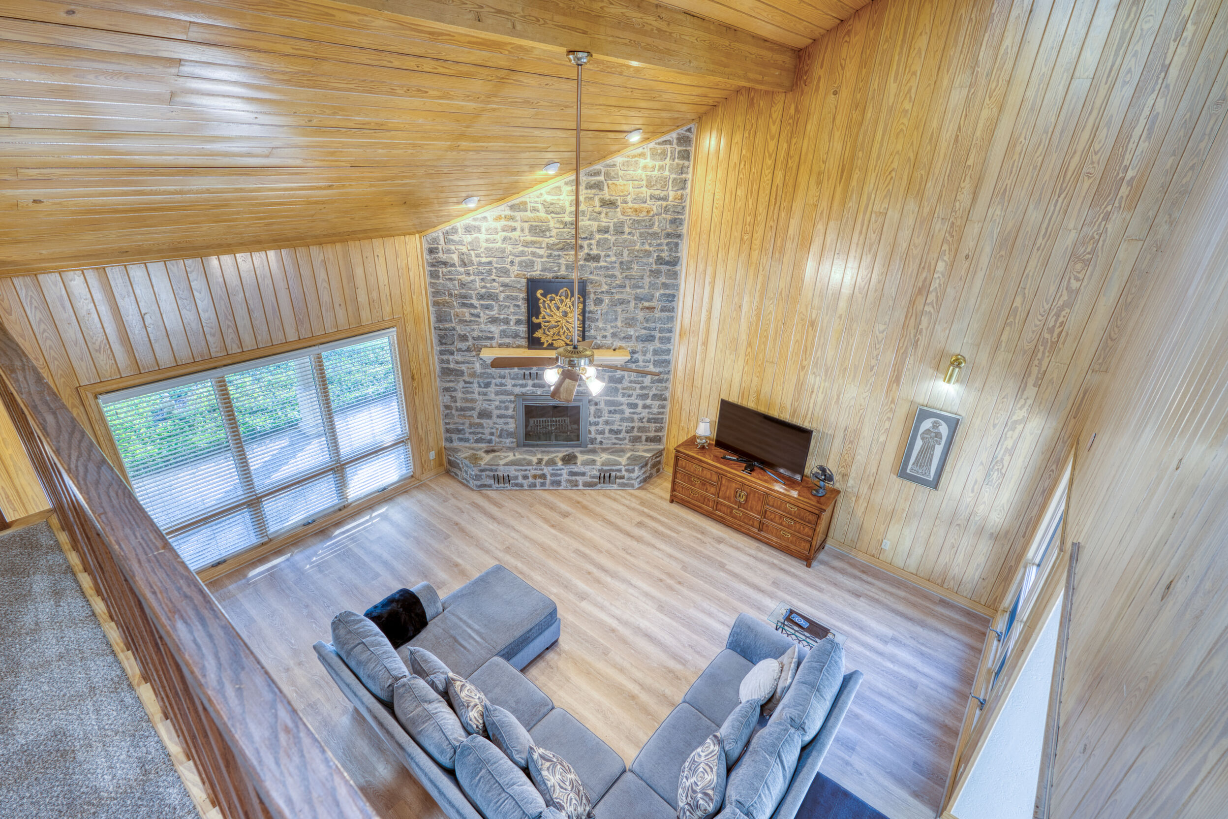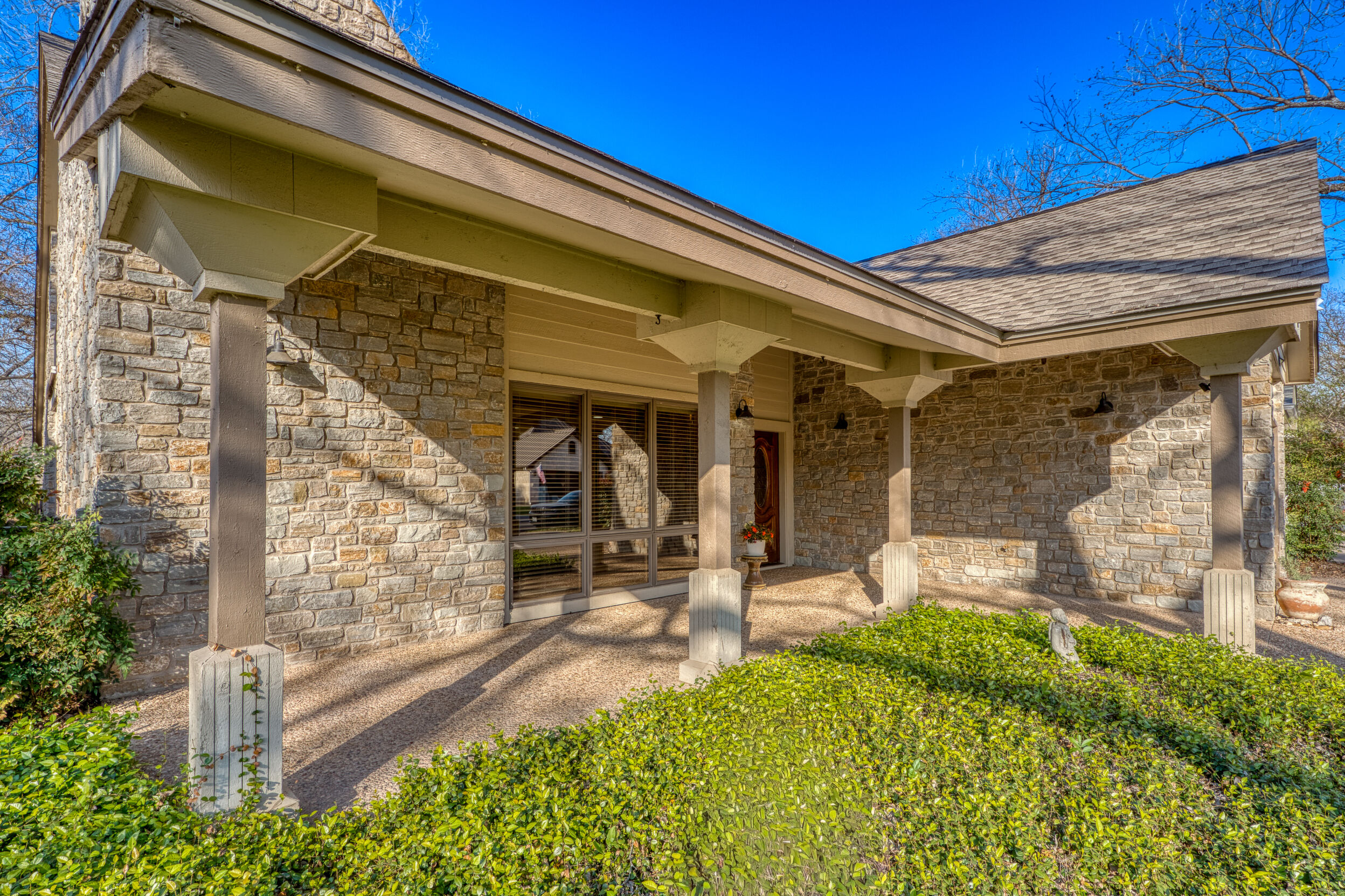 Welcome to this charming 4 bedroom, 3 bath home located in the orchard of Meadowlakes , a gated, golf course neighborhood on the shores of Lake Marble Falls. Residents enjoy 24-hour security, an 18 hole golf course and new clubhouse coming soon, waterfront property owners park with boat ramp, fishing dock, and scenic lake access, all just minutes from downtown Marble Falls. From the moment you arrive, the stunning curb appeal makes a lasting impression, with mature, towering trees and a circular drive that adds both beauty and convenience. This cozy yet spacious home is full of character, featuring soaring ceilings, a stunning floor-to-ceiling masonry fireplace, and warm natural wood accents throughout. The inviting front porch sets the tone, while a peaceful side porch offers the perfect spot for morning coffee or relaxing evenings. Inside, the flexible floor plan includes a primary suite on the main level along with an additional bedroom and full bath downstairs, ideal for guests or multi-generational living. Upstairs, you’ll find two additional bedrooms and a full bath, along with a charming balcony that fills the space with beautiful natural light. Enjoy Lake Marble Falls with ease, and take advantage of the unbeatable location less than half a mile from the community lakeside park, where you can launch your boat, fish, or simply unwind by the water.