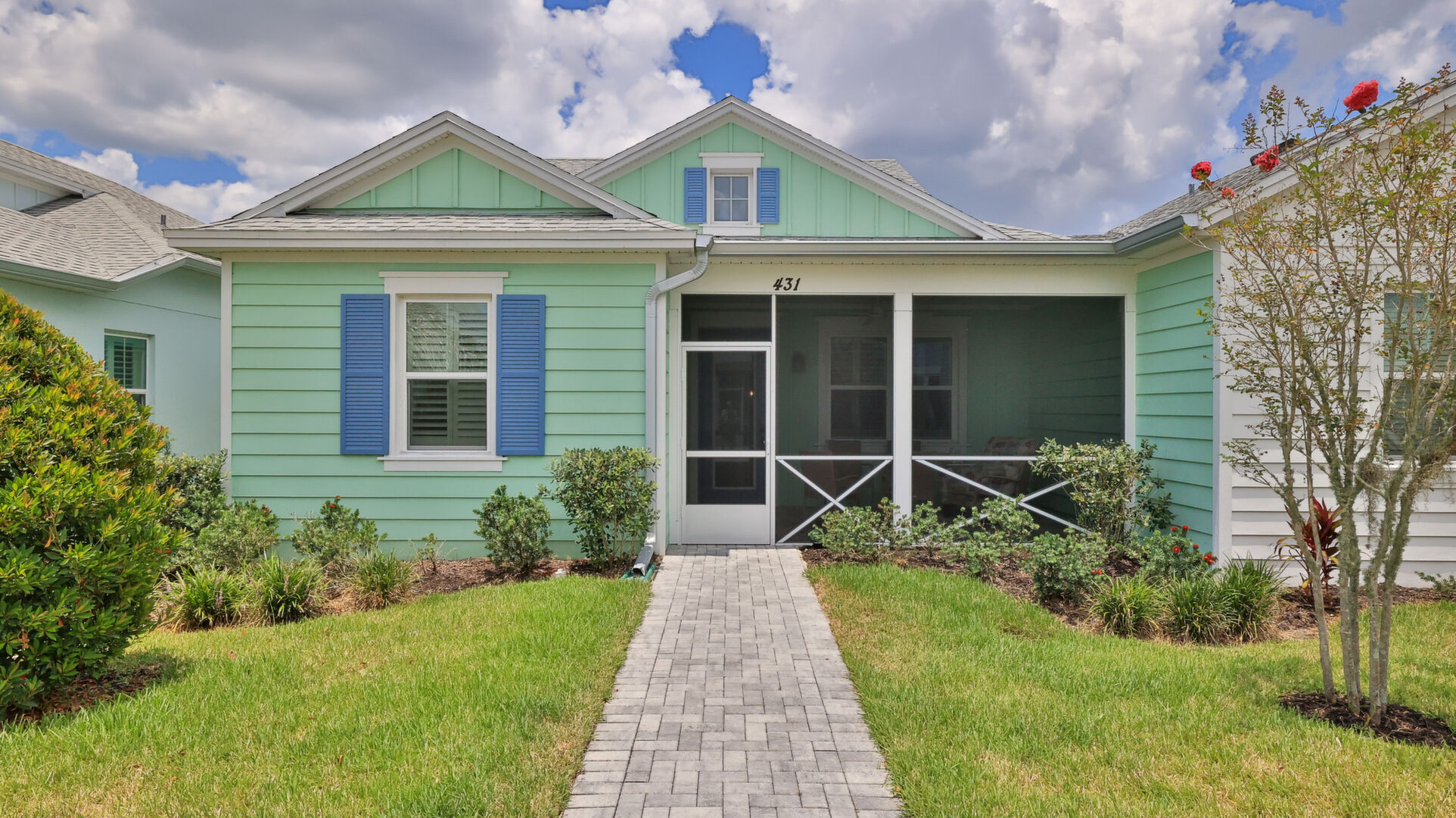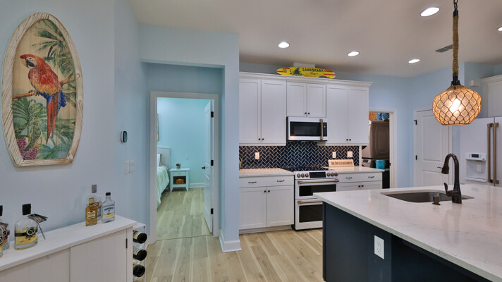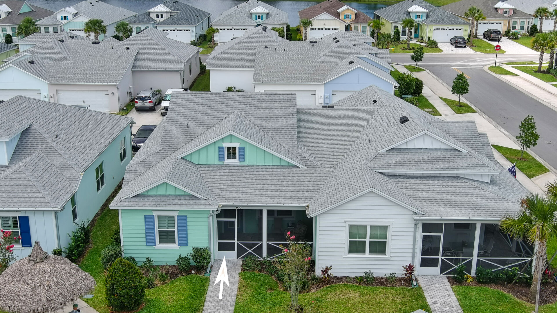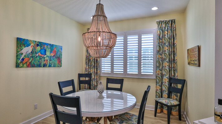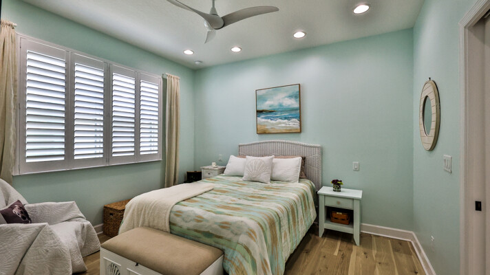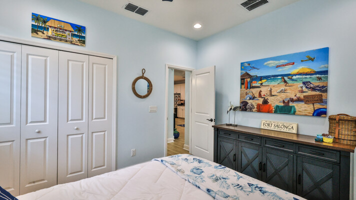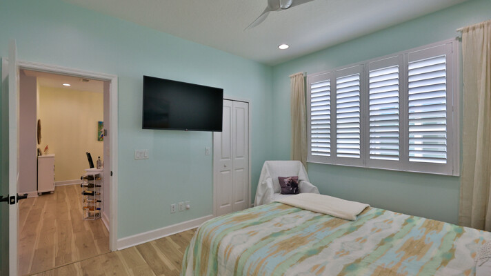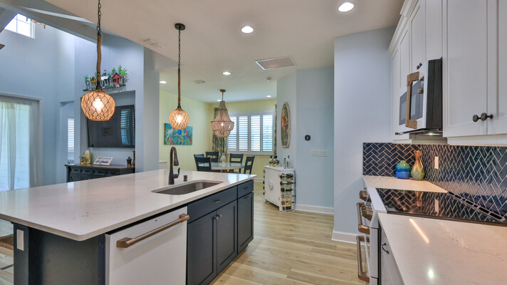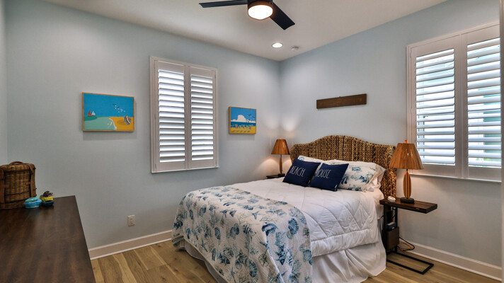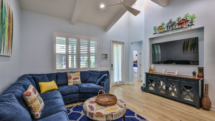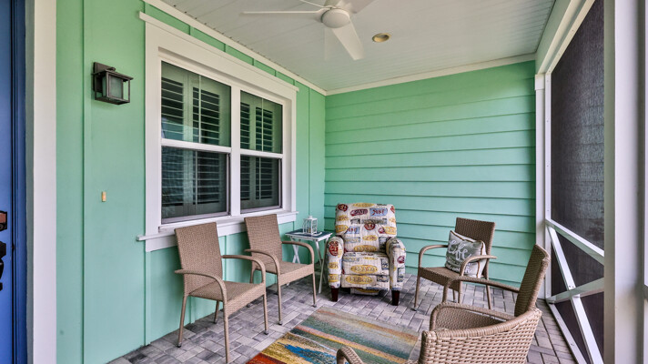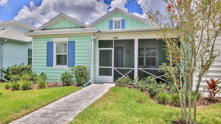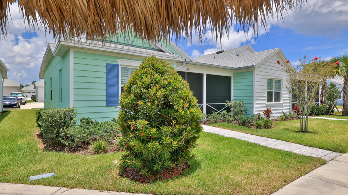 Welcome to your charming Camelia Cottage located in the vibrant Margaritaville community. With its 2 bedrooms, 2 bathrooms, roomy flex space, & 2-car garage, your cozy home is perfect for those 55+ seeking a balance between an active social life & serene relaxation. Your cottage features a 20/20 fine-mesh screened porch near a peaceful pond, providing a private retreat for unwinding. Step inside this meticulously designed cottage, & be greeted by a host of luxurious upgrades. The kitchen boasts stunning quartz countertops, sleek flooring, & an extended island perfect for culinary adventures. With a double-oven at your disposal, preparing meals for guests or simply indulging in your favorite recipes becomes a breeze.The elegant touches continue throughout w/plantation shutters and sleek flooring, adding a touch of sophistication to every room. Seamless shower doors, and a handheld, adjustable double showerhead further enhance the overall sense of refinement and convenience. Your upgraded HVAC system includes superior humidity control and a smart thermostat. These features, combined with the whole-house water softener loop, ensure energy efficiency and longevity, helping to protect both your health and your investment. Living in this award-winning 55+ community, you can enjoy a lavish, active lifestyle. The community offers a private beach club, multiple pools, a state-of-the-art fitness center, pottery and wood-shop facilities, a dog park and spa, a movie theater, and a lively town square with regular live entertainment. Whether you're seeking an active retirement filled with social and physical activities or a tranquil sanctuary to enjoy peace and quiet, this Camelia Cottage in Margaritaville is a fantastic choice.