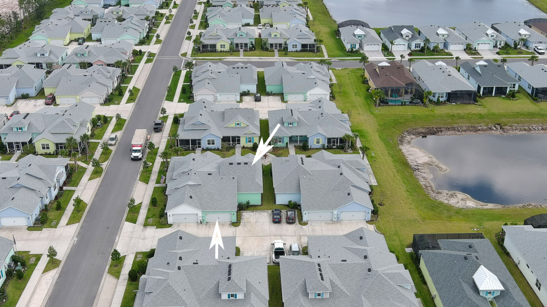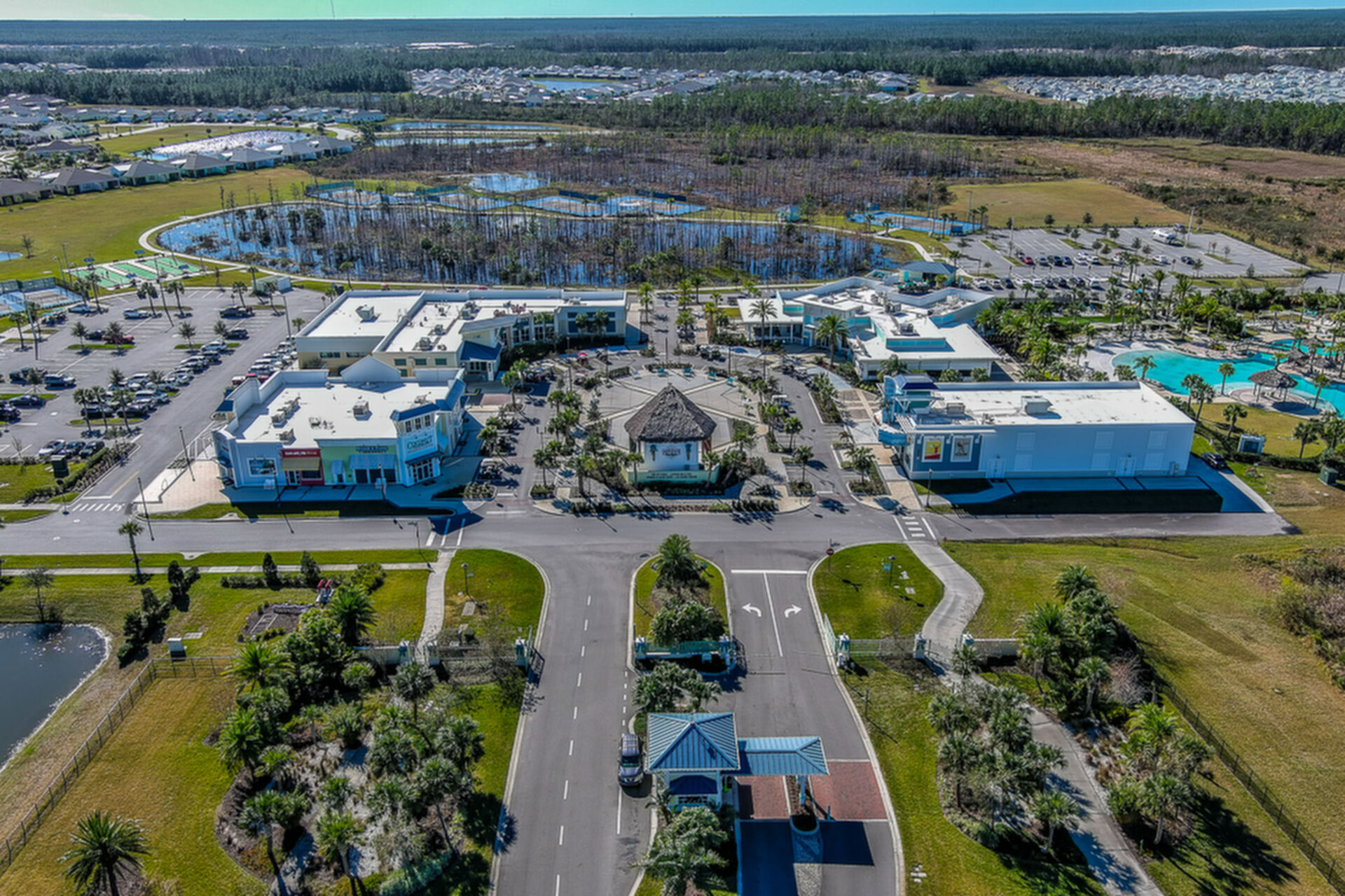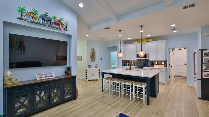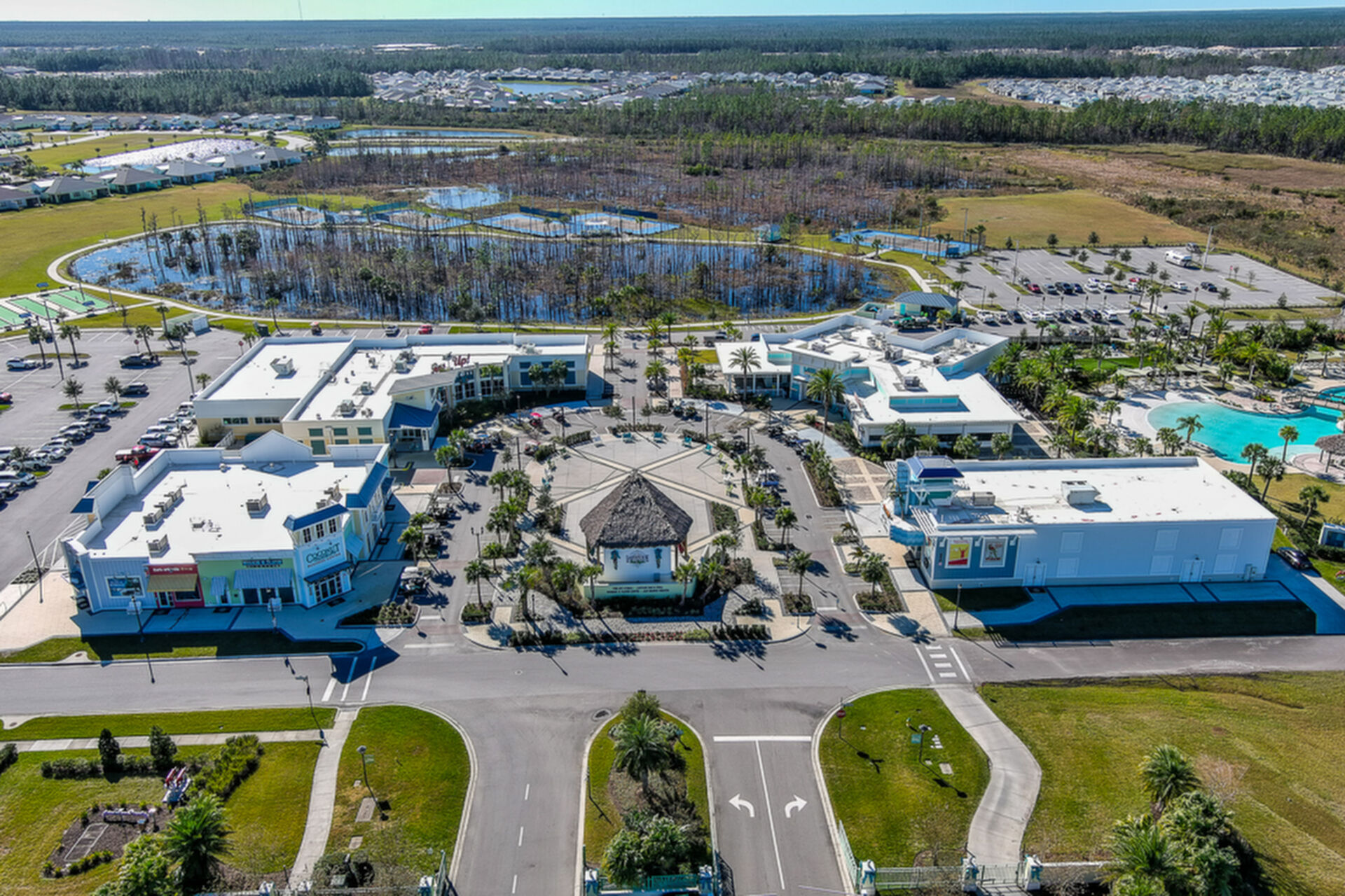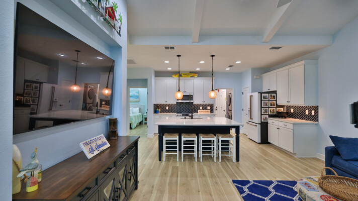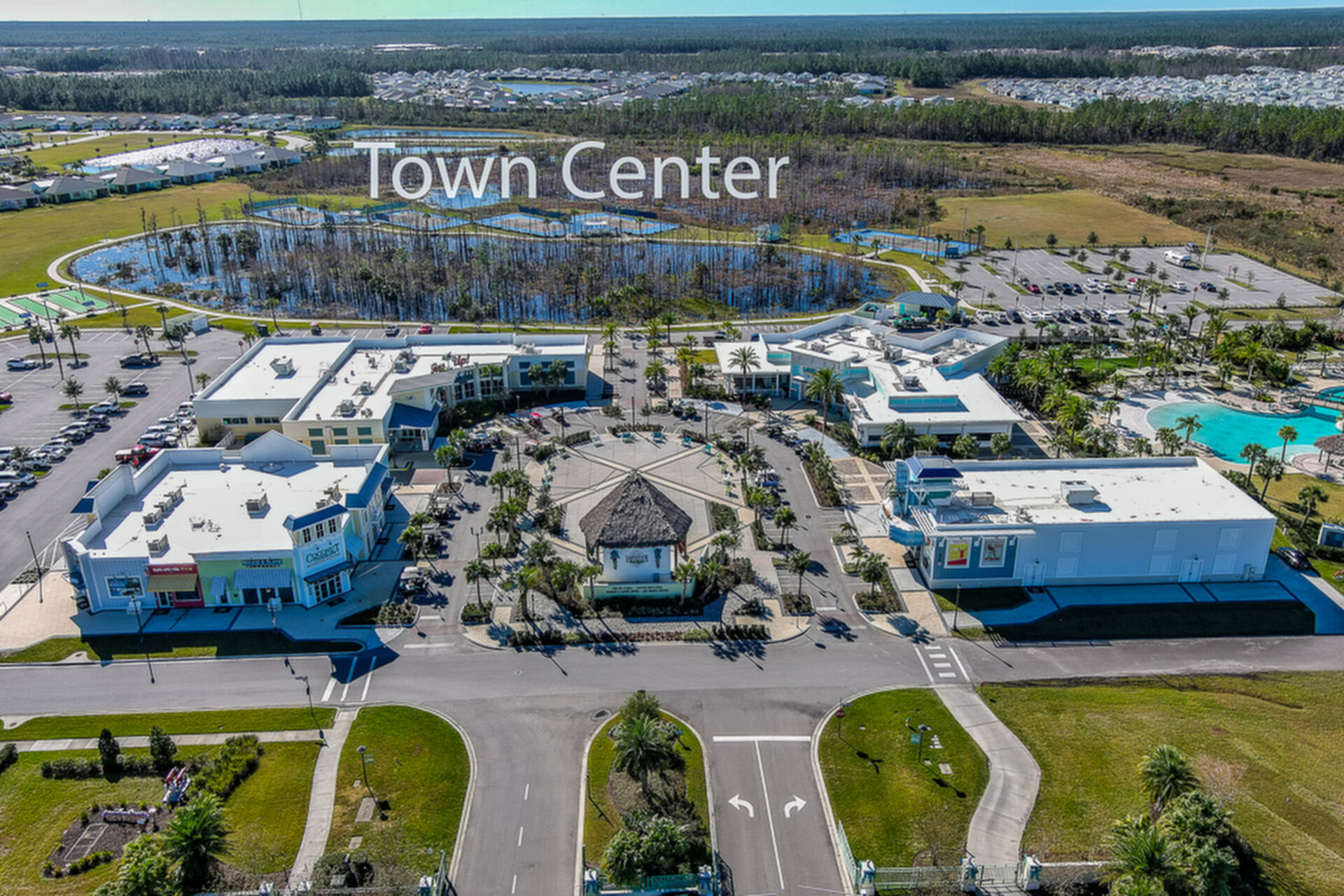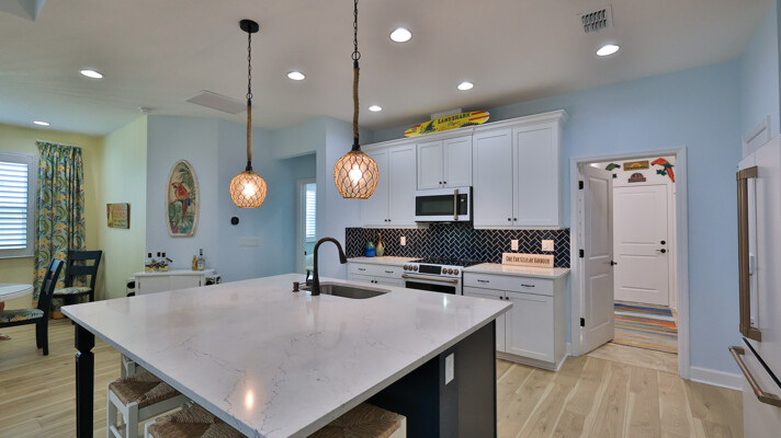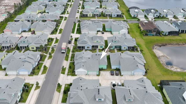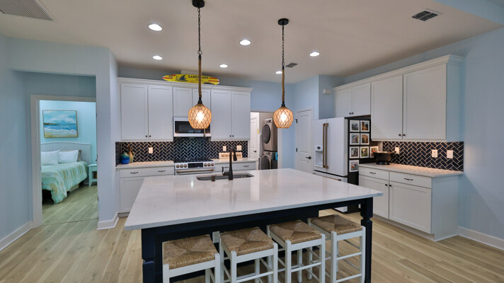 Welcome to your charming Camelia Cottage located in the vibrant Margaritaville community. With its 2 bedrooms, 2 bathrooms, roomy flex space, & 2-car garage, your cozy home is perfect for those 55+ seeking a balance between an active social life & serene relaxation. Your cottage features a 20/20 fine-mesh screened porch near a peaceful pond, providing a private retreat for unwinding. Step inside this meticulously designed cottage, & be greeted by a host of luxurious upgrades. The kitchen boasts stunning quartz countertops, sleek flooring, & an extended island perfect for culinary adventures. With a double-oven at your disposal, preparing meals for guests or simply indulging in your favorite recipes becomes a breeze.The elegant touches continue throughout w/plantation shutters and sleek flooring, adding a touch of sophistication to every room. Seamless shower doors, and a handheld, adjustable double showerhead further enhance the overall sense of refinement and convenience. Your upgraded HVAC system includes superior humidity control and a smart thermostat. These features, combined with the whole-house water softener loop, ensure energy efficiency and longevity, helping to protect both your health and your investment. Living in this award-winning 55+ community, you can enjoy a lavish, active lifestyle. The community offers a private beach club, multiple pools, a state-of-the-art fitness center, pottery and wood-shop facilities, a dog park and spa, a movie theater, and a lively town square with regular live entertainment. Whether you're seeking an active retirement filled with social and physical activities or a tranquil sanctuary to enjoy peace and quiet, this Camelia Cottage in Margaritaville is a fantastic choice.