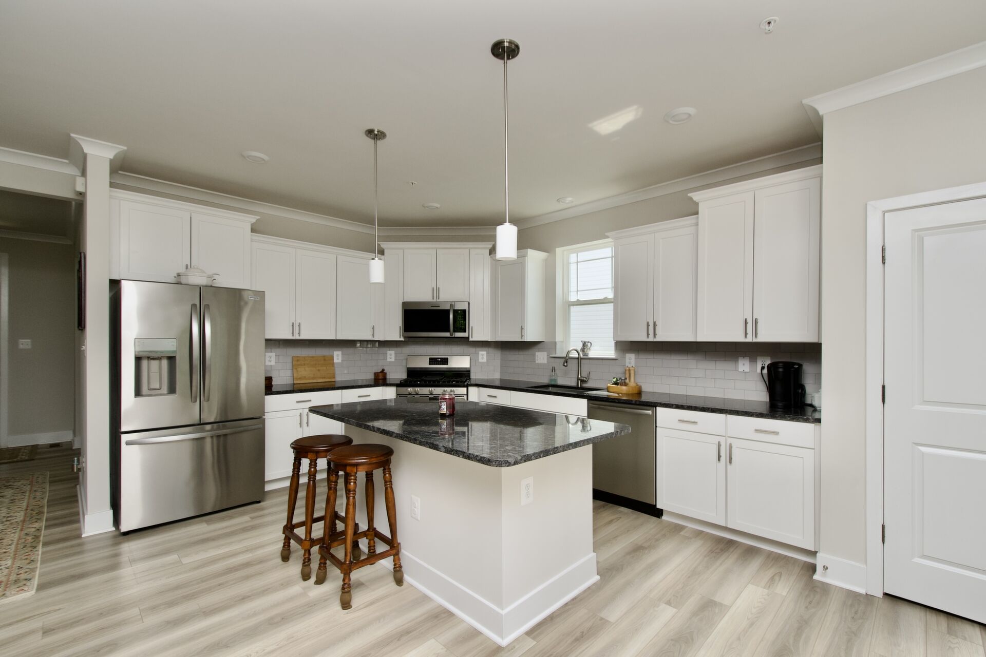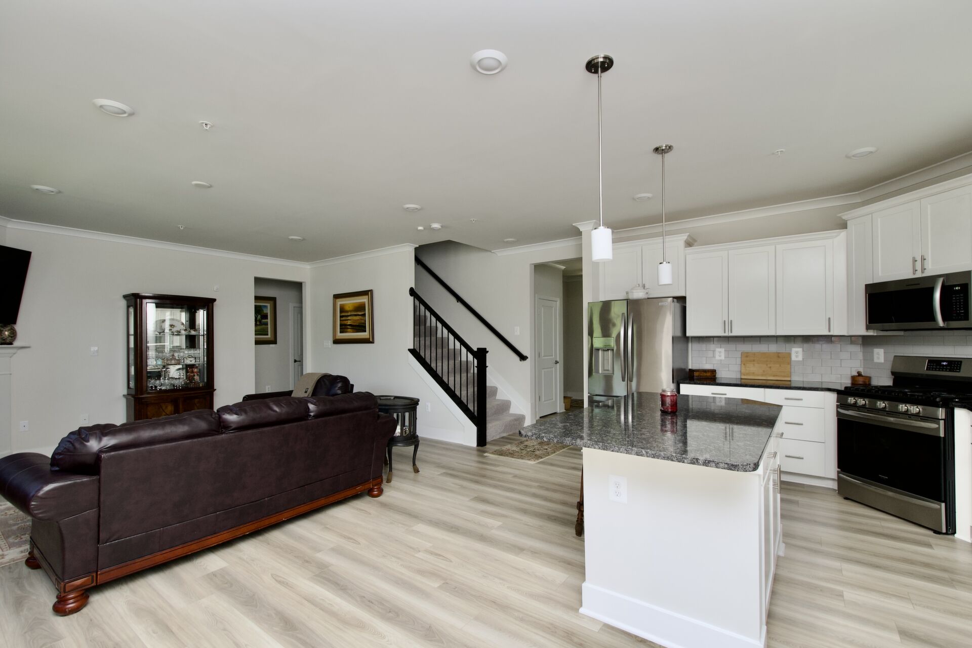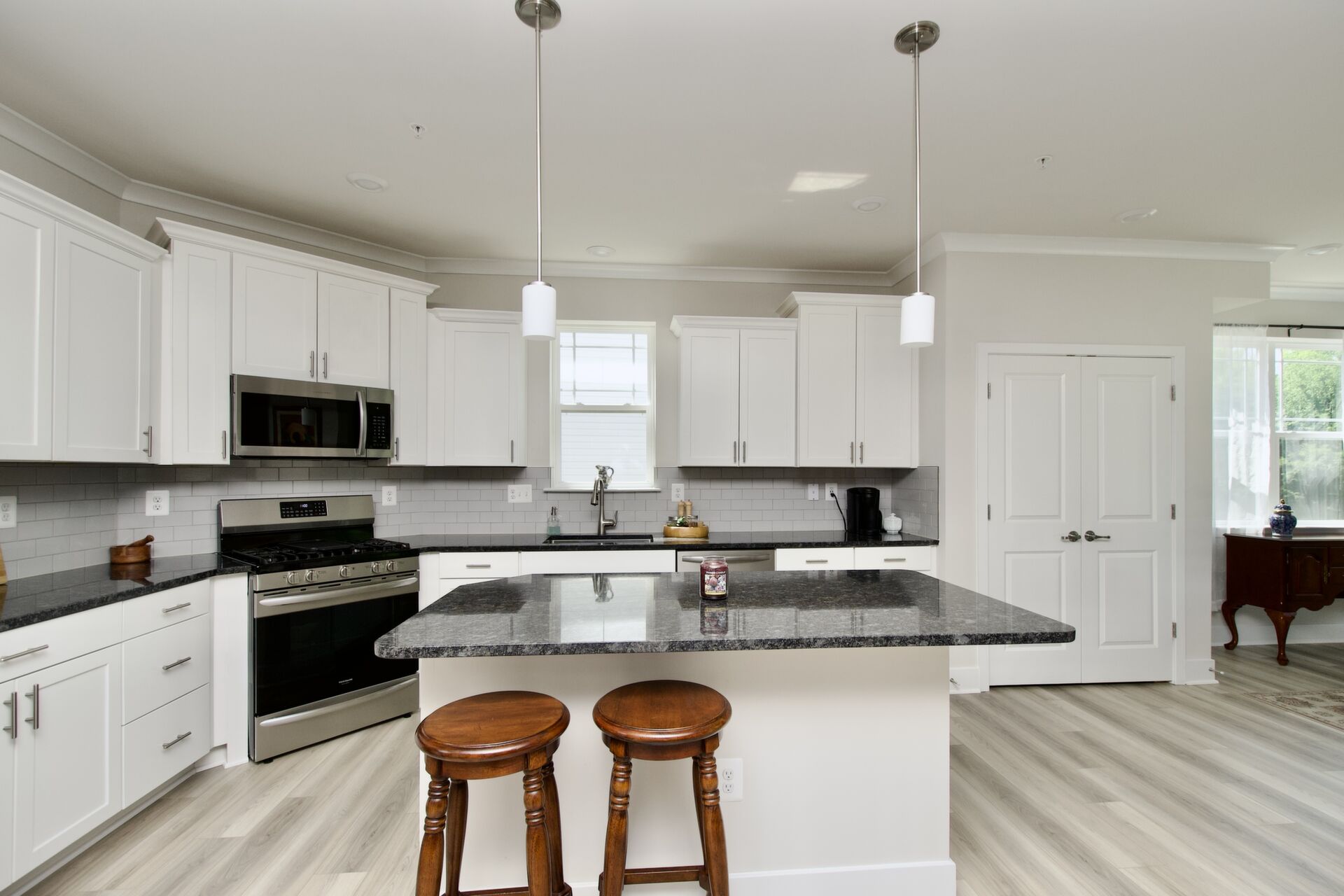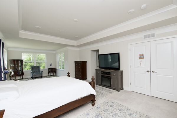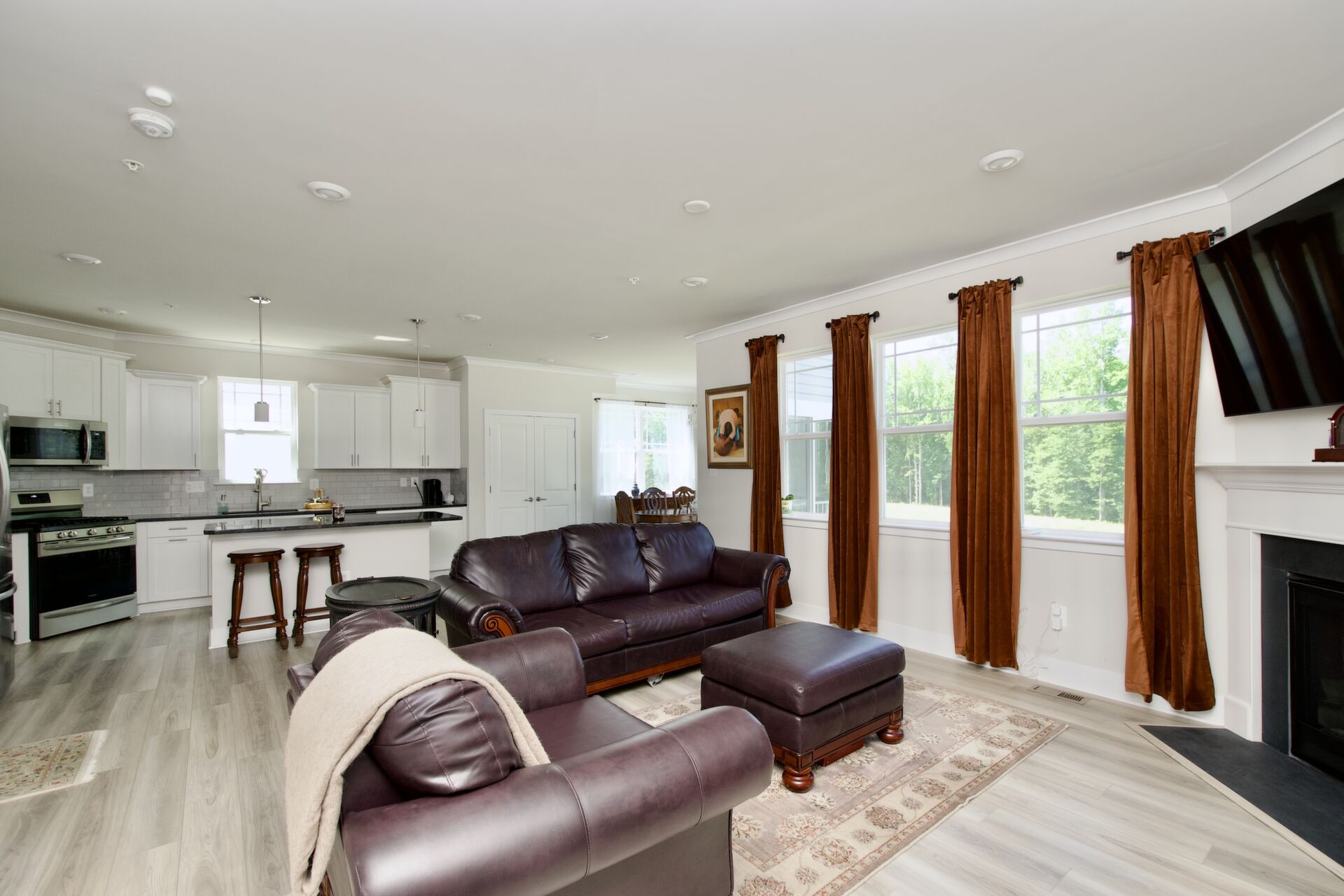 The kitchen is a chef’s delight, complete with a large island with seating, sleek countertops, and premium appliances. It seamlessly flows into a cozy family room with a fireplace and an inviting dining area—ideal for everyday living and special gatherings. For more formal occasions, enjoy the separate living room that exudes sophistication. Hosting overnight guests or need an extra room for a nanny? A main-level guest bedroom with an adjacent full bath ensures comfort and privacy.