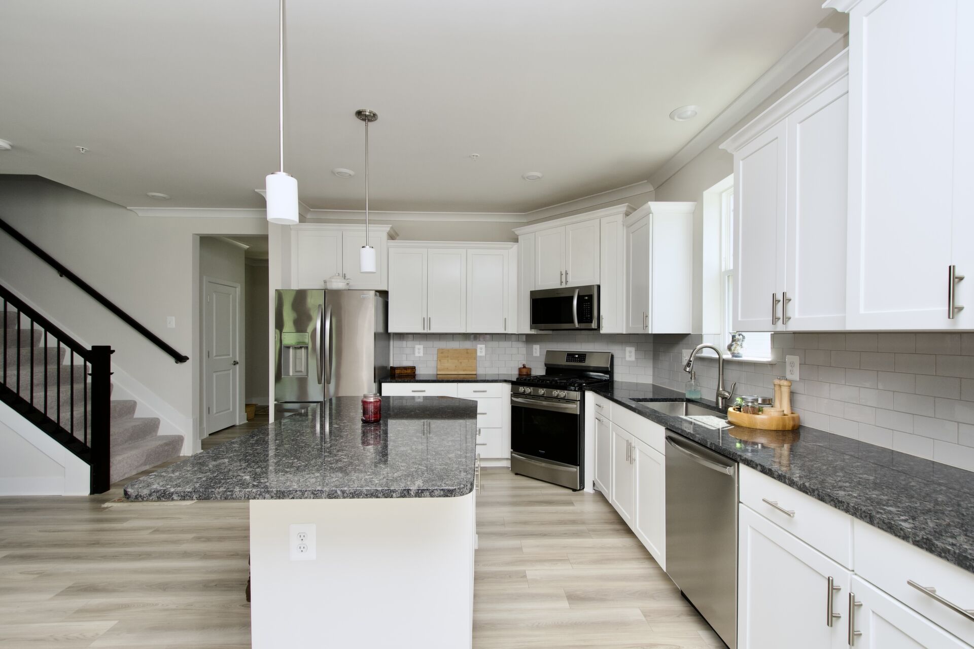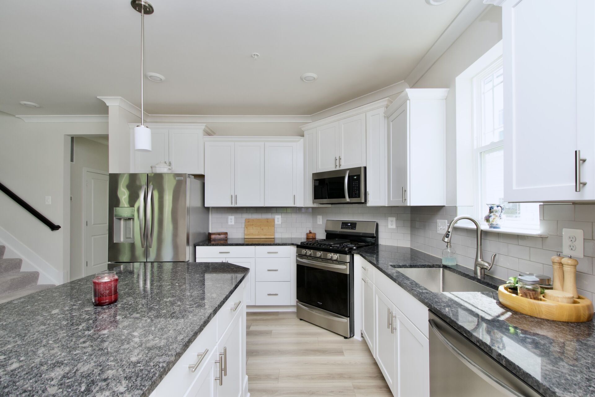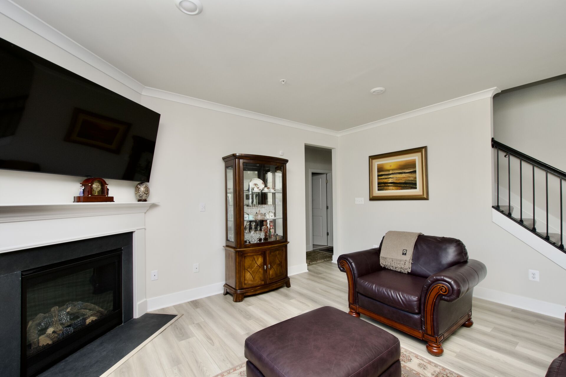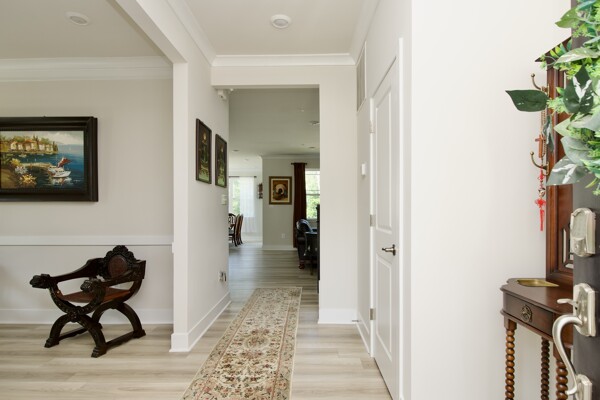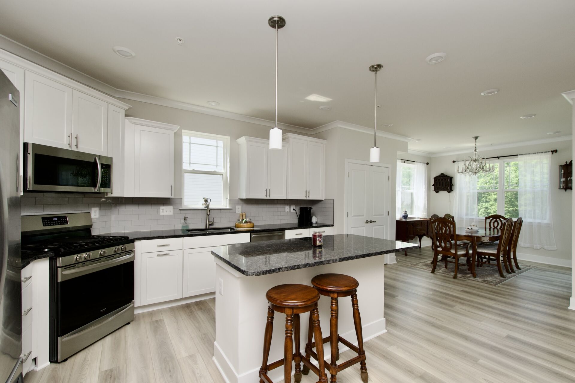 The kitchen is a chef’s delight, complete with a large island with seating, sleek countertops, and premium appliances. It seamlessly flows into a cozy family room with a fireplace and an inviting dining area—ideal for everyday living and special gatherings. For more formal occasions, enjoy the separate living room that exudes sophistication. Hosting overnight guests or need an extra room for a nanny? A main-level guest bedroom with an adjacent full bath ensures comfort and privacy.