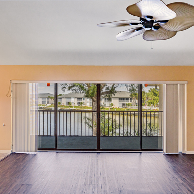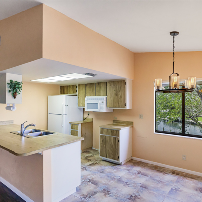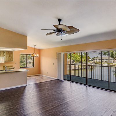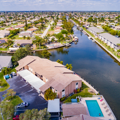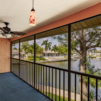 Boat to the gulf from your own back yard. Swim in the new pool. This light, bright end unit with amazing view of basin has many upgrades. Great room plan with Cathedral ceiling. New carpet in both bedrooms, Luxury Vinyl Plank in Great room and new tile floor in hall and kitchen. Large screened lani with storage room and new light fixtures. A/C unit is just four years old and there is a new hot water heater. Handy washer and dryer in unit and three decorator ceiling fans. Publix and Walgreen's right across the street and it is convenient to Cape Harbor. Make your appointment today and start enjoying all that the Florida lifestyle has to offer.