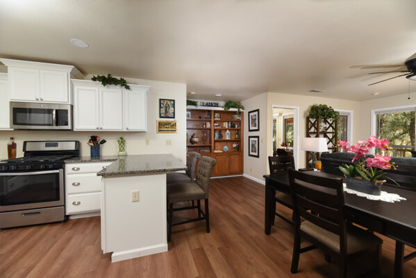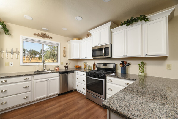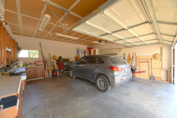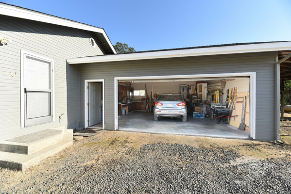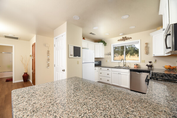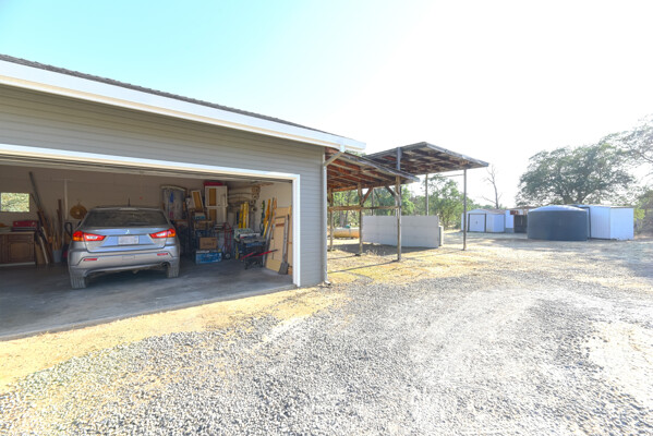 This lovely home is 1376 sq. ft., with 2 bedrooms, 2 baths, and a den/office has been completely refurbished. Enjoy the wholly modernized kitchen with newer appliances, soft-shut cabinets, drawers, dedicated water filter tap, granite countertops in kitchen and bathrooms, waterproof click-lock vinyl flooring, water-saving fixtures, LED lights, ceiling fans, and windows covering throughout, insulated/ drywalled, oversized 10' high ceiling, double car garage with existing space for wood/ mechanic shop, brand new 16' motorized garage door, two garage attached carports, 1 for a regular vehicle, second can be used for a large RV or hay storage, Metal outbuildings, 2 wells, pump house located beside the government required reserve water tank and a septic tank for a three-bedroom sized home.