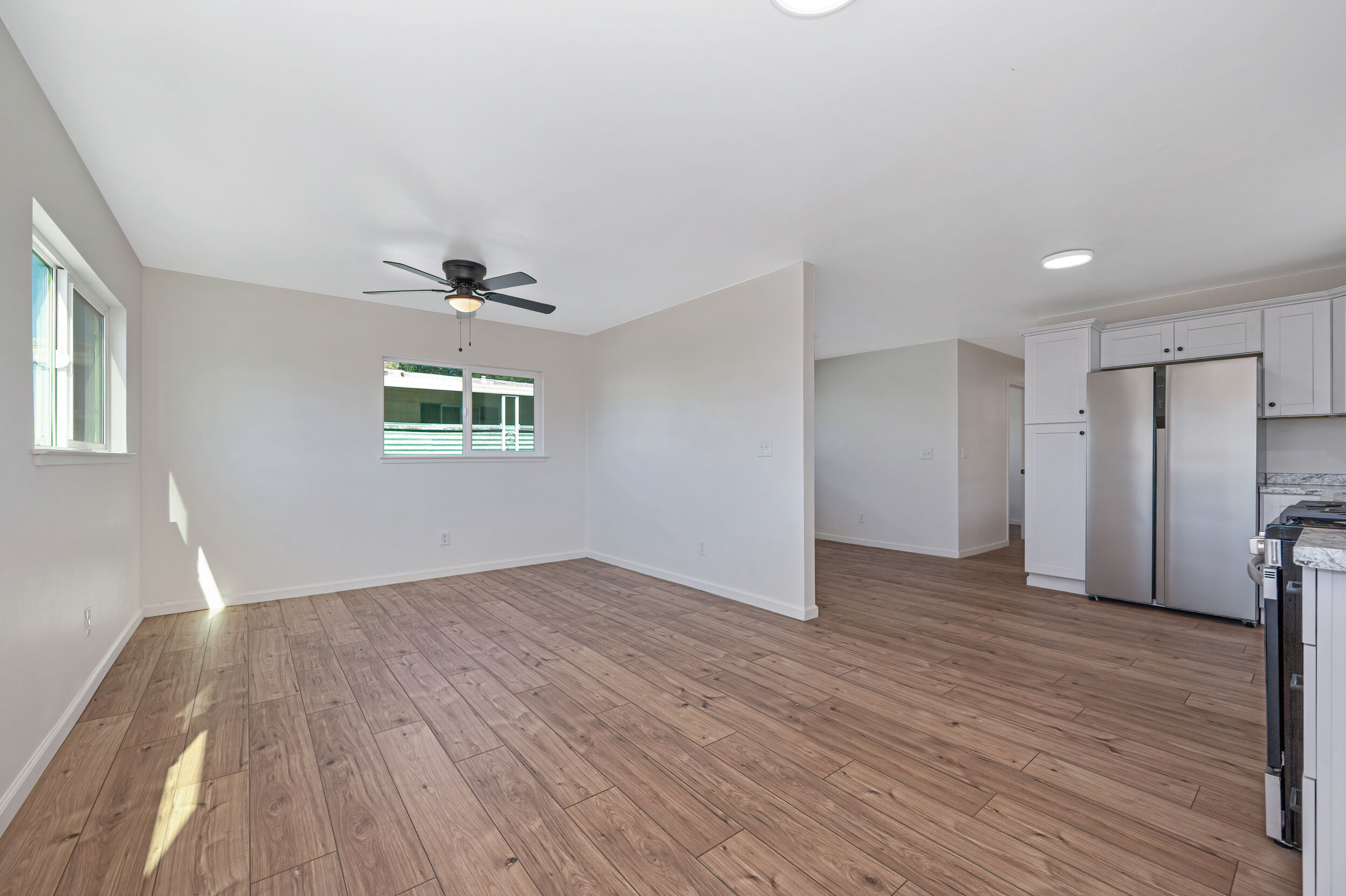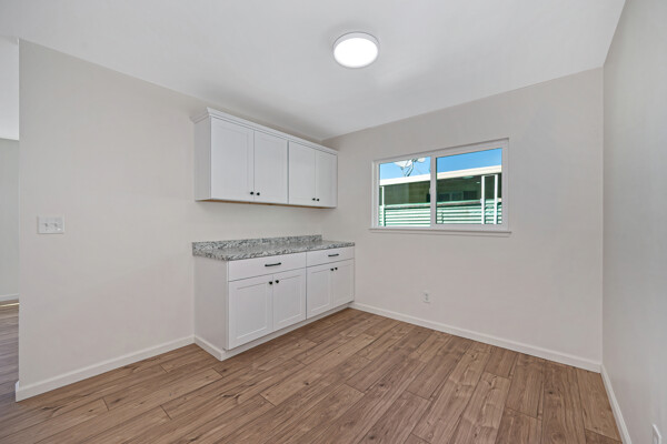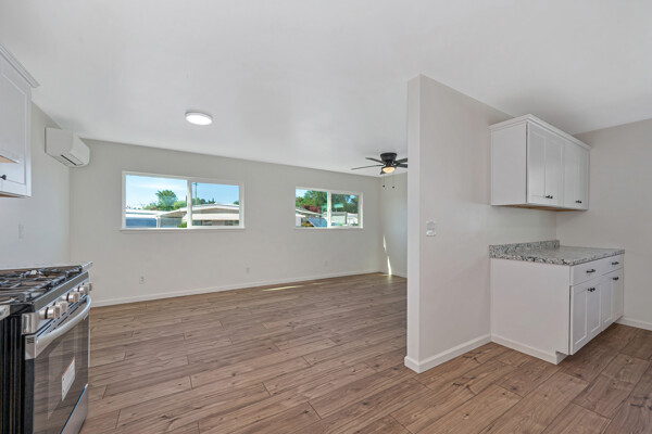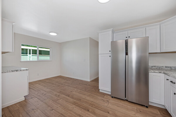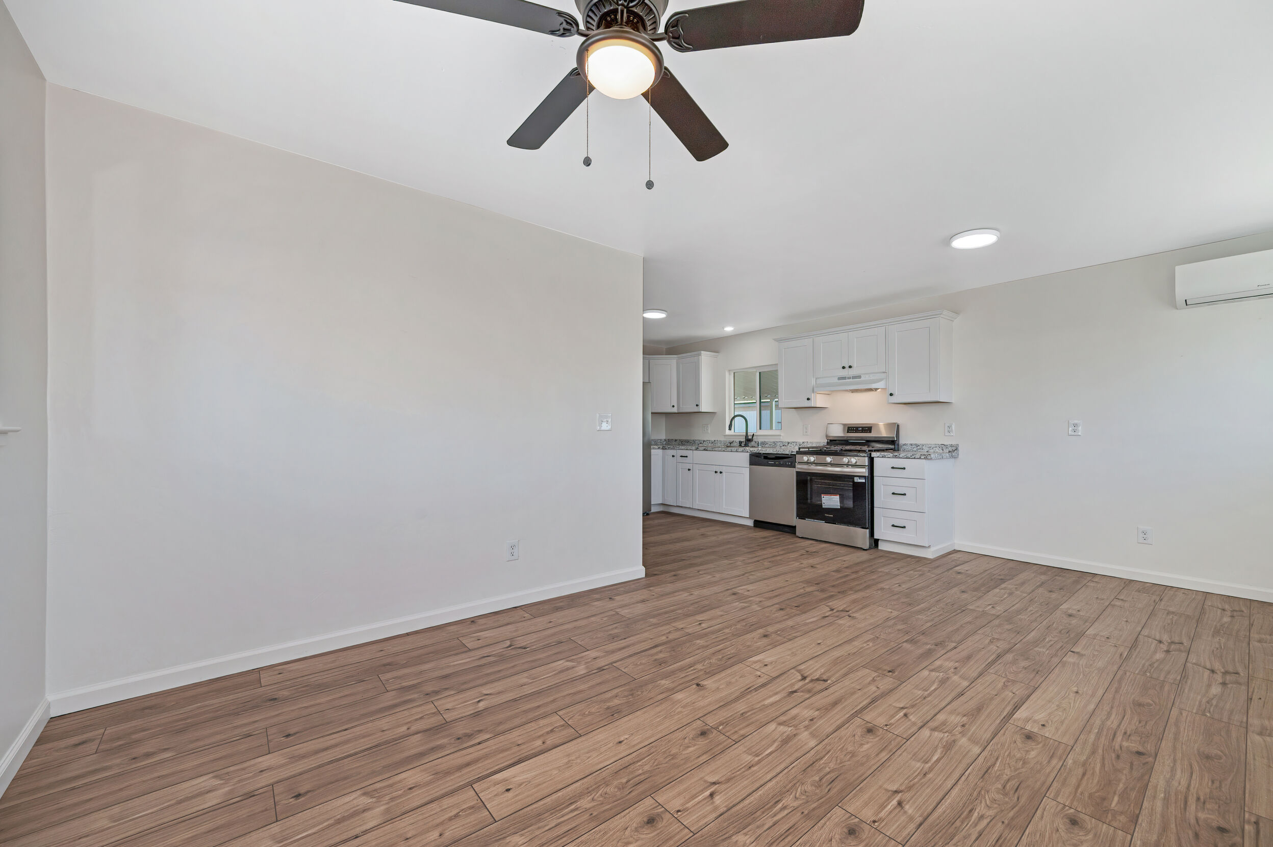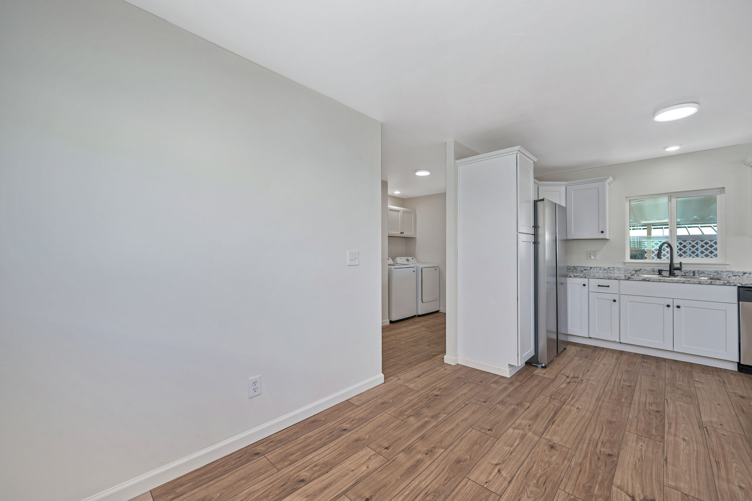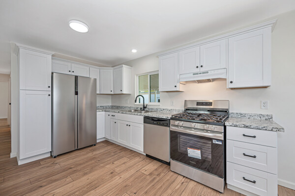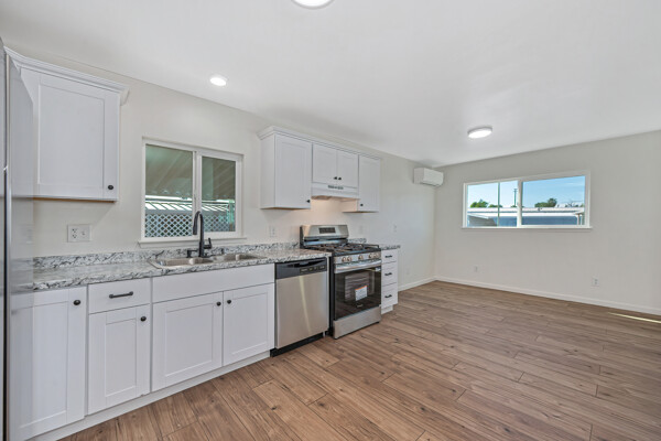 The kitchen has been completely updated with new cabinetry, new countertops, and a full suite of brand-new appliances—including stove, dishwasher, refrigerator, and washer and dryer—all included with the home.