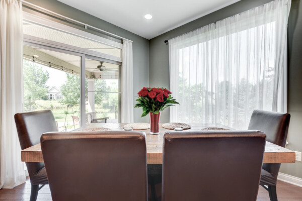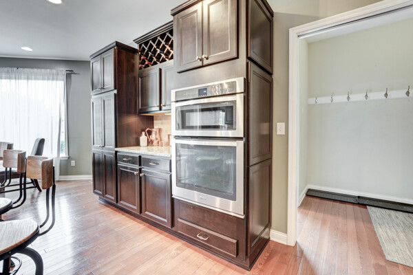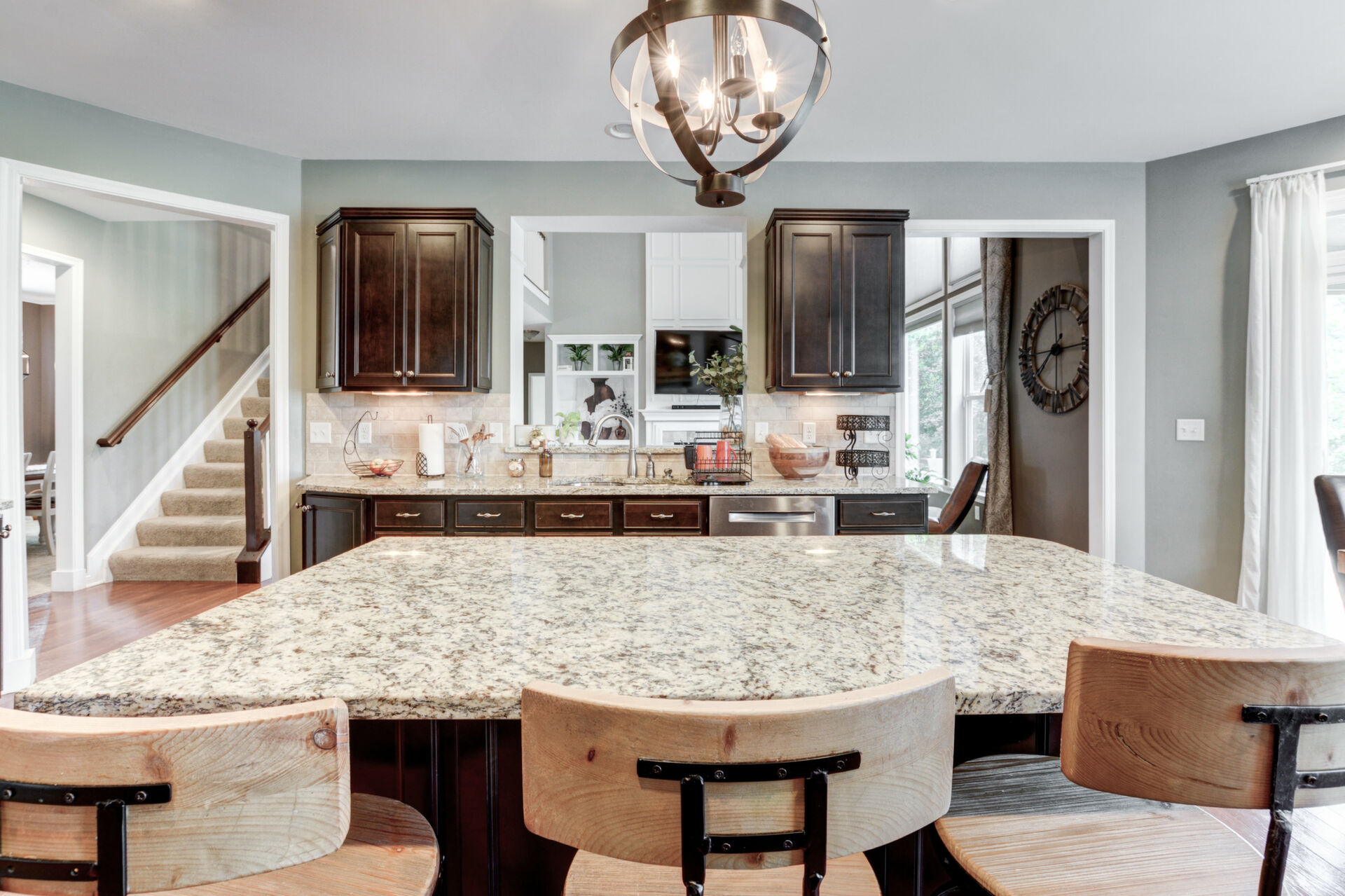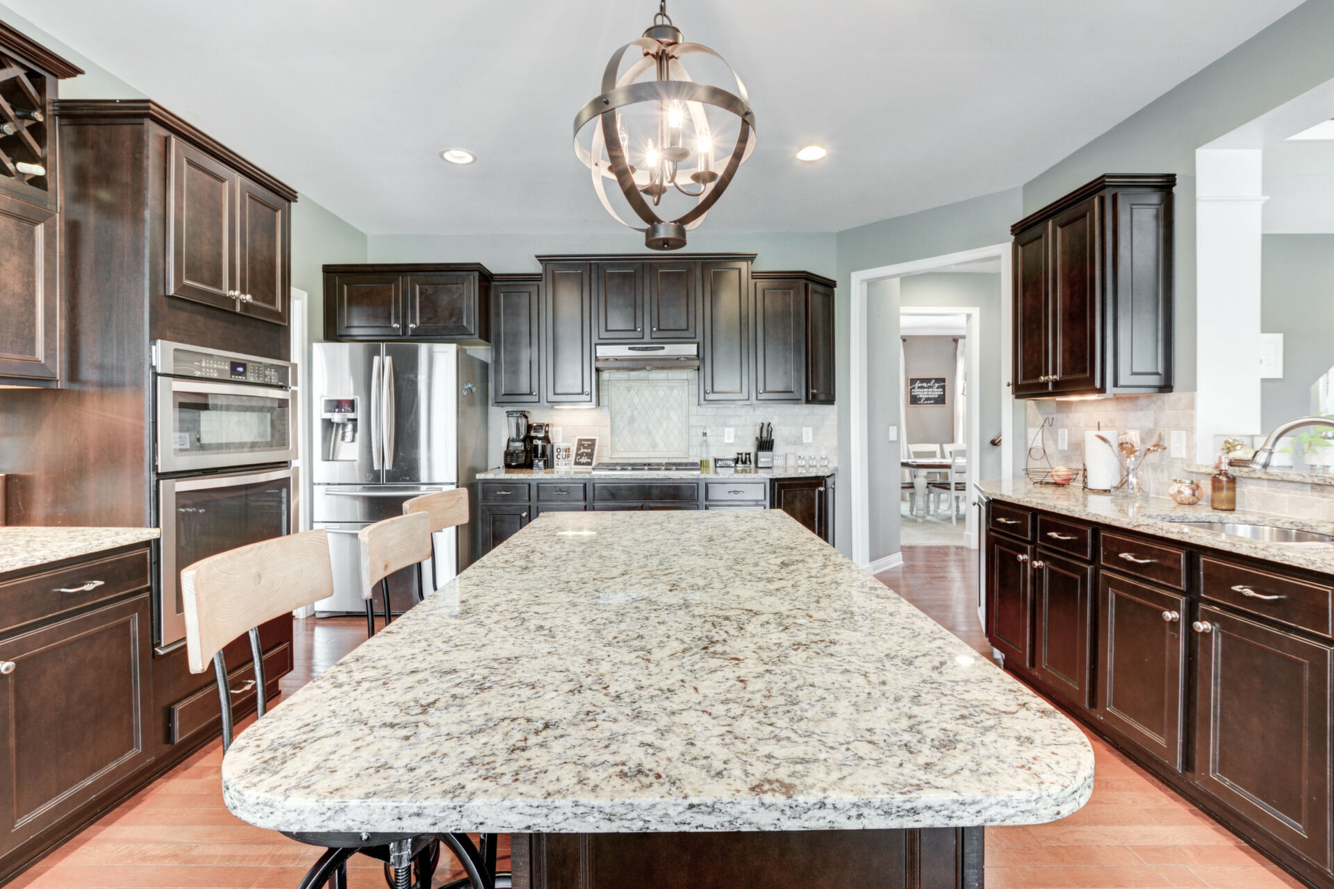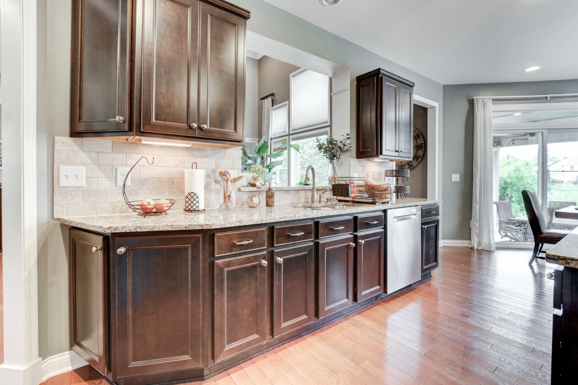 The gourmet kitchen is designed to impress, offering rich espresso cabinetry, stainless steel appliances, granite countertops, and a spacious dining area. Custom display windows frame the scenic backyard, flooding the space with natural light.
