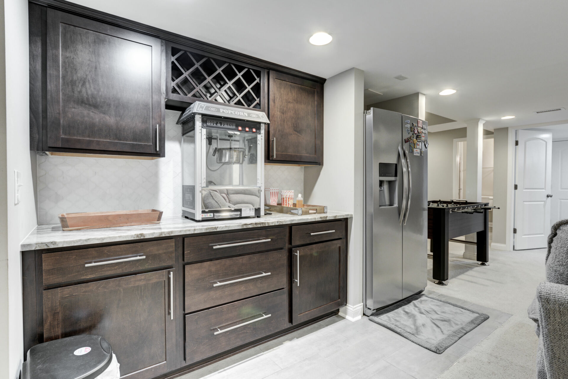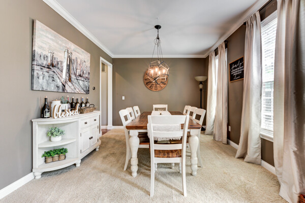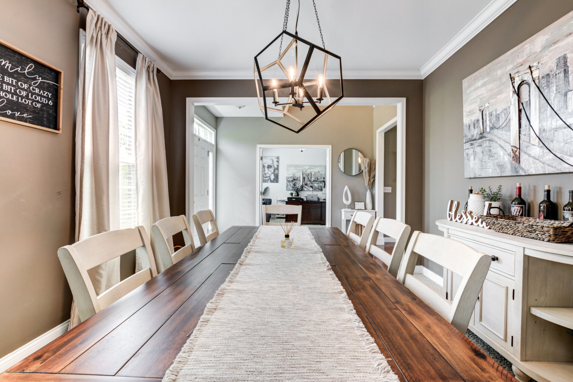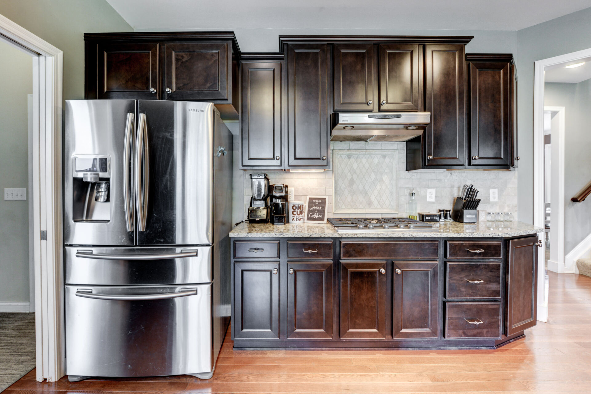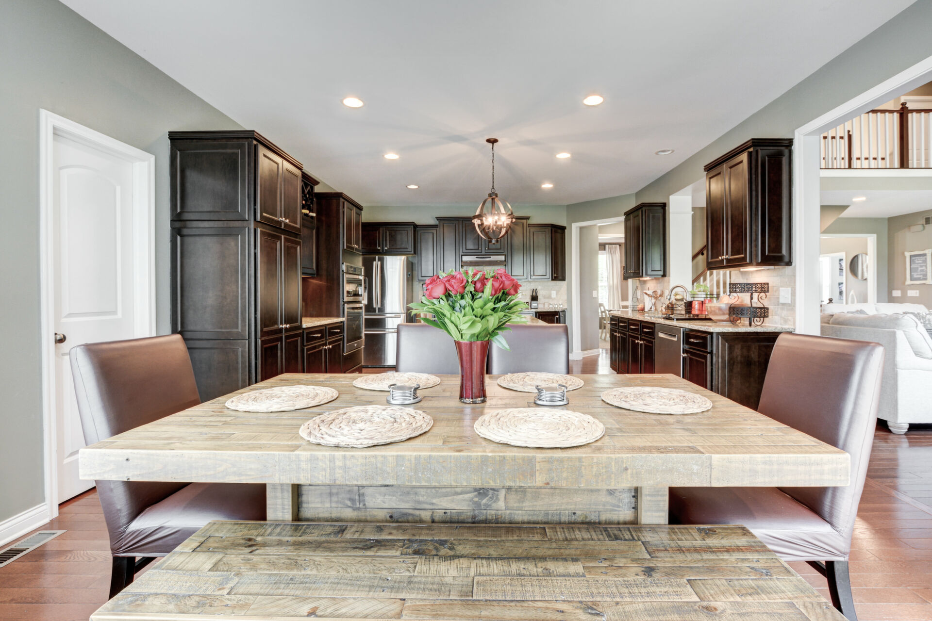 The gourmet kitchen is designed to impress, offering rich espresso cabinetry, stainless steel appliances, granite countertops, and a spacious dining area. Custom display windows frame the scenic backyard, flooding the space with natural light.