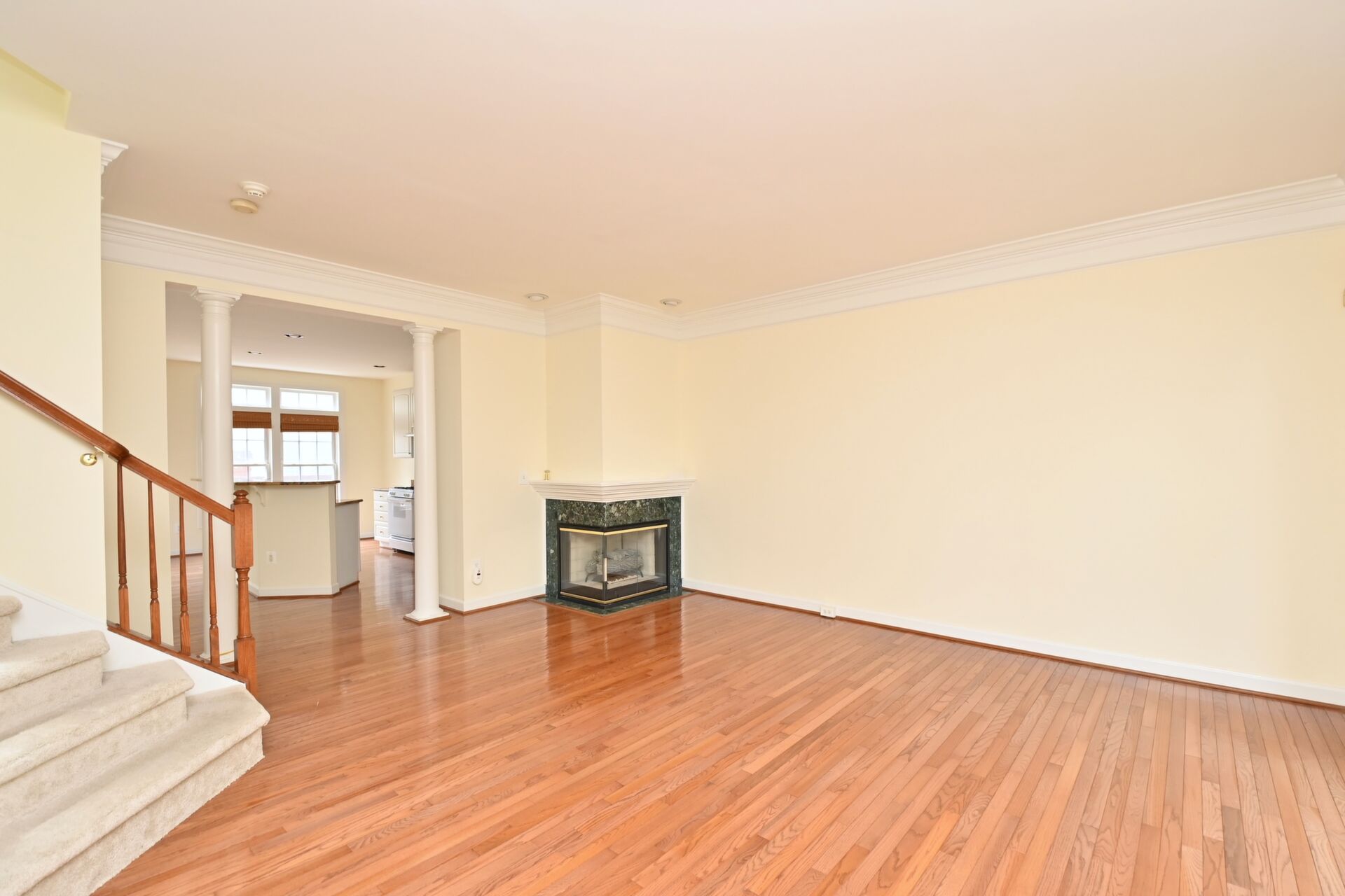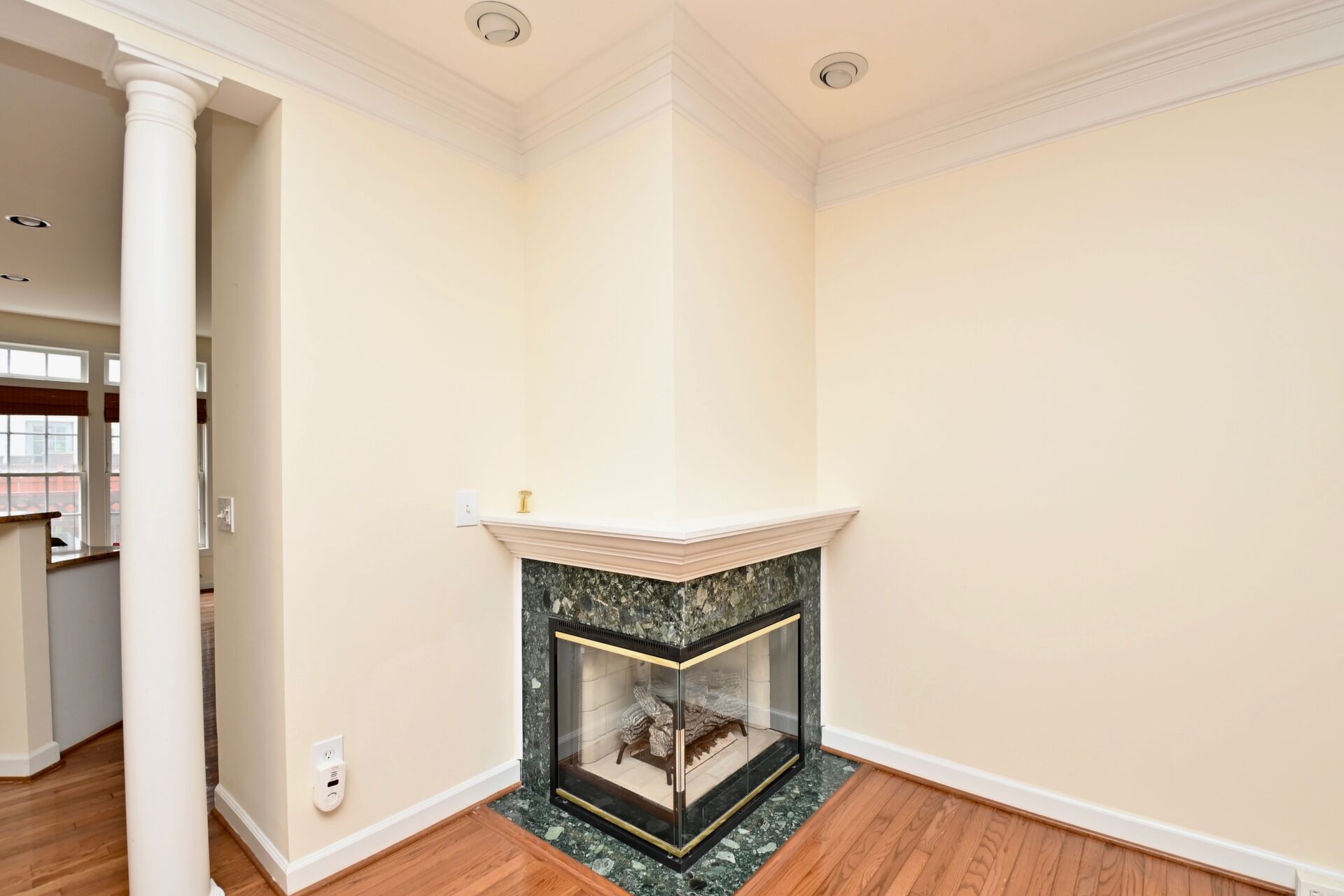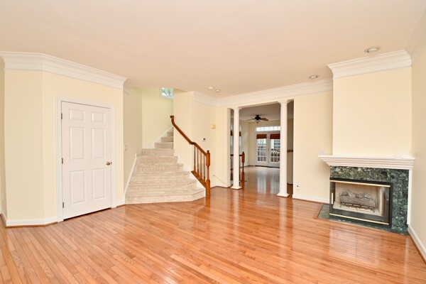 This home features a cozy fireplace, hardwood floors, crown molding, and so much more.