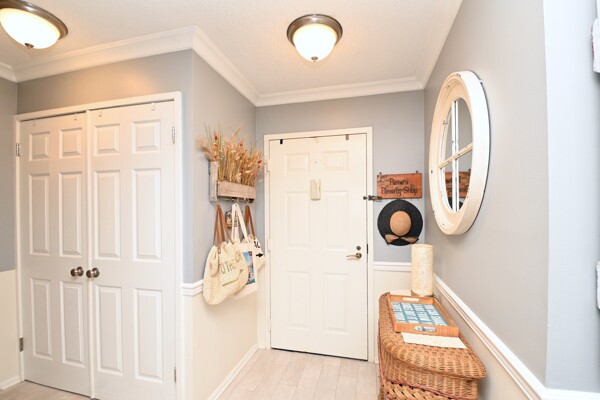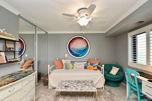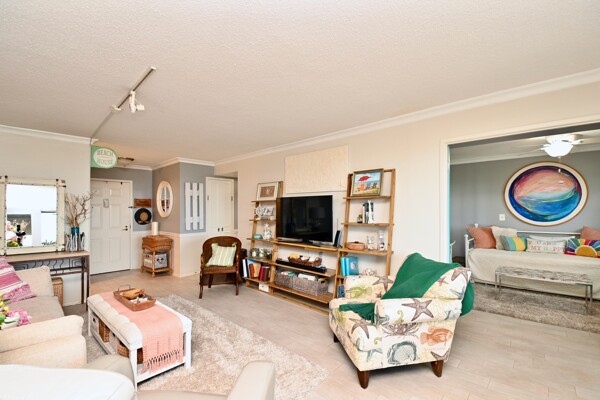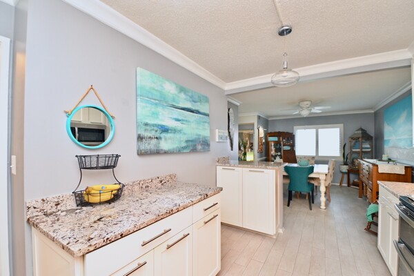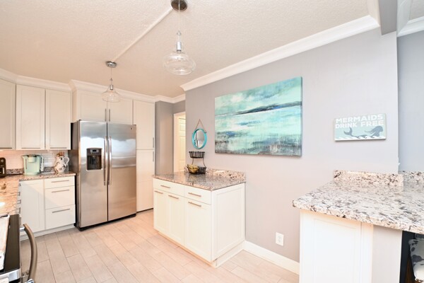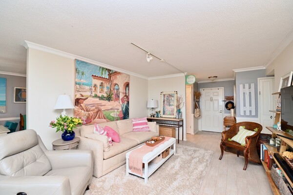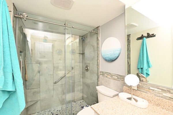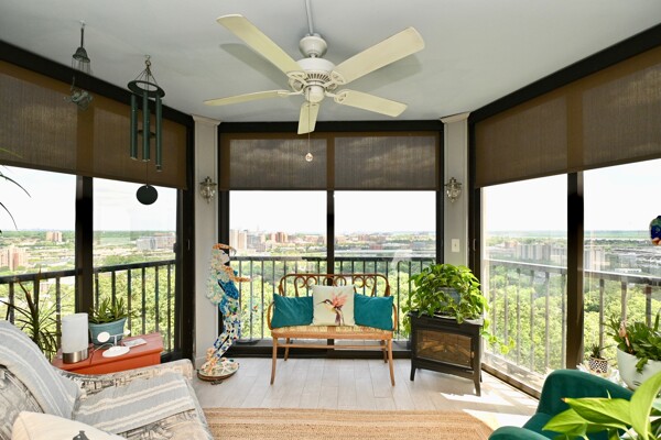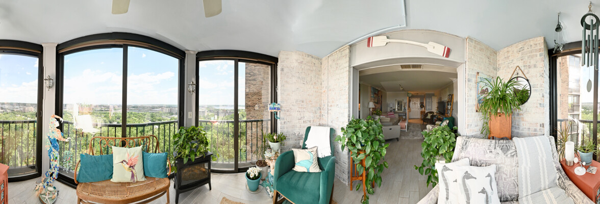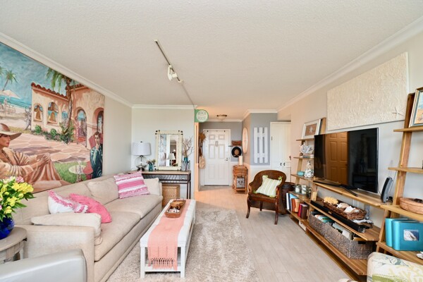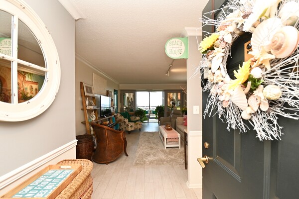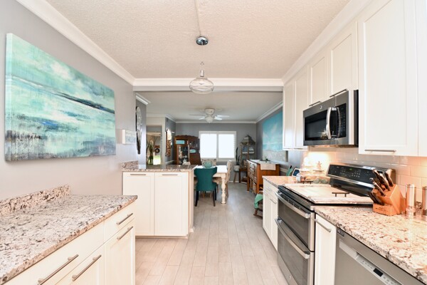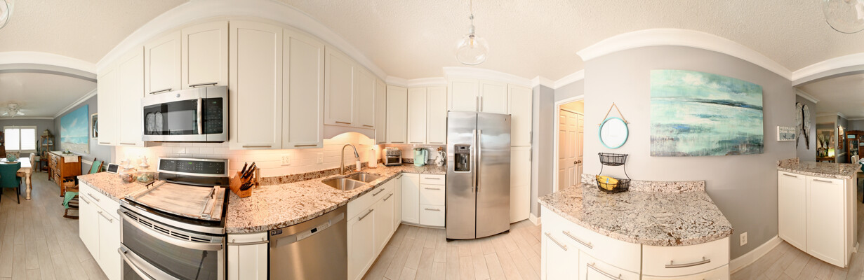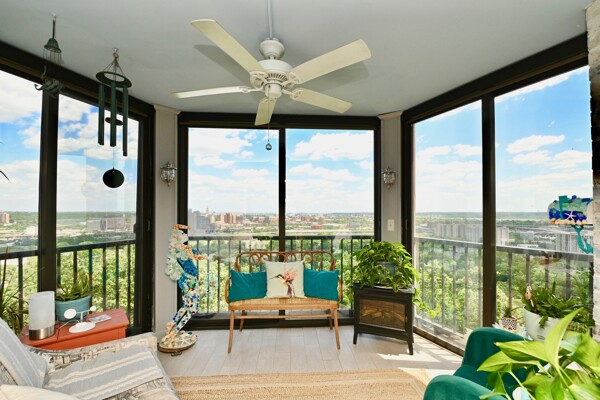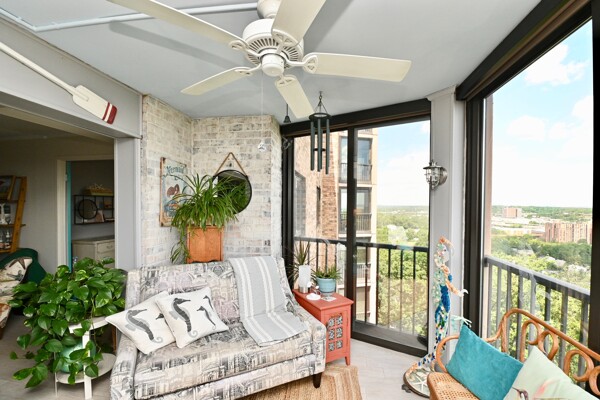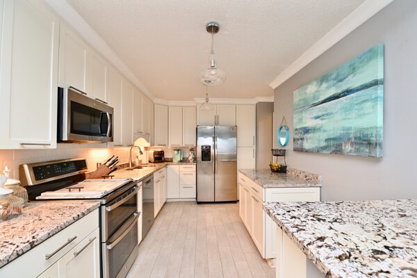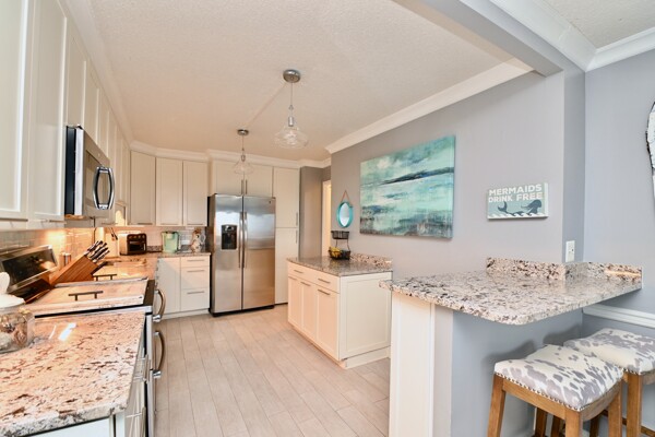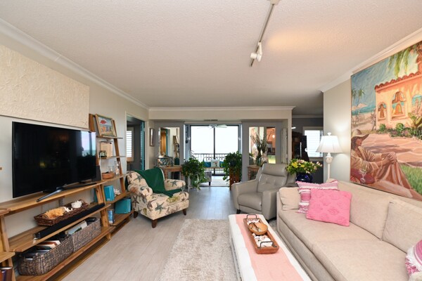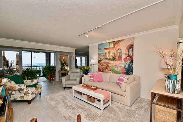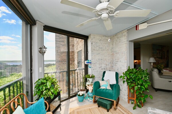Large living room with enclosed balcony offering stunning views, primary bedroom with private bath and walk-in closet, and a second bedroom suite as well; fully updated and open kitchen with island seating and so much more.