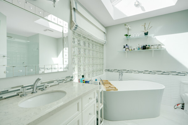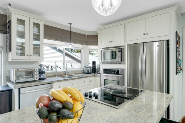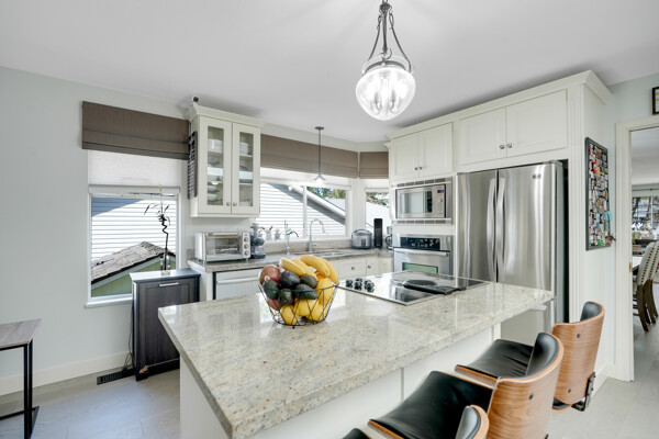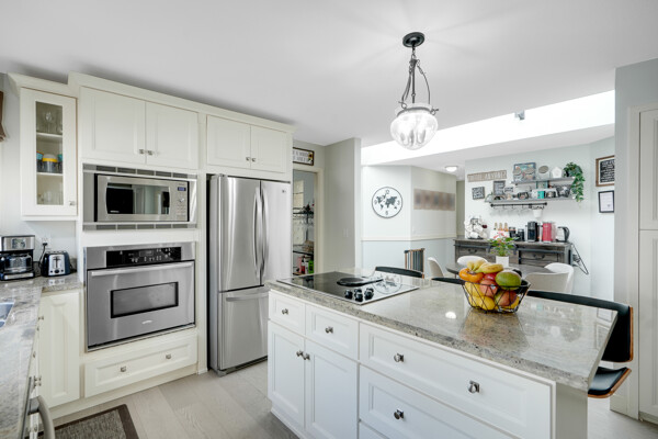 dream with a cooktop island, stainless steel appliances, and a convenient built-in pantry. Skylights illuminate the space, complemented by air