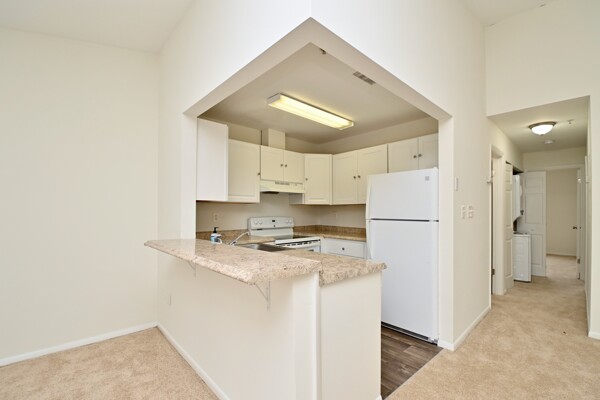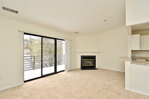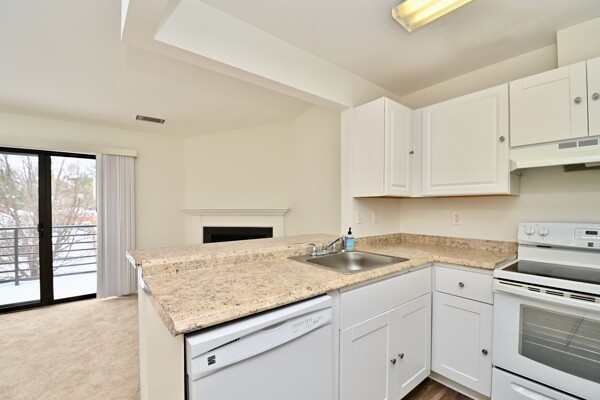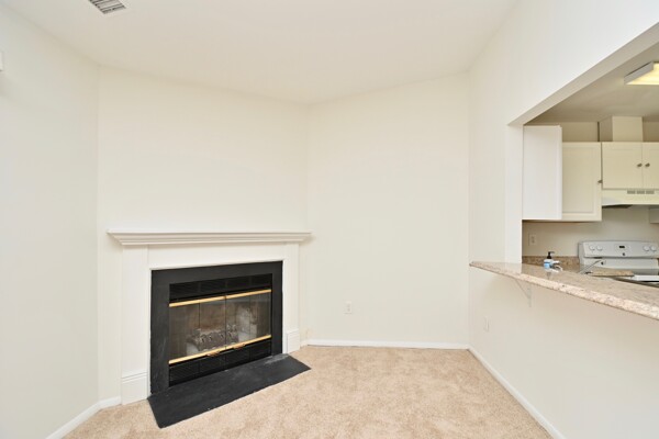 This home features an open floor plan for the main living area with a cozy fireplace in the living room and island seating at the kitchen. Your primary bedroom has its own bath and large closet and there is a washer dryer in the unit. It also has fresh paint and new carpet!