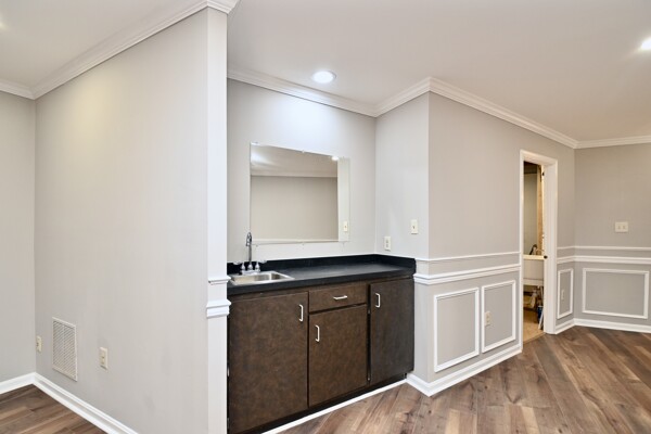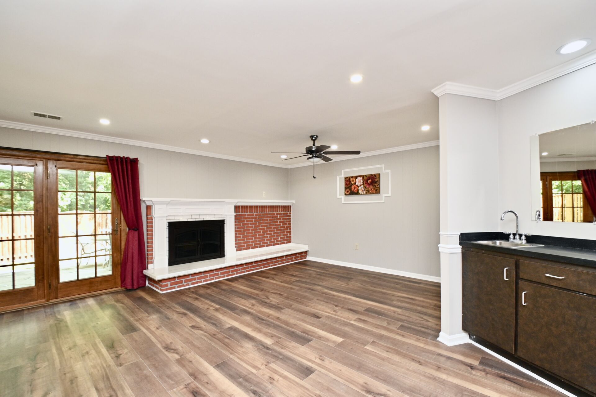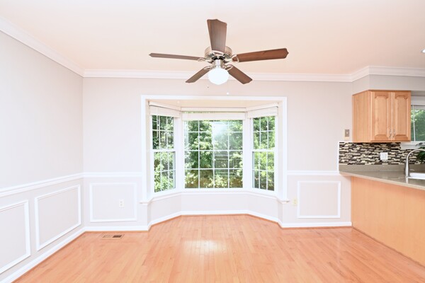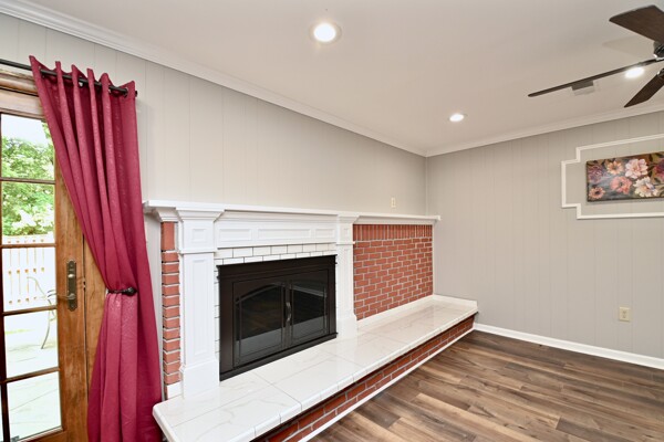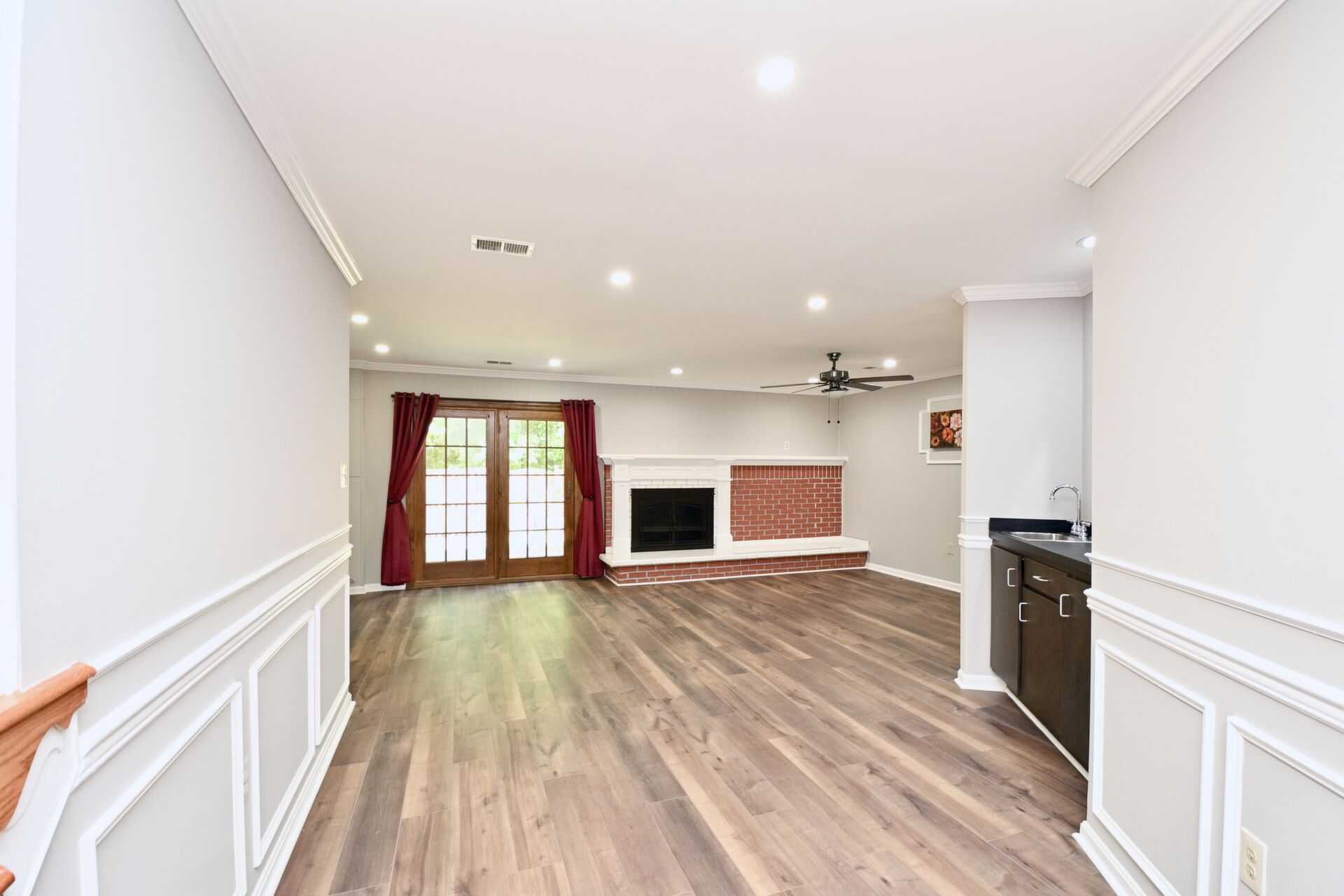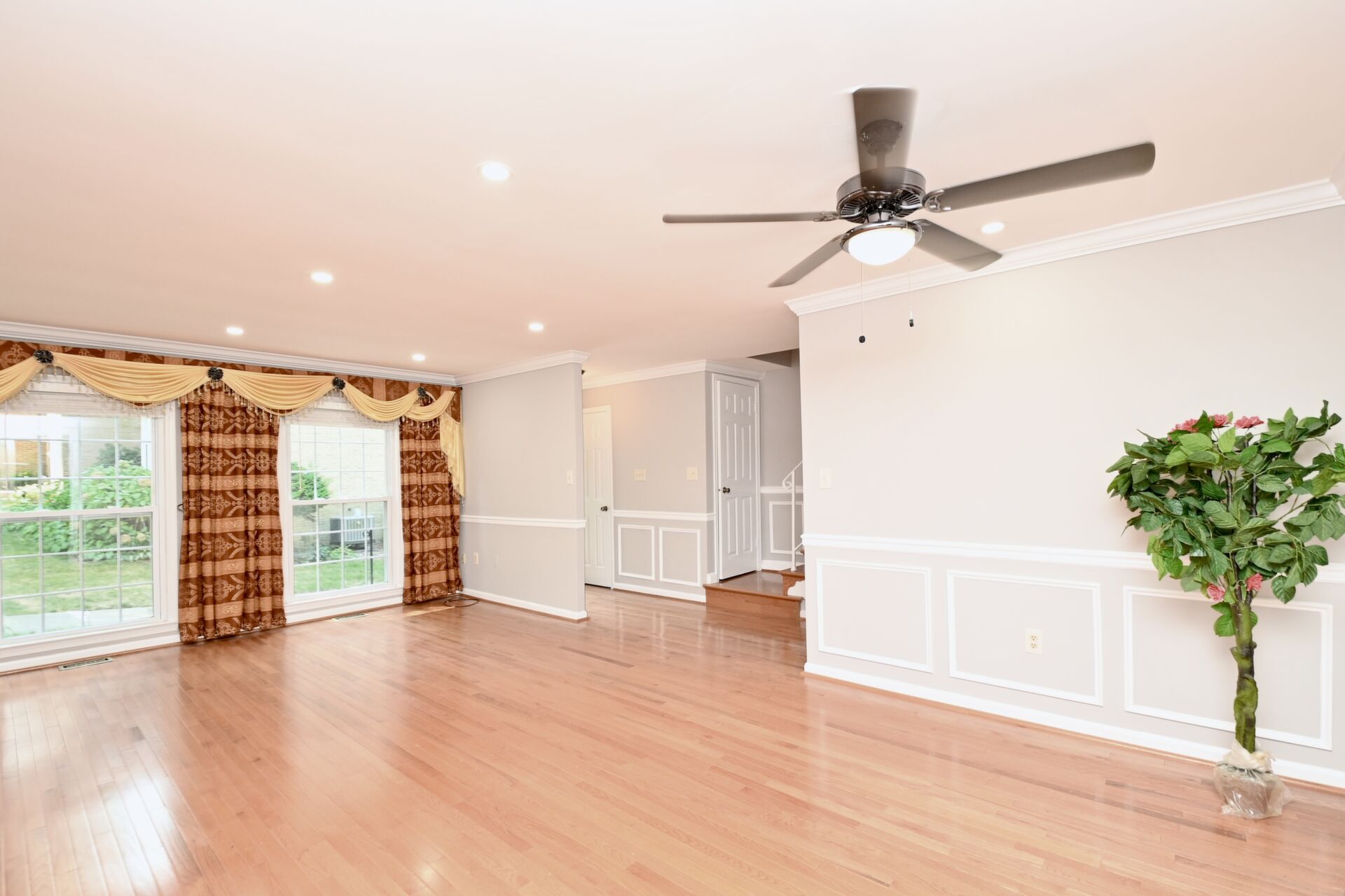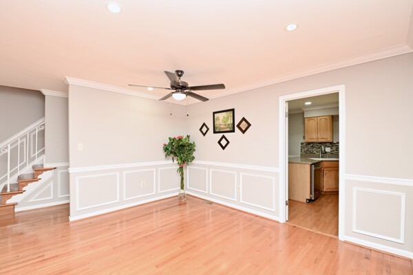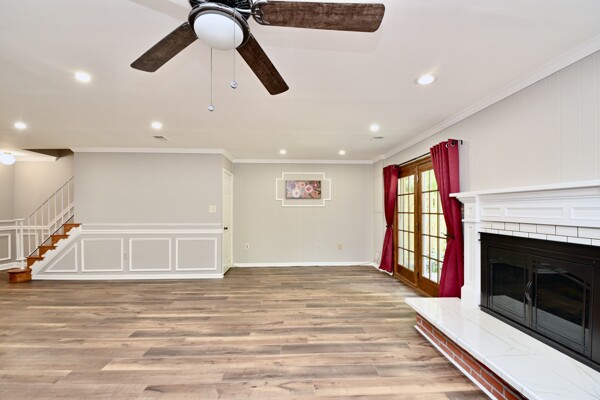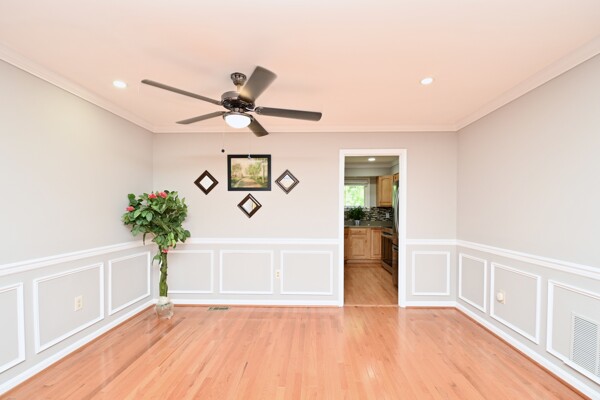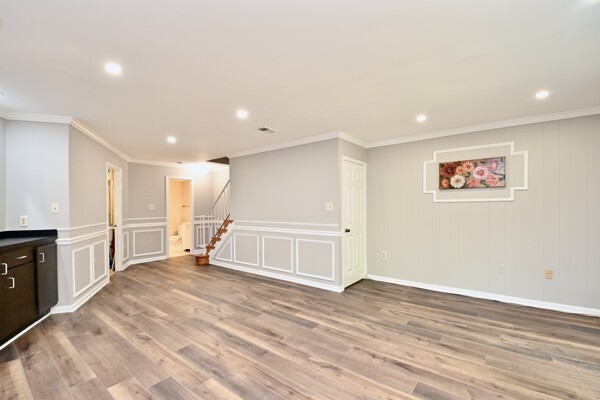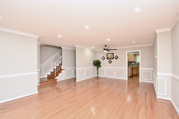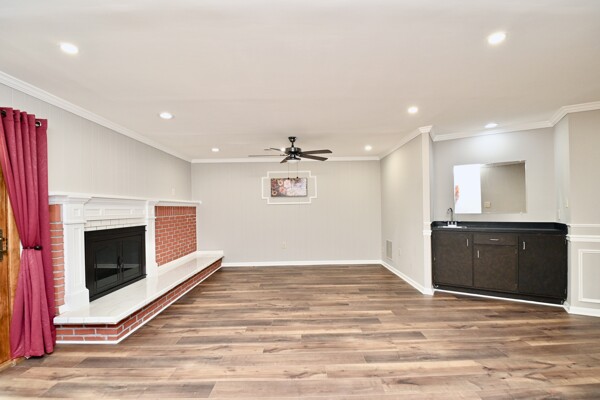 This home boasts a large living/dining room, kitchen/family room, gleaming hardwood floors, crown molding, a cozy fireplace in the recreation with a wet bar and so much more.