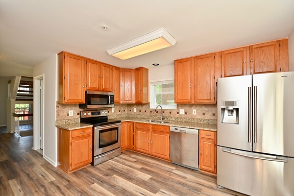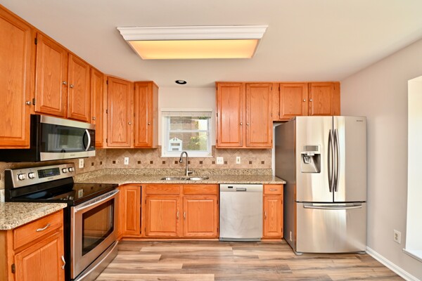 This home features luxury plank flooring, recessed lighting, kitchen with updates and stainless steel appliances, large living/dining combination with a fireplace and a 2nd fireplace in the recreation room!