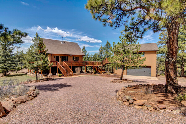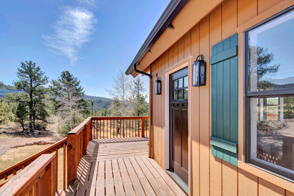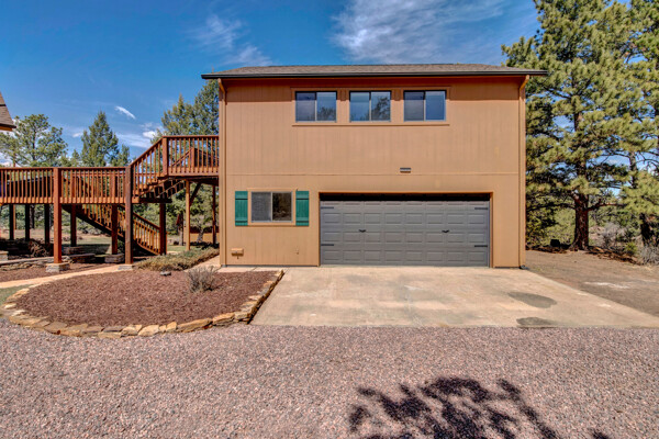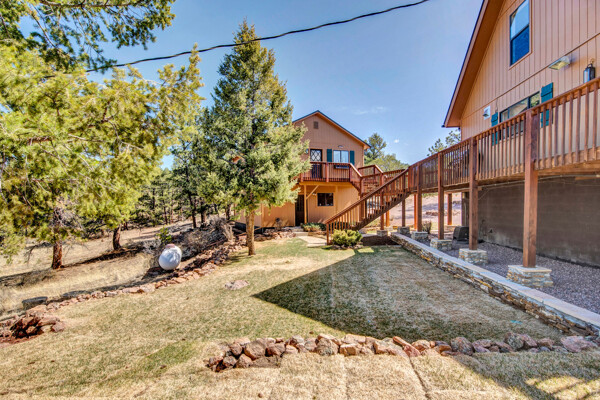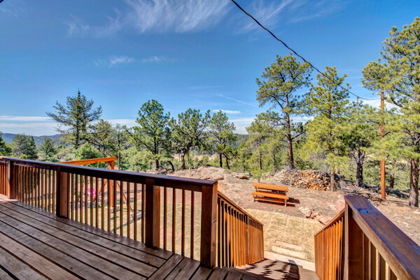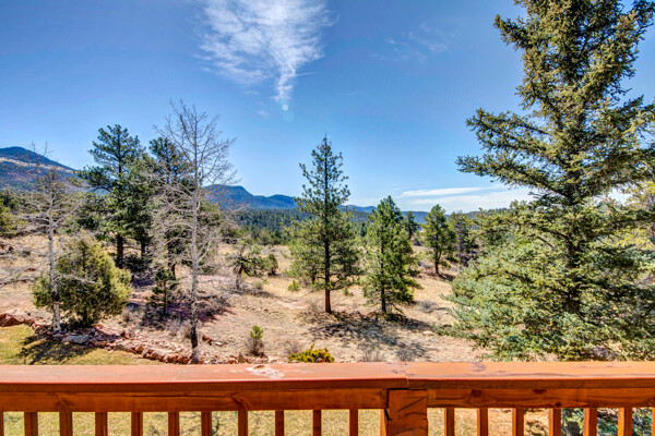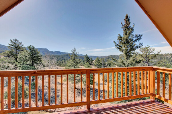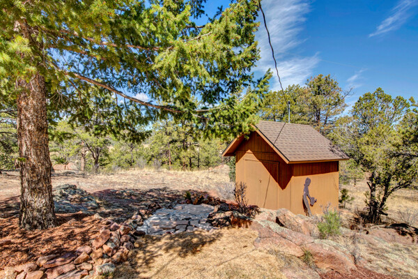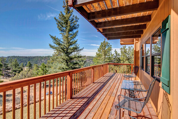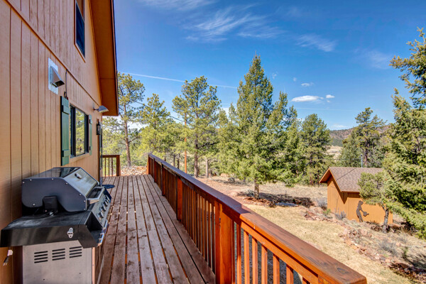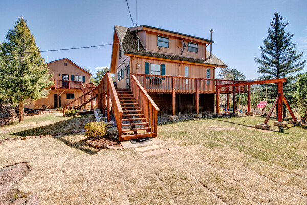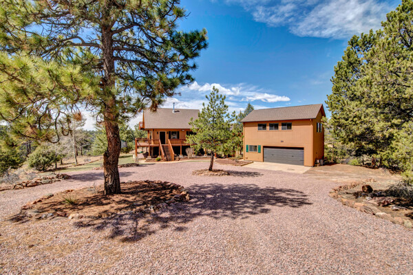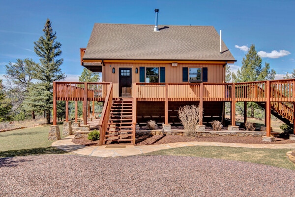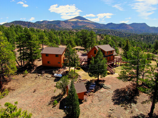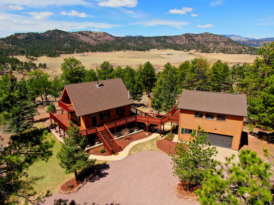 Imagine what Colorado living looks like, and here you go! A mountain lodge complete with a guest/bunkhouse, all remodeled with mountain modern finishes, situated on nearly 27 acres. This home closely neighbors over 500, 000 acres of BLM land; an outdoor enthusiast's dream. The main home brings in loads of bright, natural light, is open and airy with forest views from every window. Gorgeous, exposed natural wood beamed ceilings are a highlight on the main level, along with brand new LVT, ceramic tile, fresh paint and trim throughout. Enjoy the bright white kitchen with newer appliances. Also from the kitchen: access to the expansive deck (freshly power washed and stained) that surrounds the entire home. Upstairs, enjoy a balcony and fireplace from the owner's suite, attached to a beautifully renovated bath. The additional bedroom upstairs would make a wonderful office or guest room. Notice the fully finished, walkout basement is complete with laundry facilities, a large, finished storage room, and oversized bedroom. Let's head to the guest/bunkhouse via the attached deck breezeway. Over 600 sq ft. of living space is located directly above the oversized garage, this bonus room, could be used as guest quarters which could sleep more than 8, also use this space as a bunk house, game room, or mother-in-law suite, with the added full bath and large closet. During the Spring, a small stream flows through the property. You've struck gold with this property literally with an old, abandoned gold mine on the grounds. Trek over to the boulders and enjoy soaring views of the valley down below and of the clifftops of the BLM land. This property offers the possibility of adding on if you desire. Add a barn, additional shop, there are flat areas that make this very feasible. Never stress about guest parking as there is ample space. This is what Colorado is all about! Square footage is deemed reliable, buyer, and buyer's agent to verify square footage.