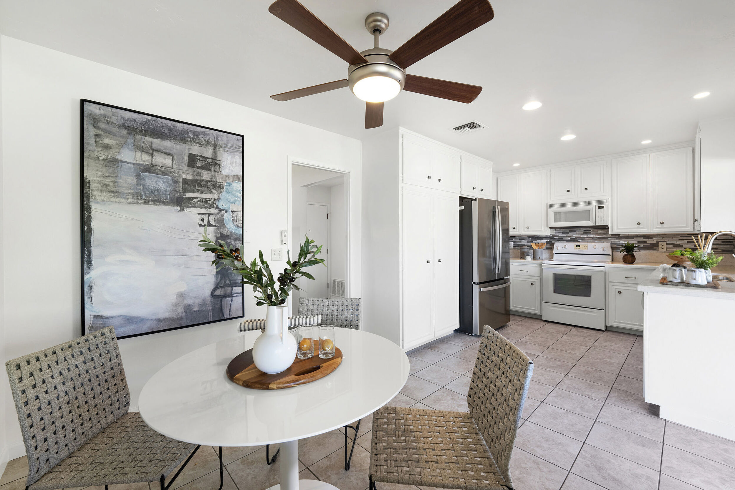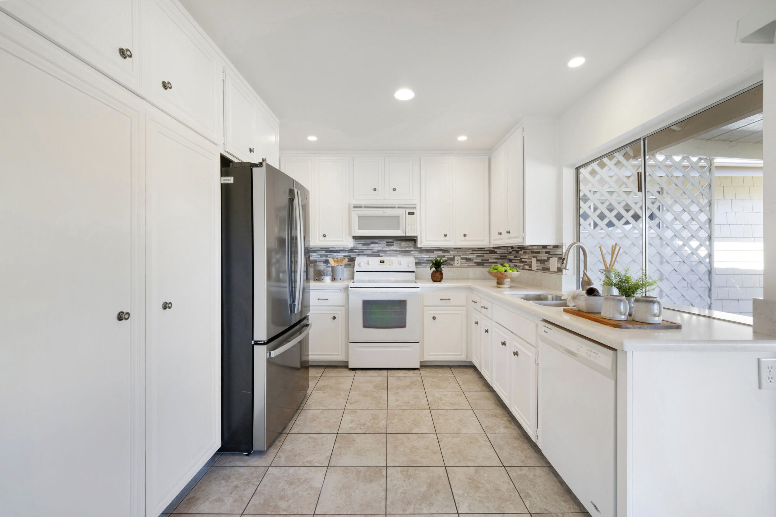 The interior is bright and functional, featuring a freshly painted interior (2025) and a well-designed layout that maximizes natural light. The kitchen area includes quartz countertops and a delightful breakfast nook that adds everyday charm and practicality. Recent updates include a new furnace (2026), newer water heater (2024), and newer refrigerator (2024).