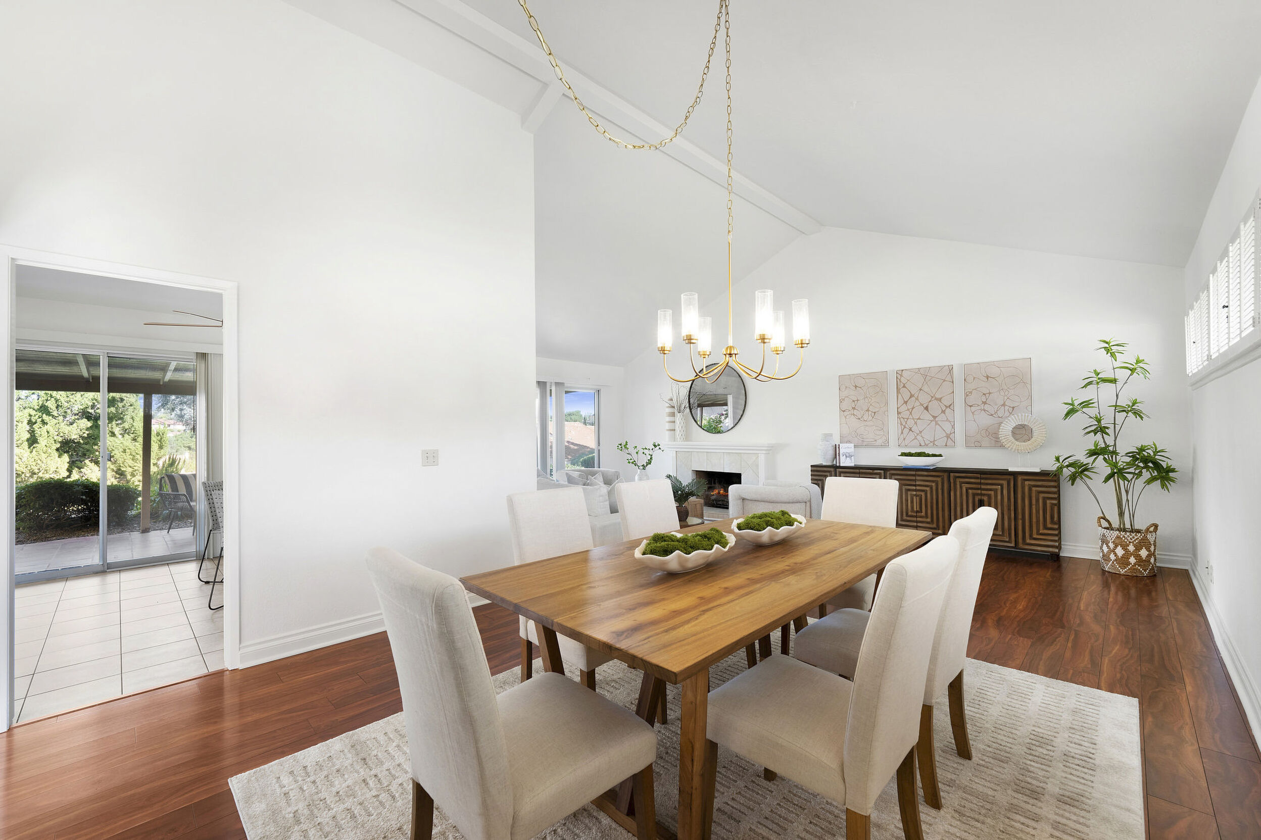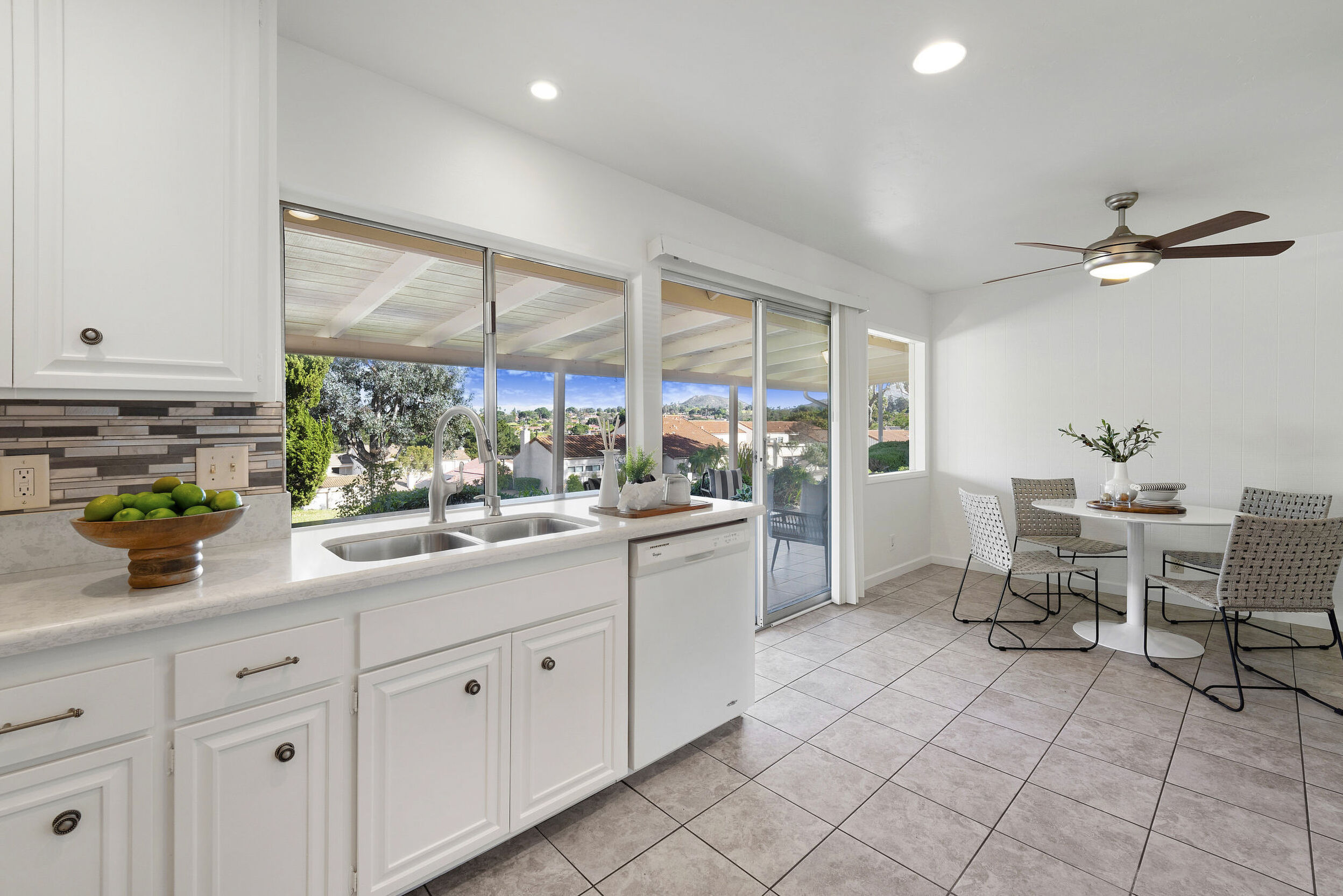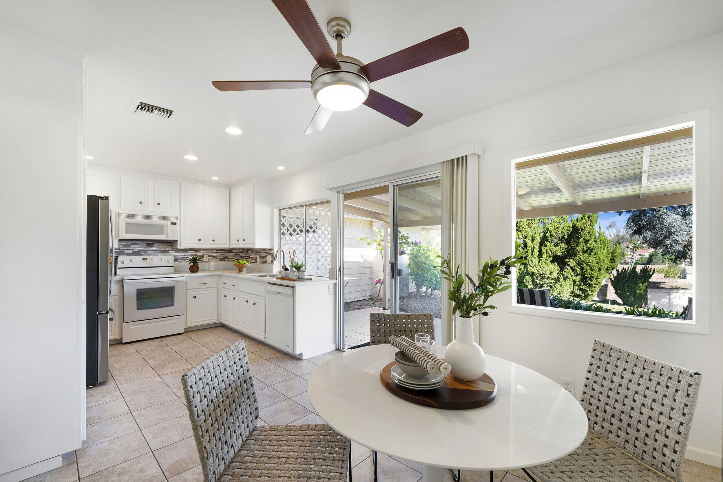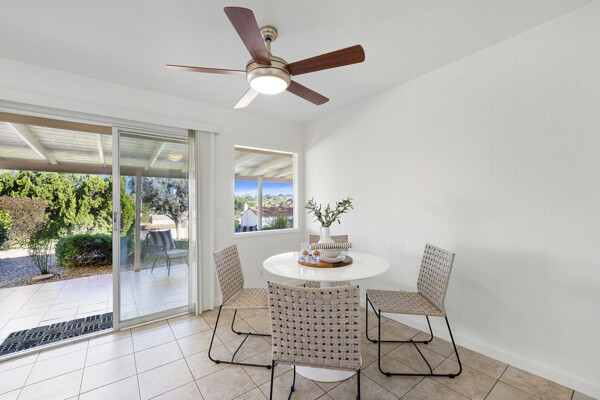 The spacious living area features vaulted ceilings and a full-size dining space, creating an open and inviting atmosphere framed by abundant windows. Sliding doors provide direct access to the private covered patio, extending the living space outdoors and offering pleasant views of the surrounding greenery and hillside vistas.