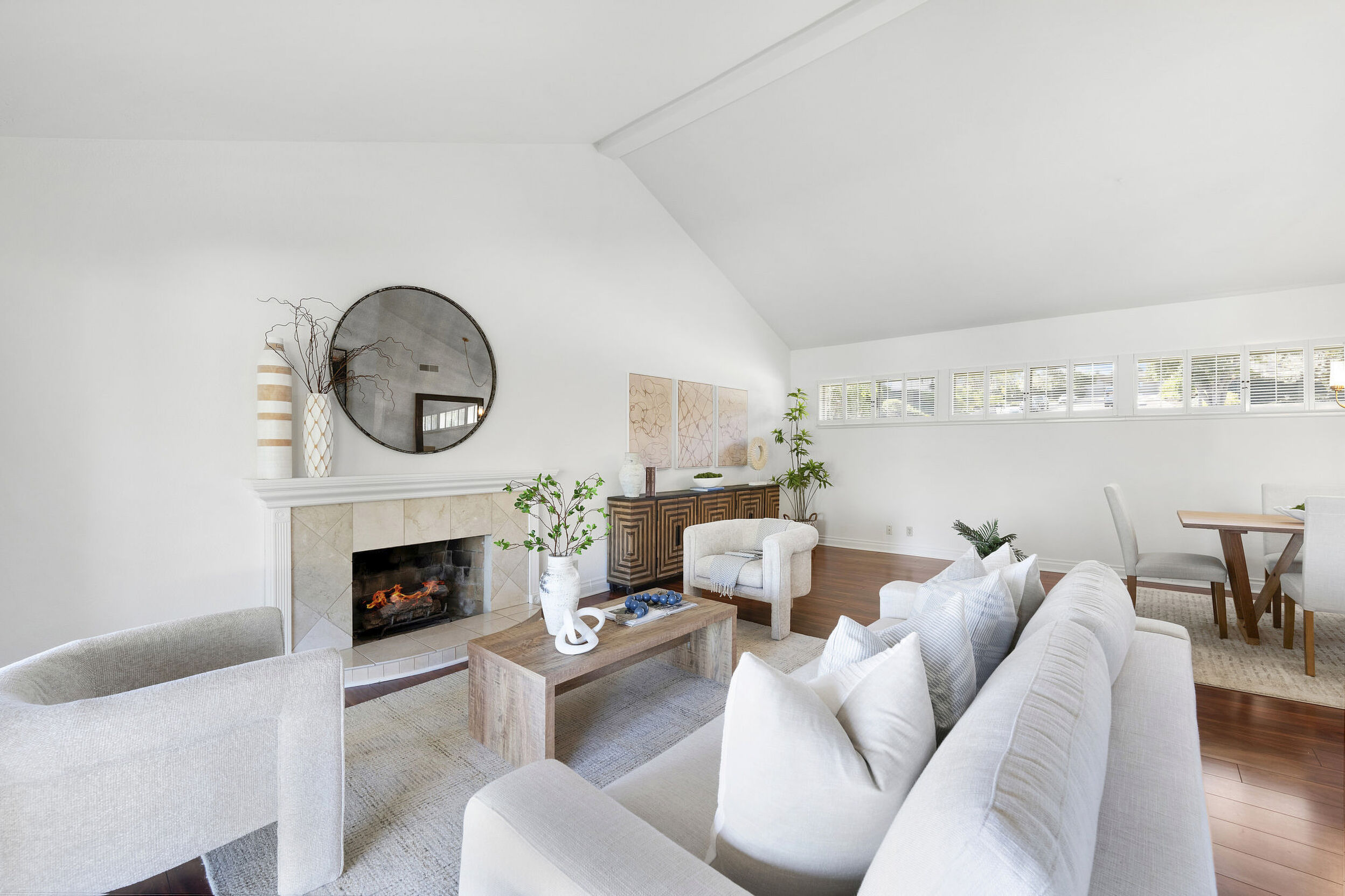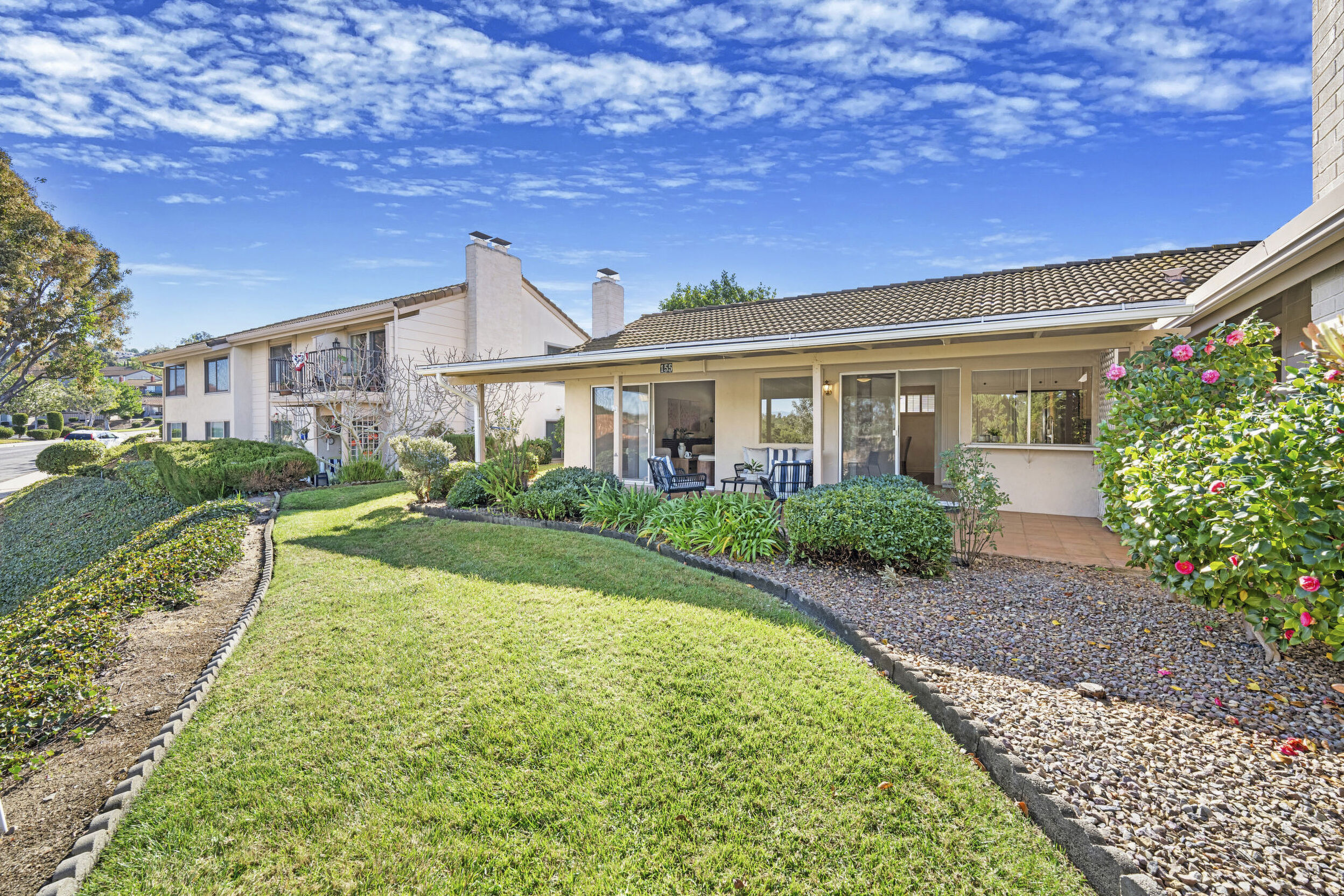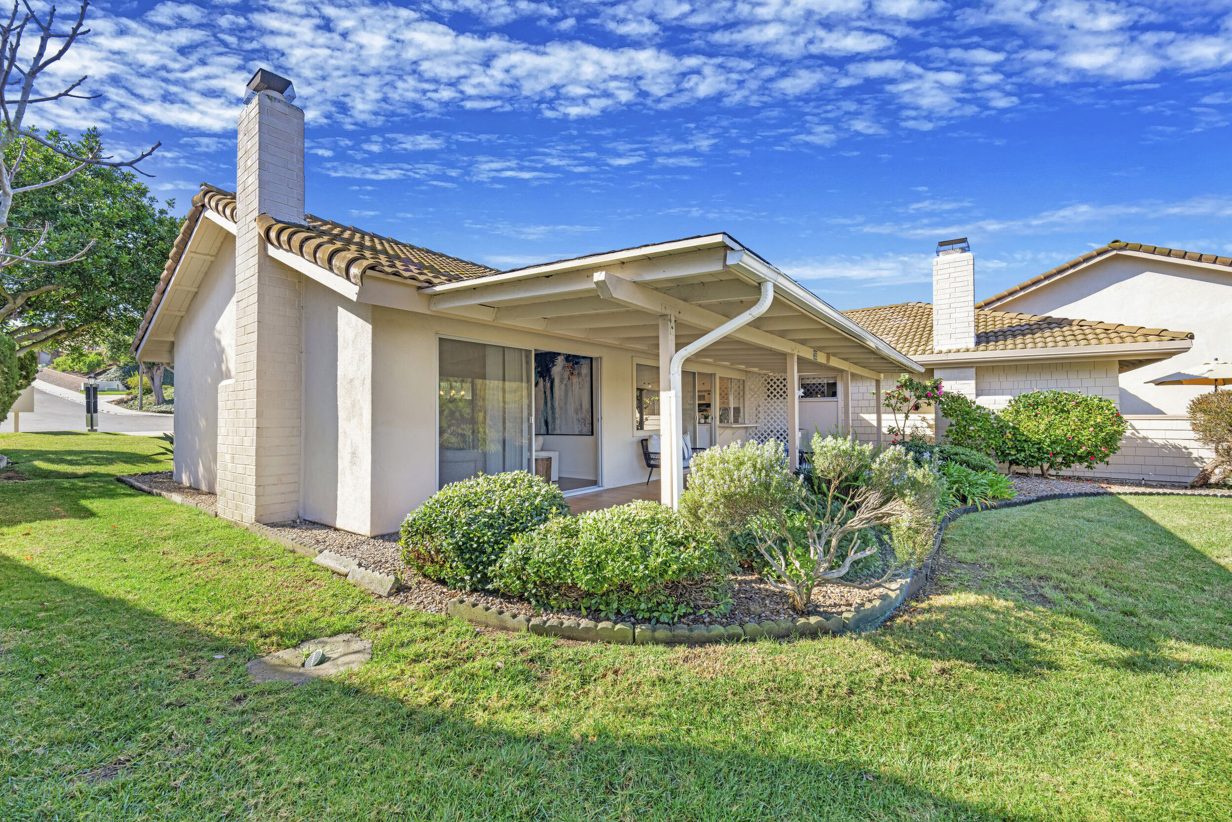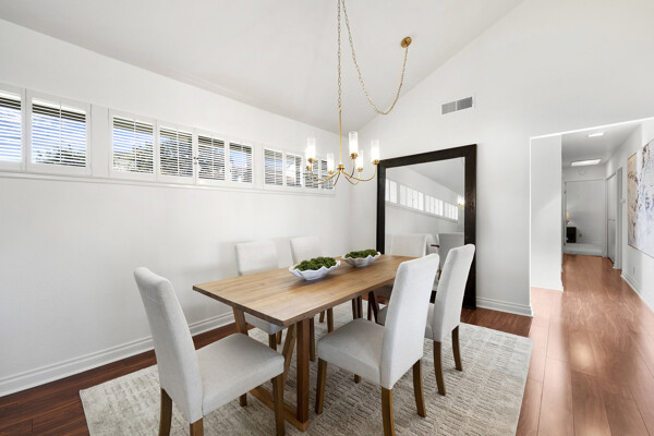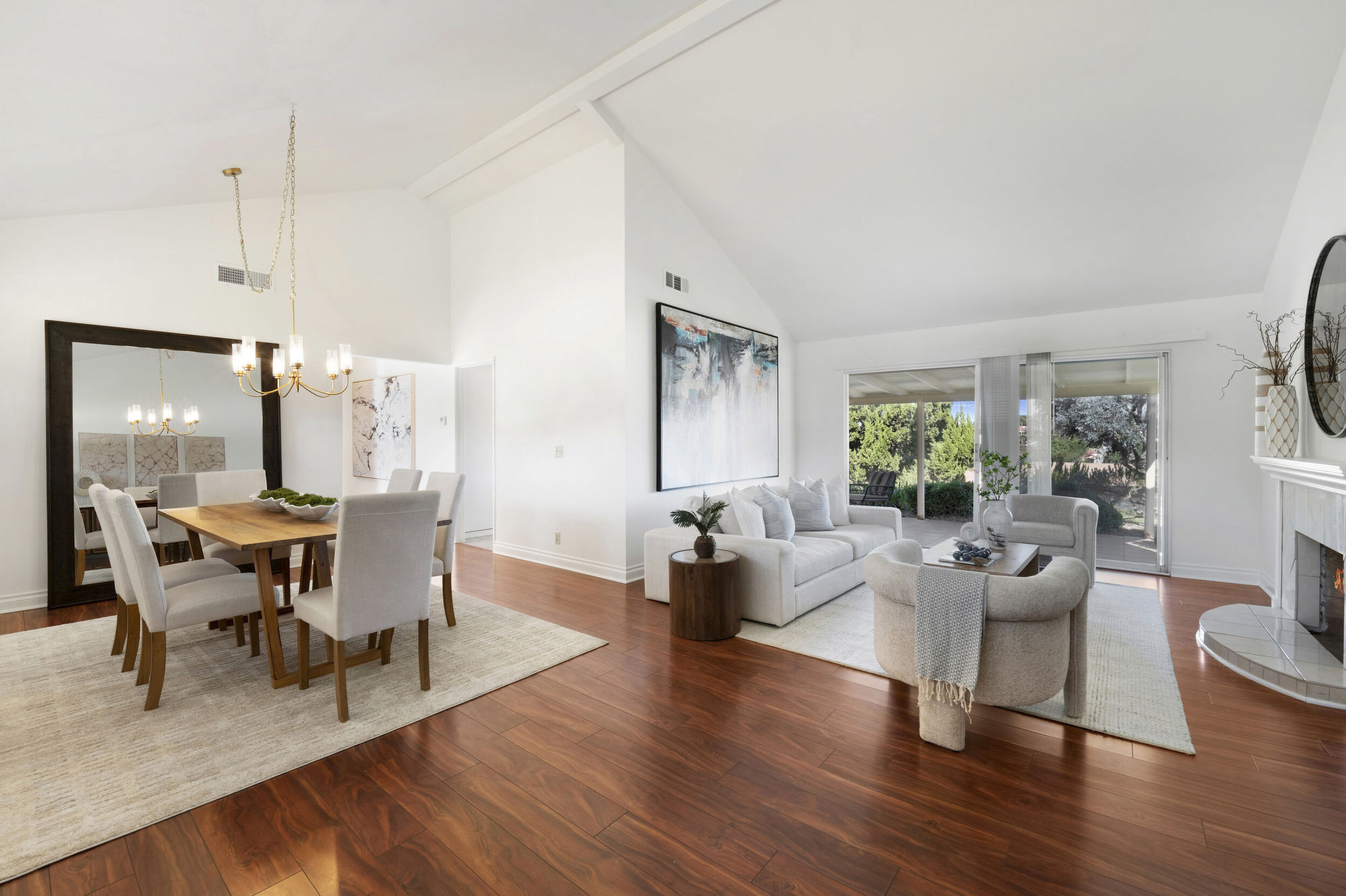 The spacious living area features vaulted ceilings and a full-size dining space, creating an open and inviting atmosphere framed by abundant windows. Sliding doors provide direct access to the private covered patio, extending the living space outdoors and offering pleasant views of the surrounding greenery and hillside vistas.
