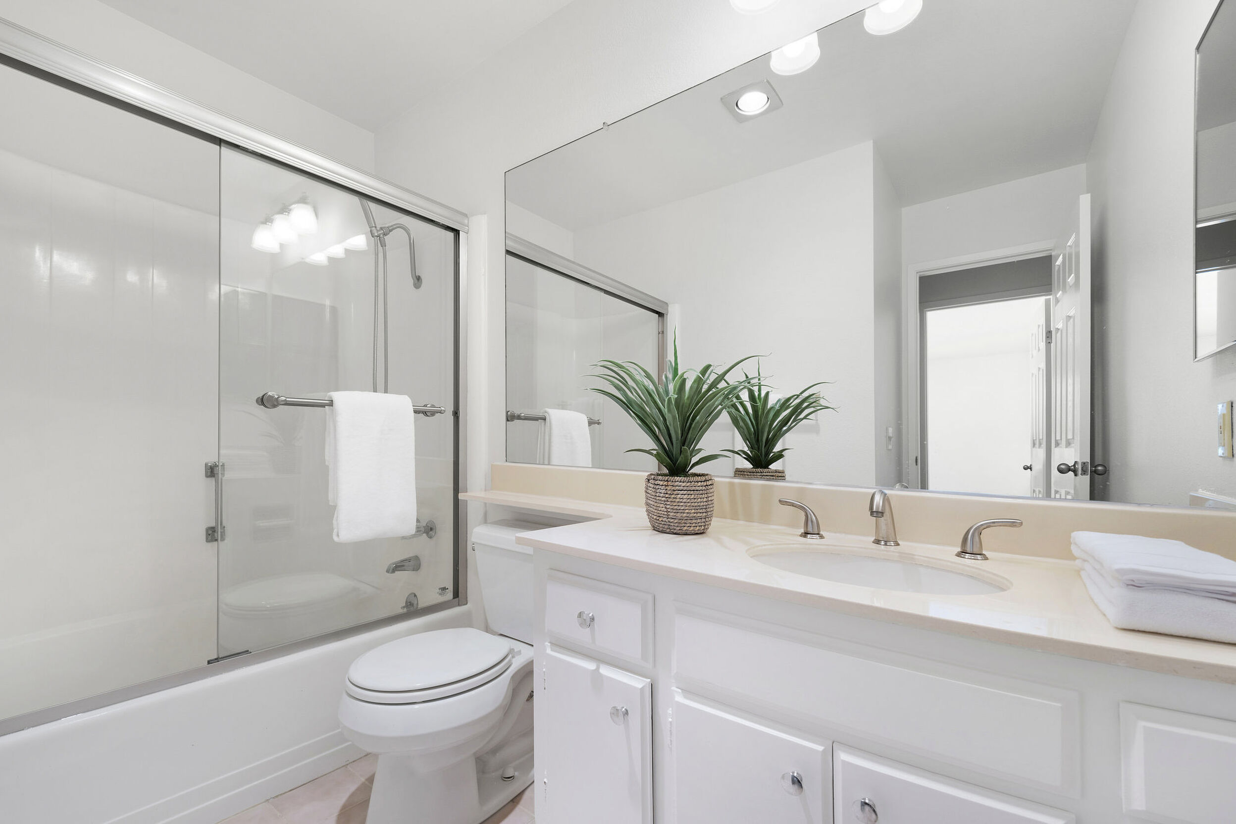 The oversized primary bedroom offers a comfortable retreat with ample closet space and a well-appointed bathroom featuring a separate vanity area and step-in shower, providing both function and privacy.
