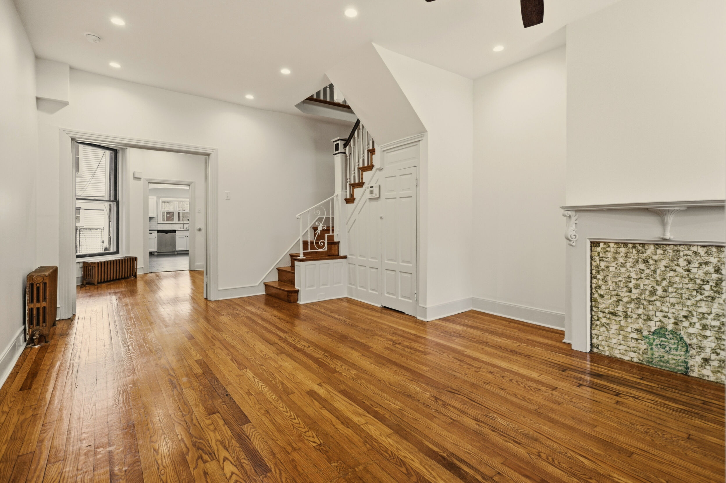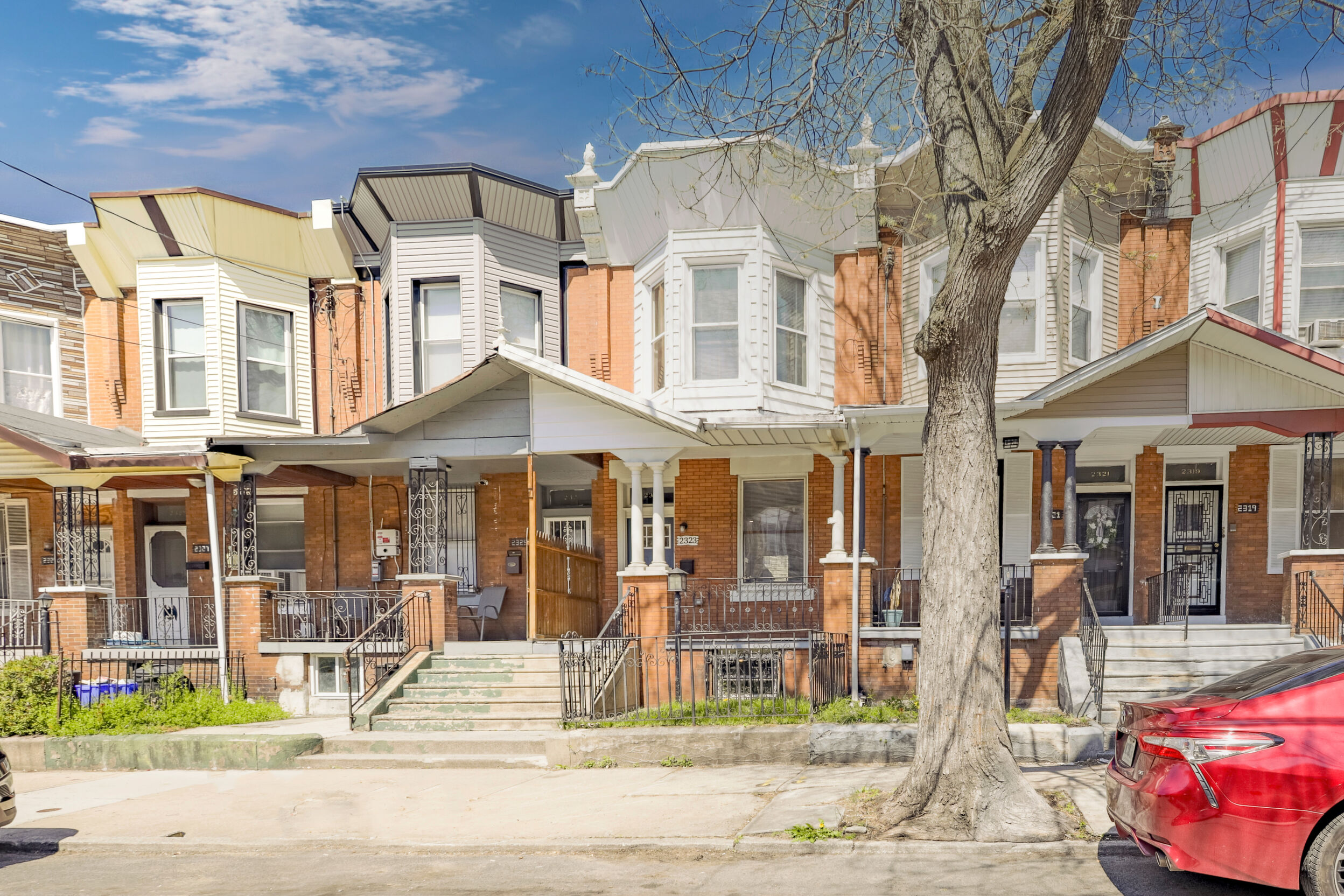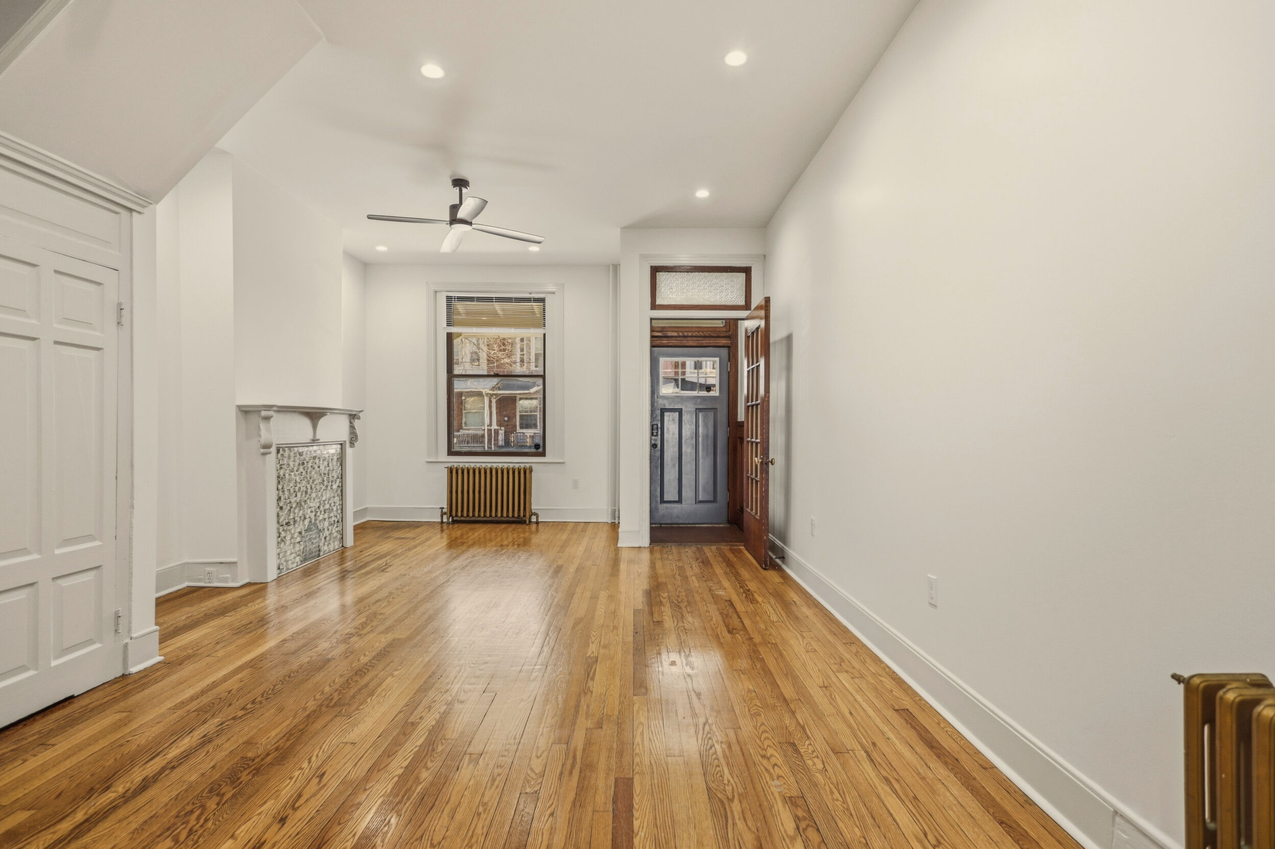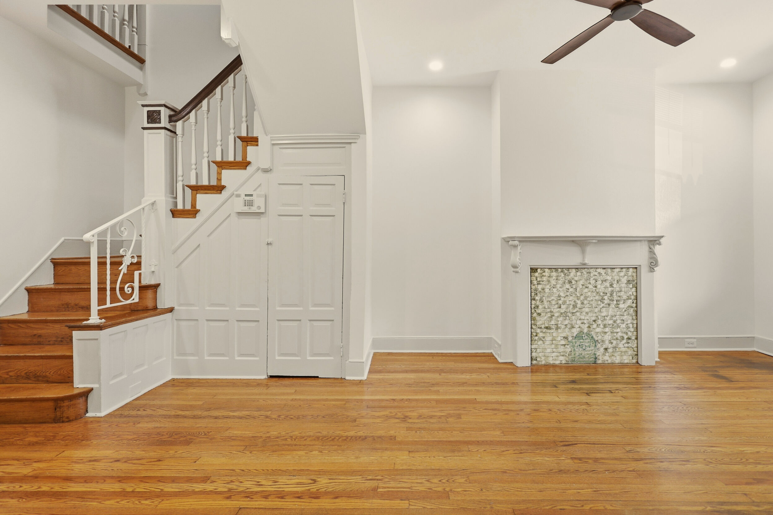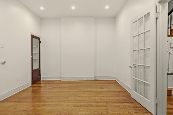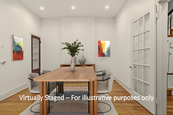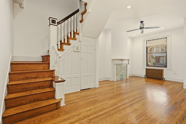Renovated and freshly painted, 2323 W Cumberland Street is a classic brick-front townhouse in Philadelphia’s Strawberry Mansion neighborhood that blends original character with practical updates. A front garden and covered porch lead to an intact vestibule entry, where original wood paneling and a 15-lite wood door create a warm first impression.