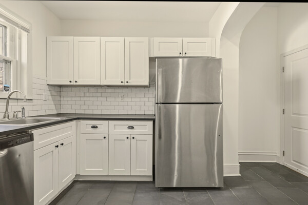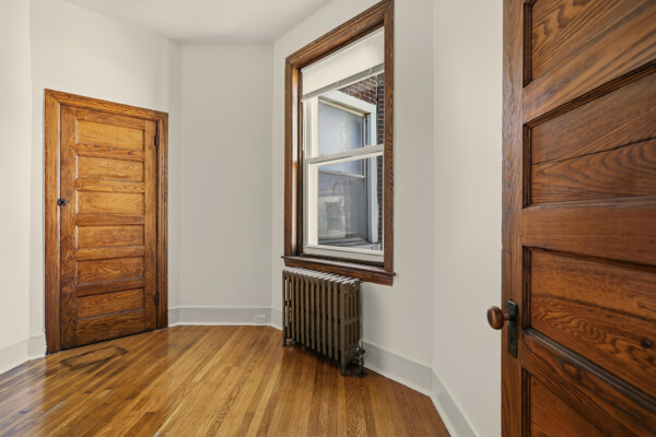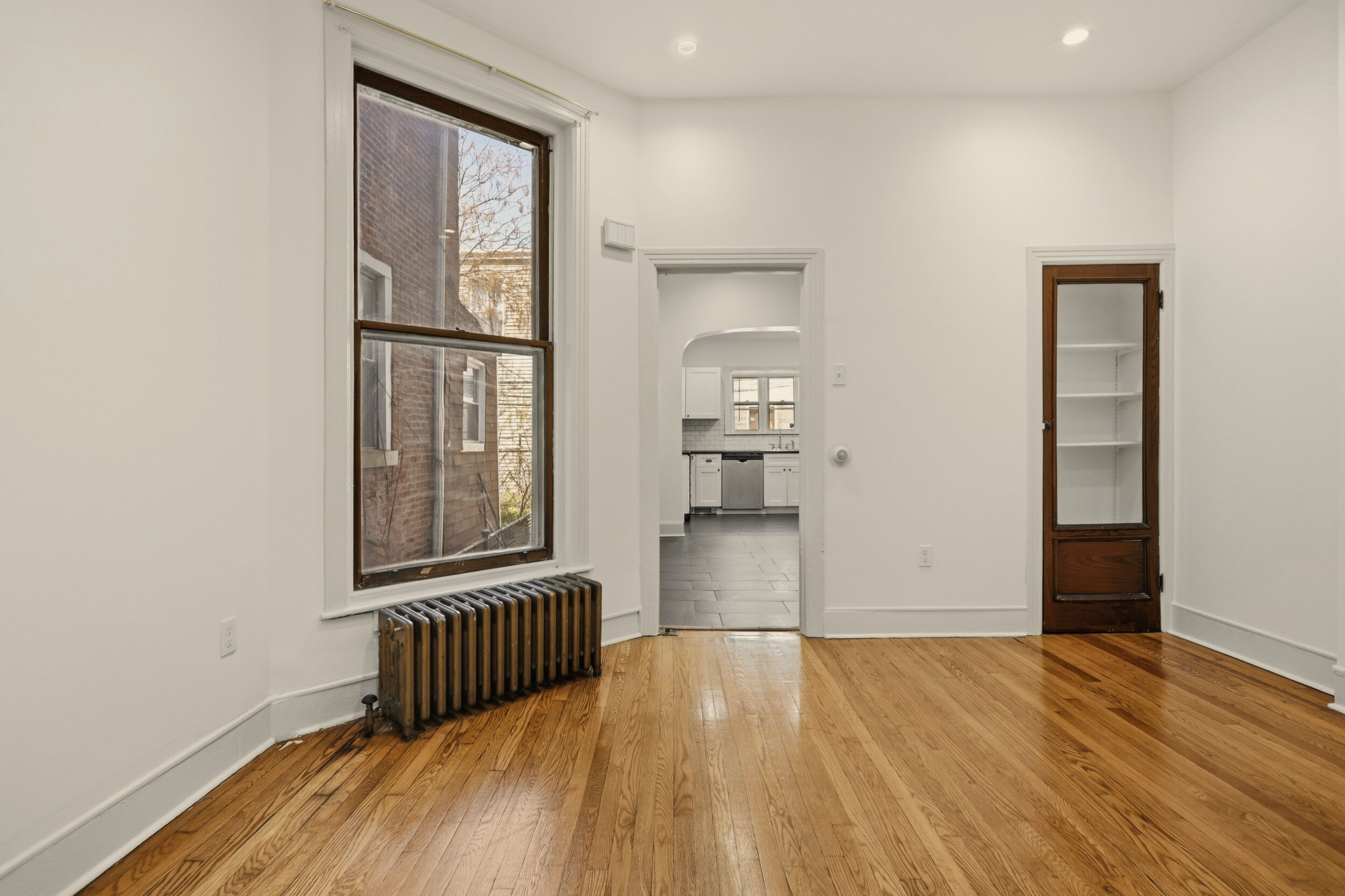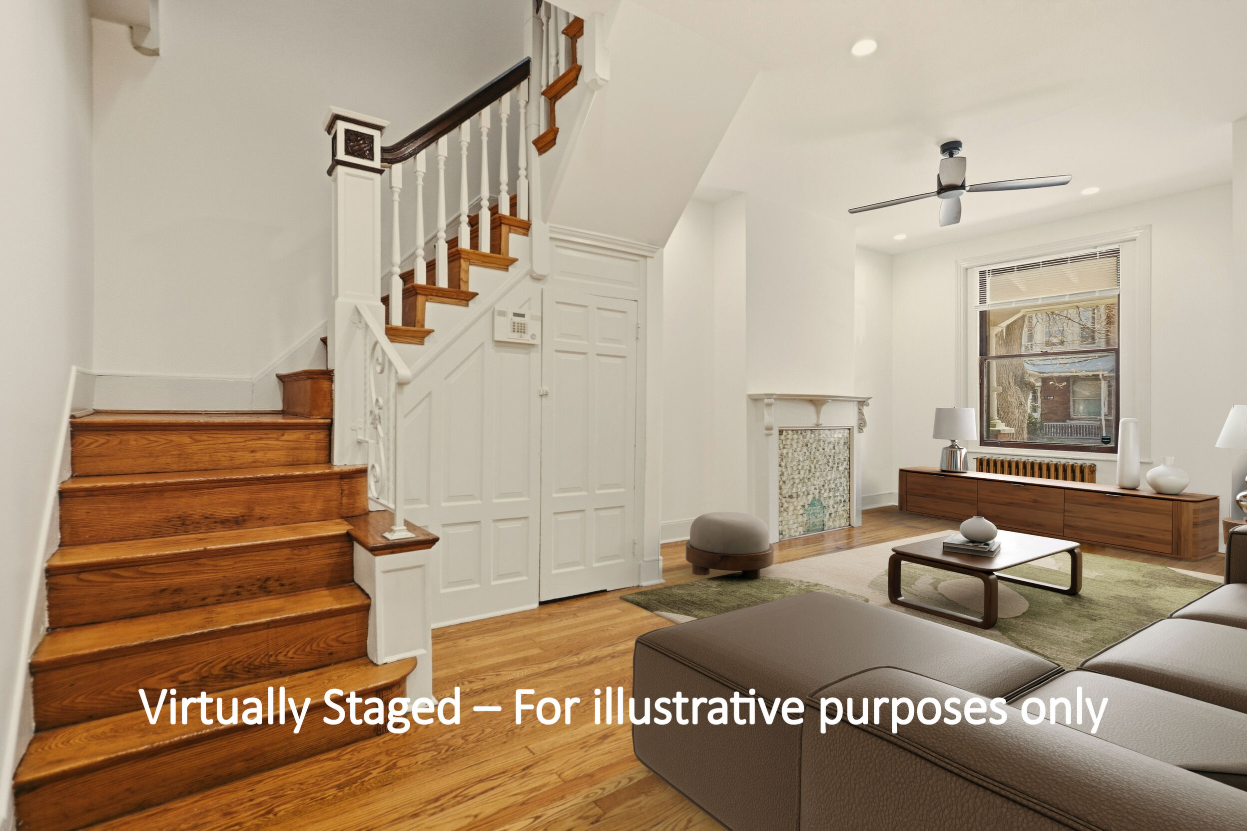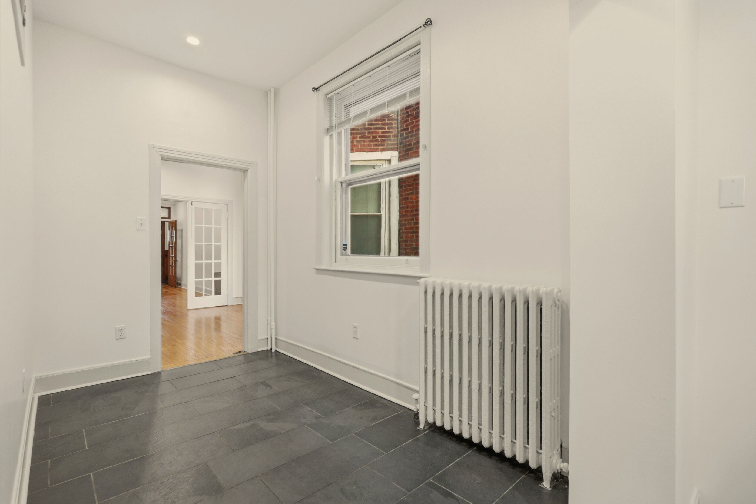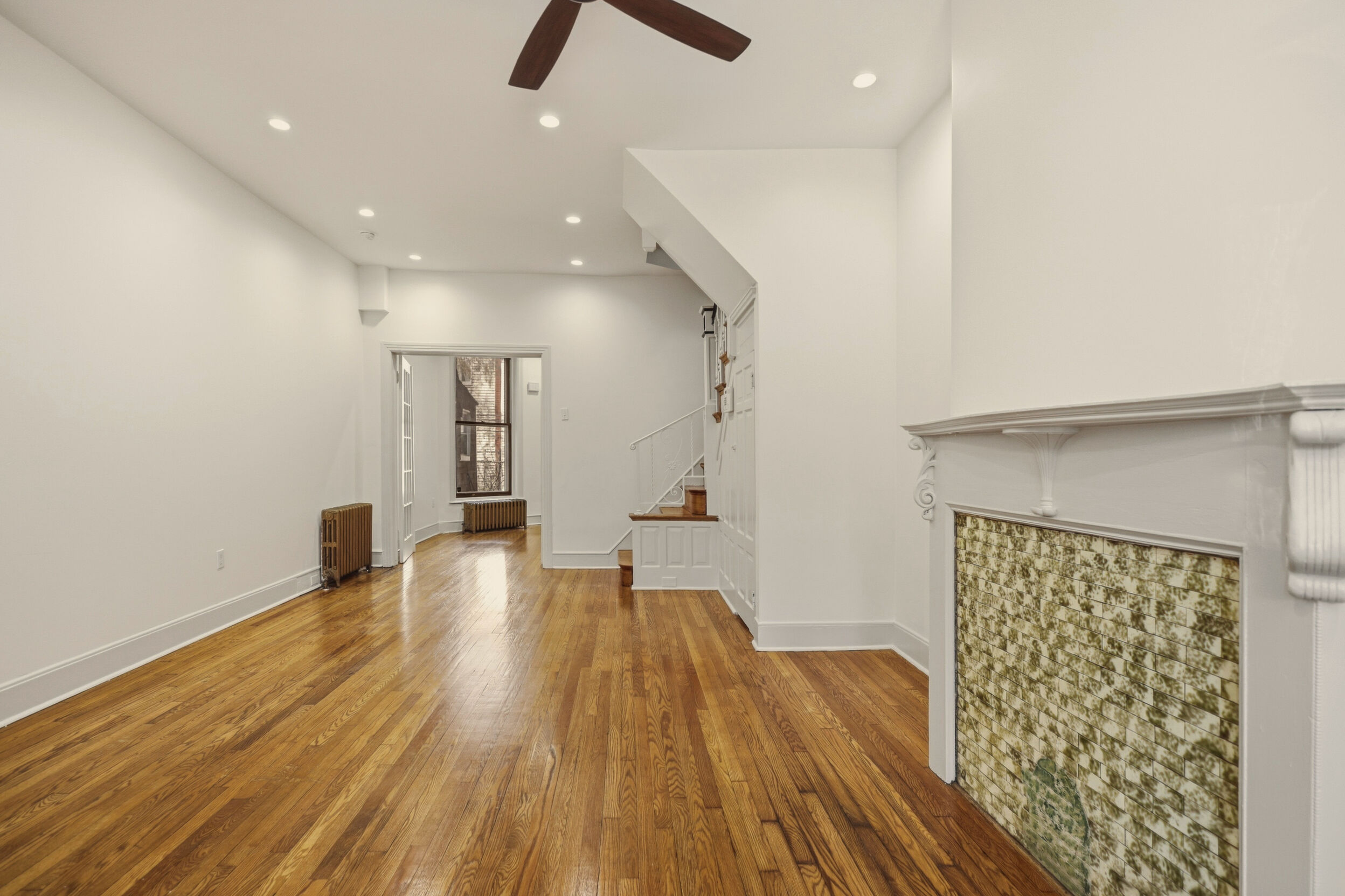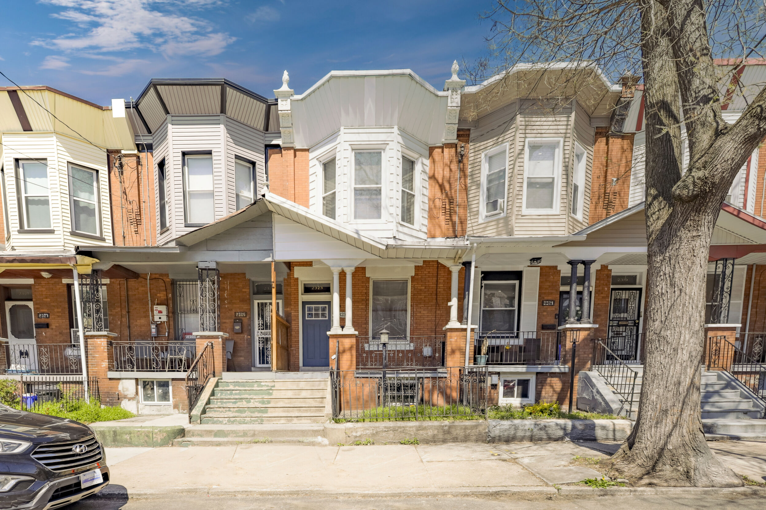 Renovated and freshly painted, 2323 W Cumberland Street is a classic brick-front townhouse in Philadelphia’s Strawberry Mansion neighborhood that blends original character with practical updates. A front garden and covered porch lead to an intact vestibule entry, where original wood paneling and a 15-lite wood door create a warm first impression.