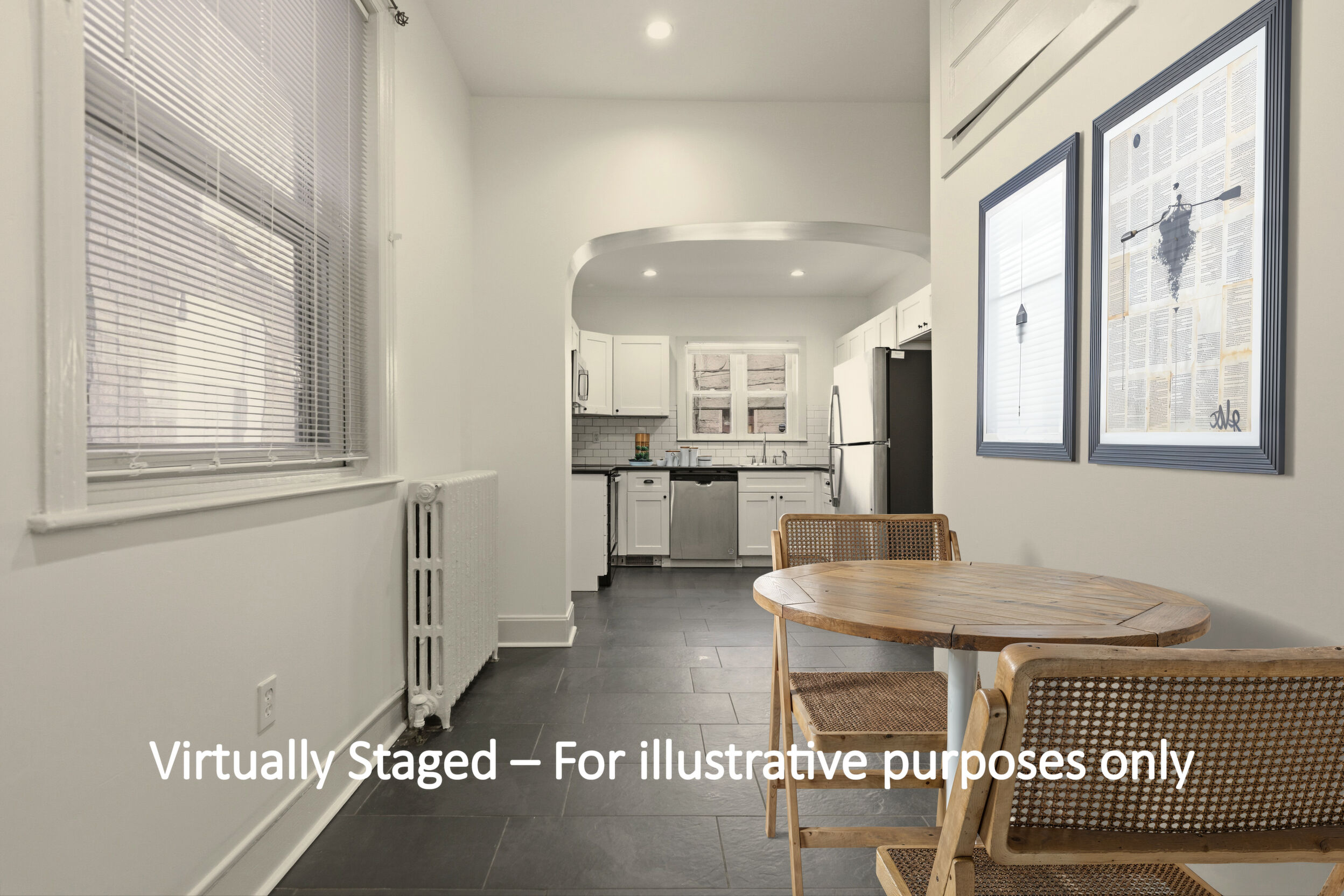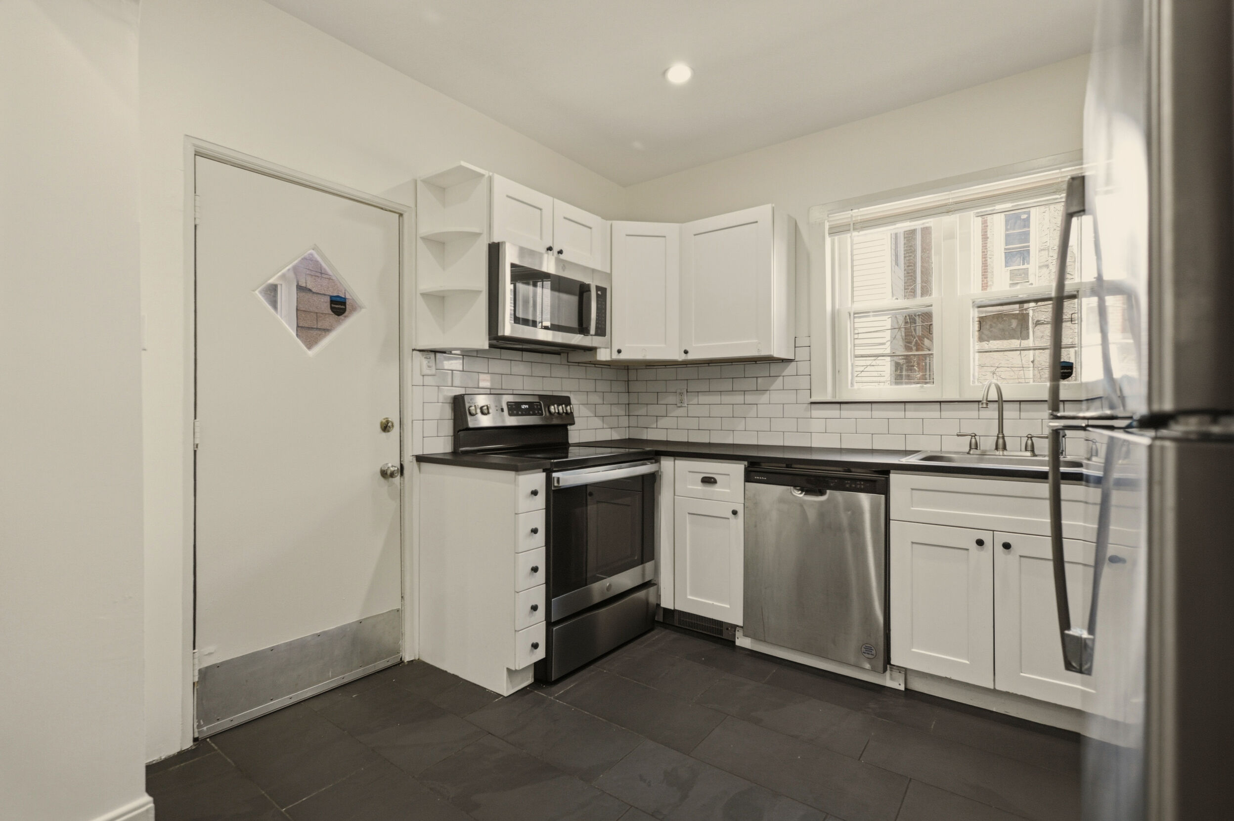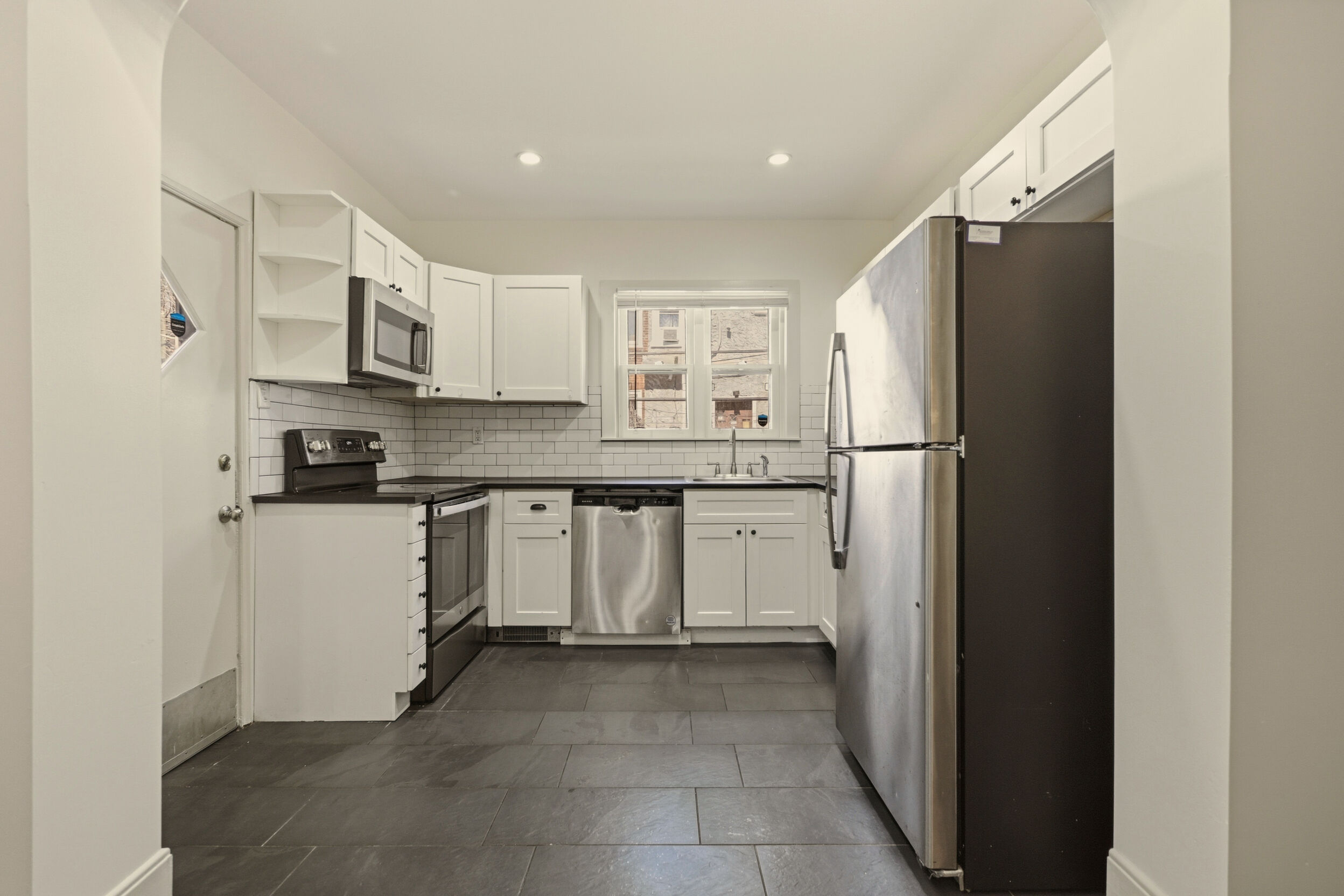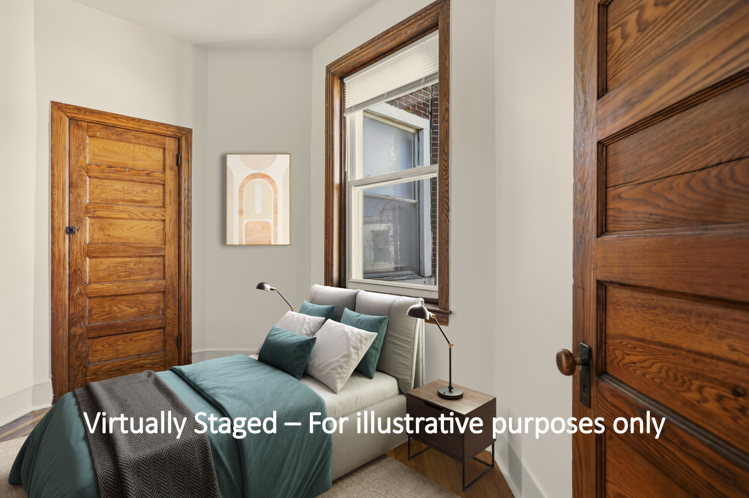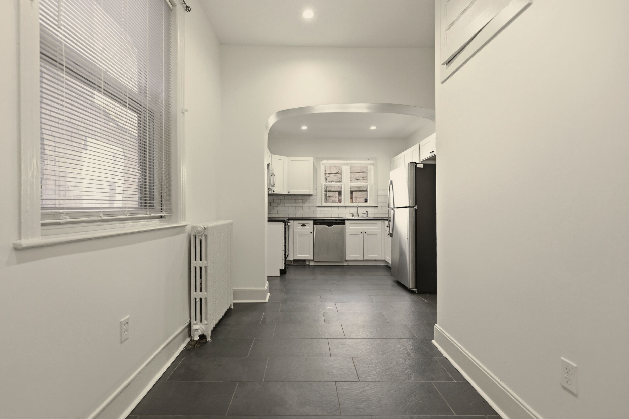 Renovated and freshly painted, 2323 W Cumberland Street is a classic brick-front townhouse in Philadelphia’s Strawberry Mansion neighborhood that blends original character with practical updates. A front garden and covered porch lead to an intact vestibule entry, where original wood paneling and a 15-lite wood door create a warm first impression.