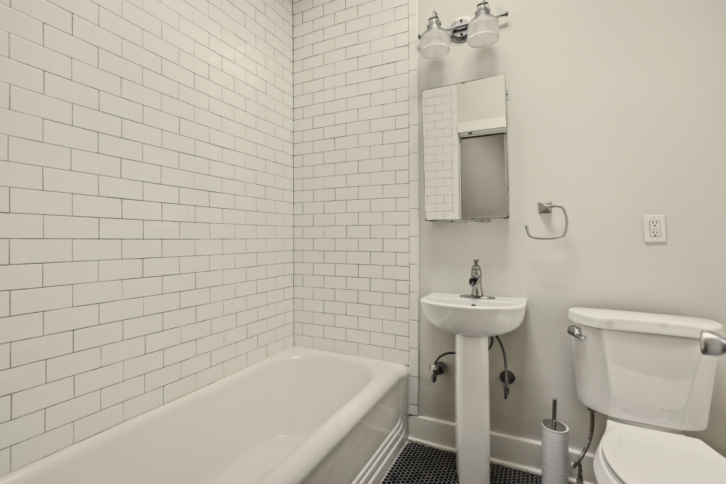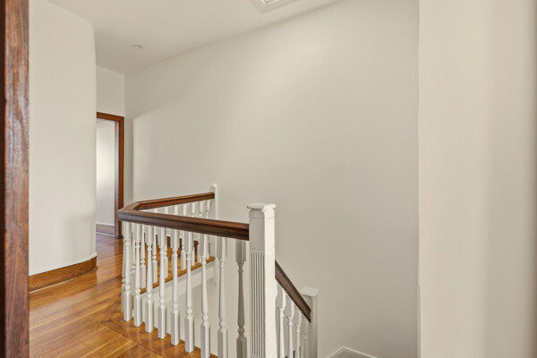 Upstairs, a wide hallway and walk-in hall closet benefit from skylights that bring natural light into the center of the home. The front bedroom is especially inviting, with original French doors and incredible natural light. The hall bath includes a full-size tub and shower with subway tile surround, penny round tile floor, and skylight above. Two additional bedrooms complete the second floor.