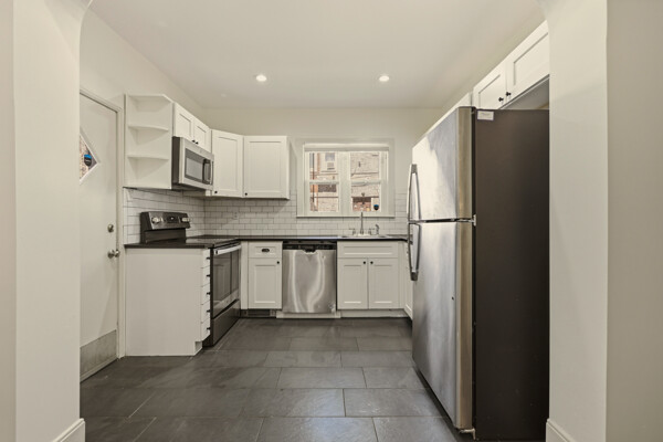 Inside, 9-foot ceilings and wood floors continue throughout the home. The main level offers a spacious living room with recessed lighting, a ceiling fan, and an original decorative tiled fireplace with mantle. French doors open to the dining room, creating a flexible layout for everyday living and entertaining. Beyond, the updated eat-in kitchen features stainless steel appliances, a subway tile backsplash, and room for casual dining.