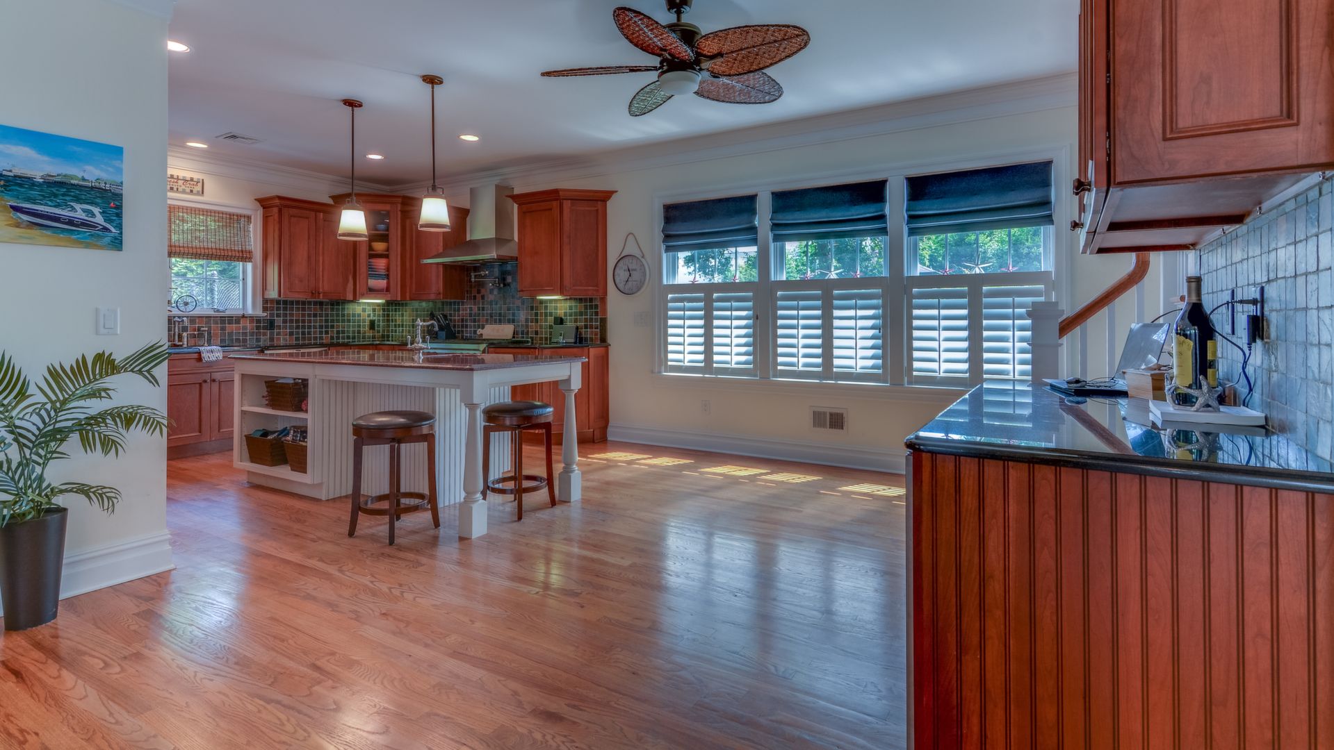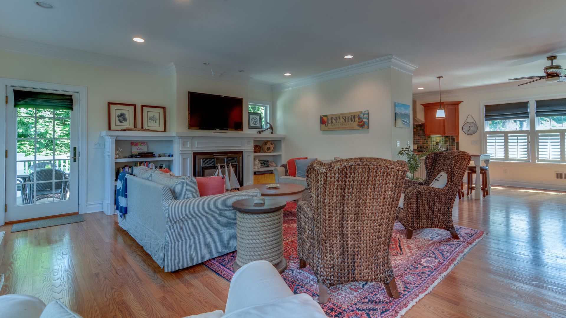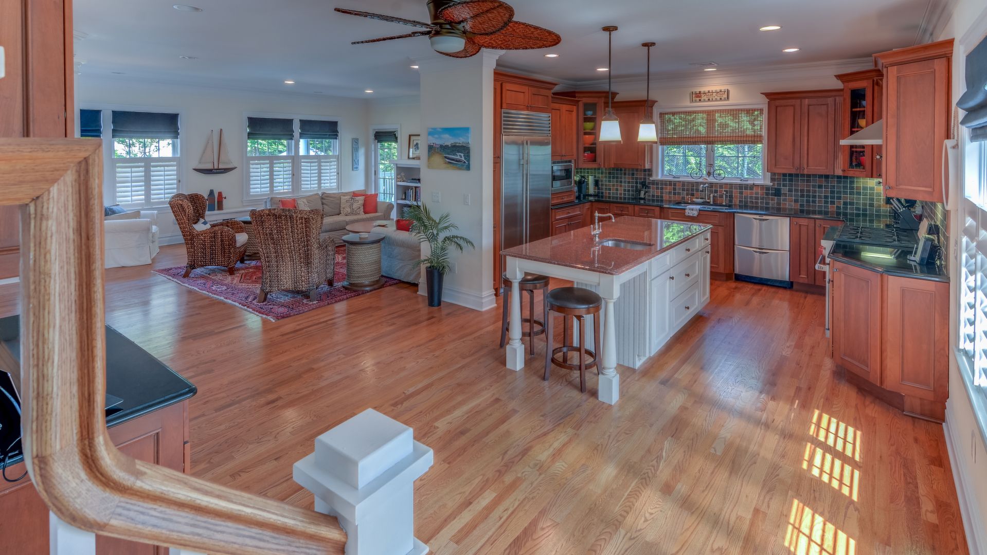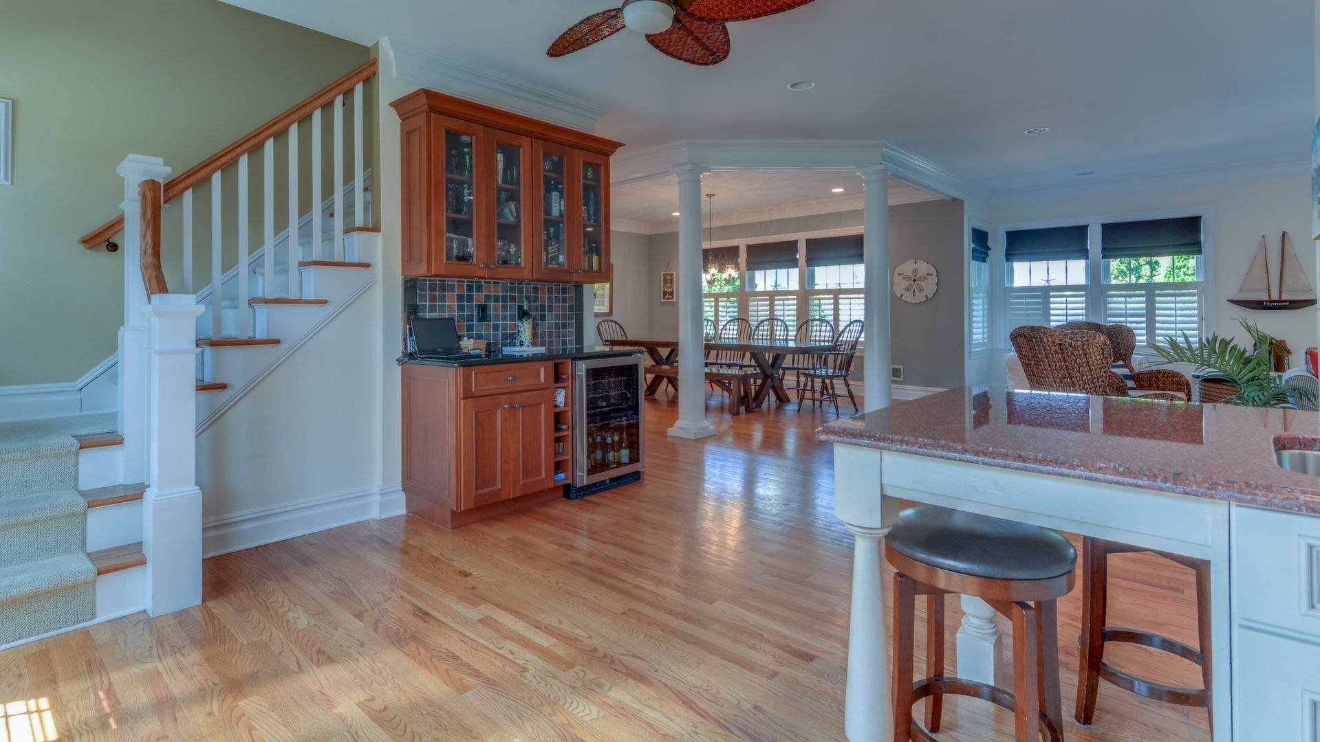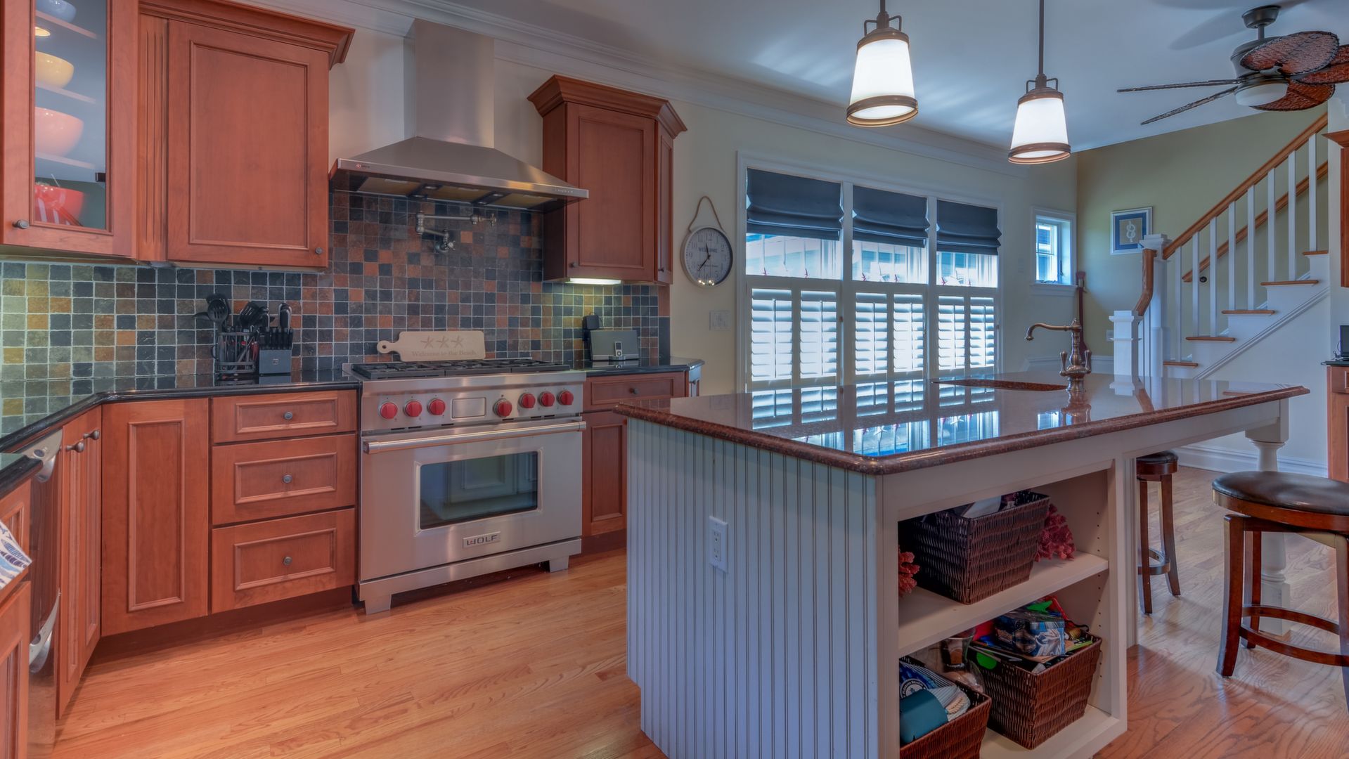 It opens to the living area w/gas fireplace & dining area seating 20+. HW floors, crown molding and custom plantation shutters throughout. 1st floor also has an ensuite bedroom. Front-and-back staircases bring you to the 2nd floor with 5 additional br's including a luxurious master suite with his/her closets, fireplace, & balcony.