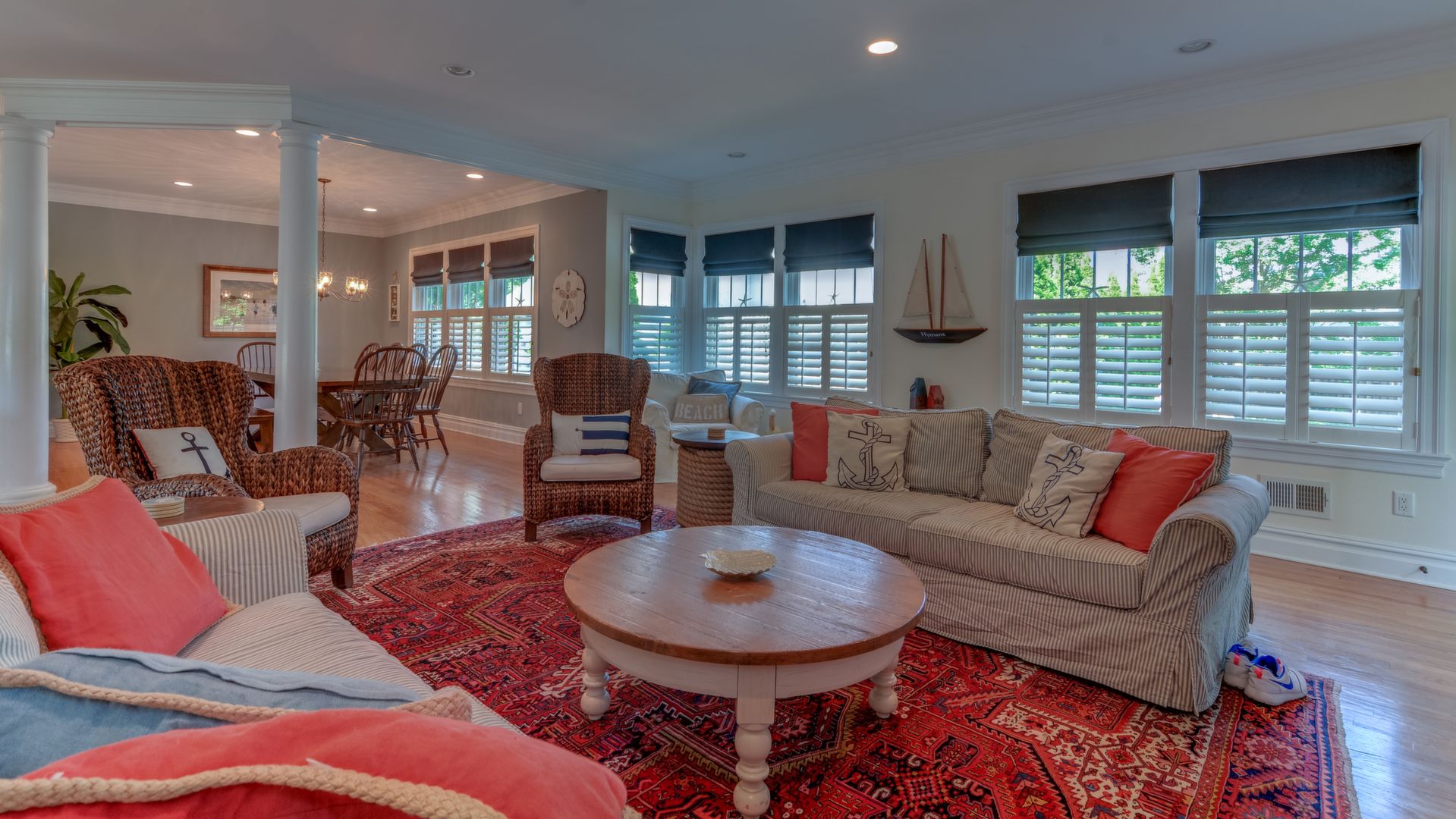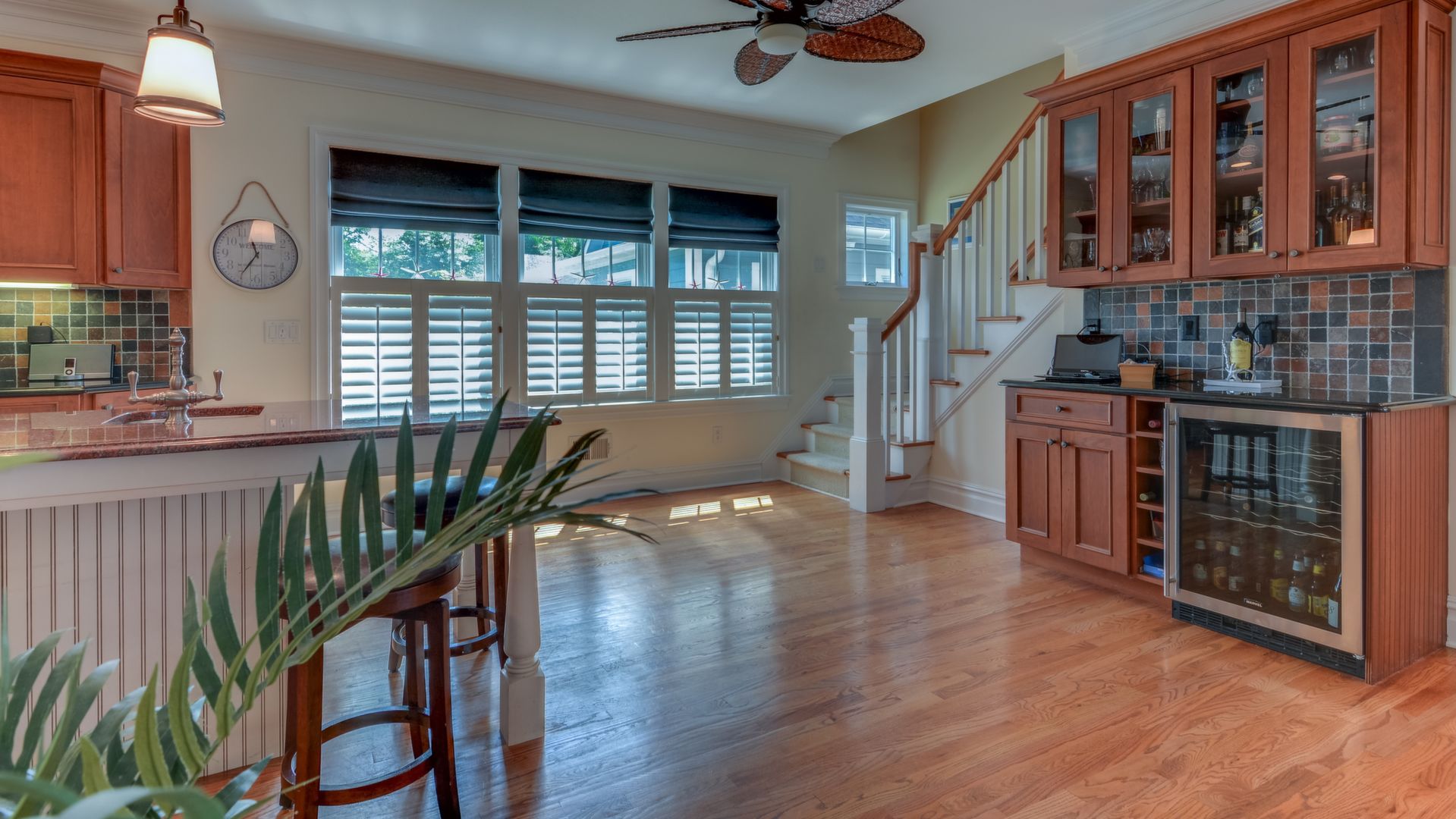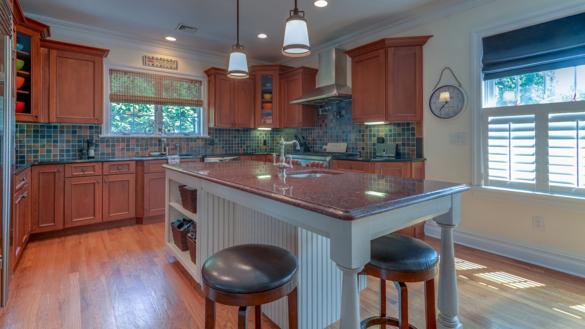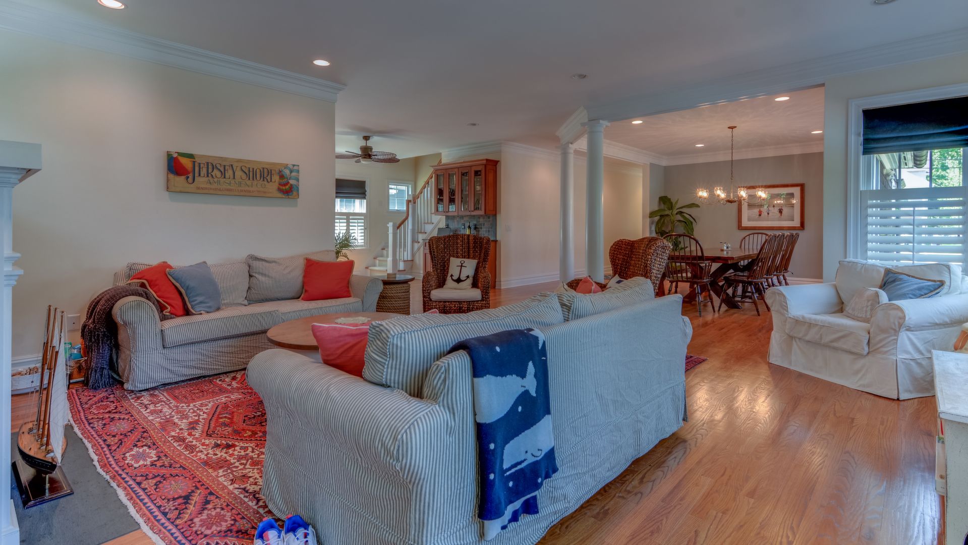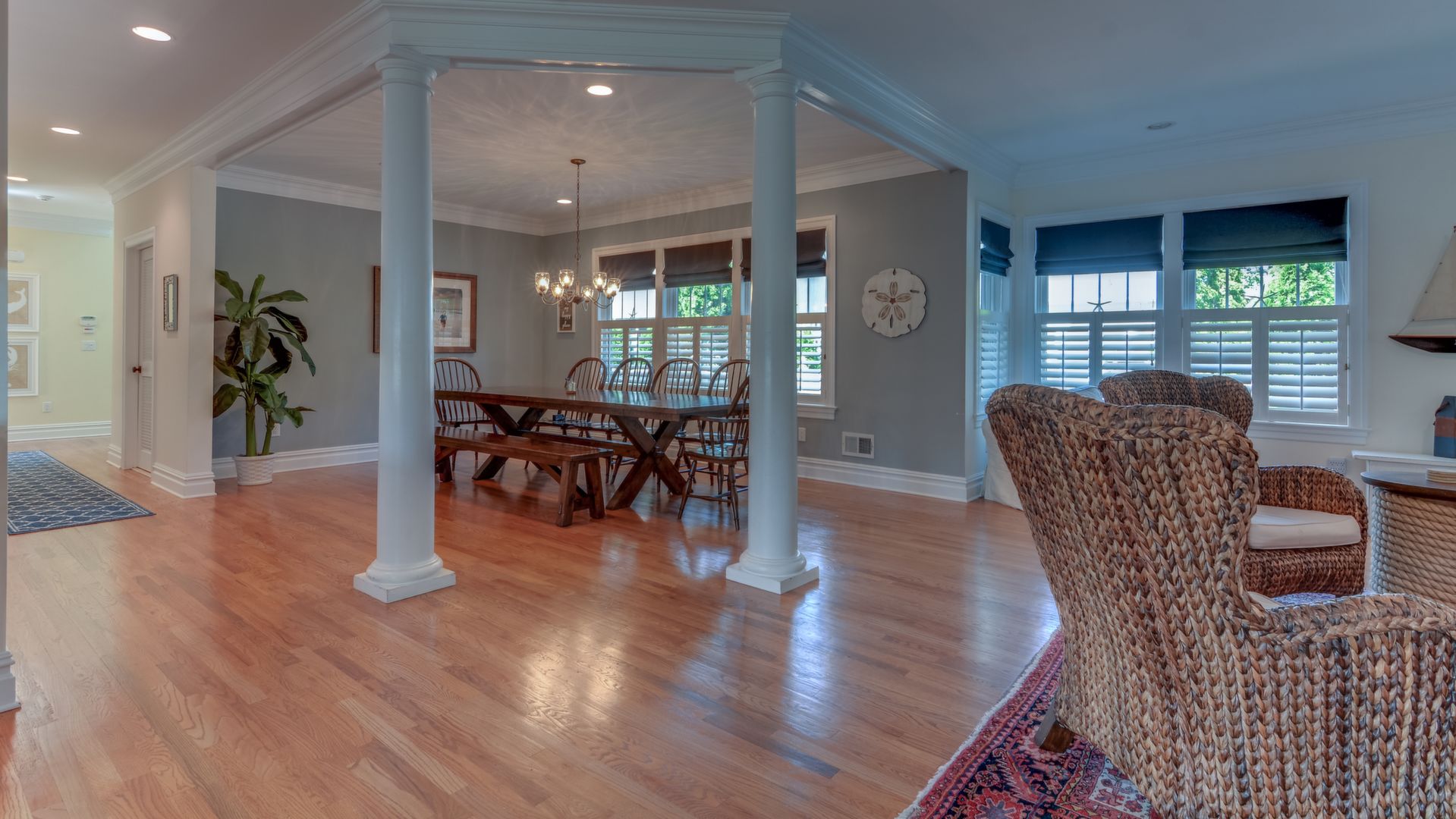 It opens to the living area w/gas fireplace & dining area seating 20+. HW floors, crown molding and custom plantation shutters throughout. 1st floor also has an ensuite bedroom. Front-and-back staircases bring you to the 2nd floor with 5 additional br's including a luxurious master suite with his/her closets, fireplace, & balcony.