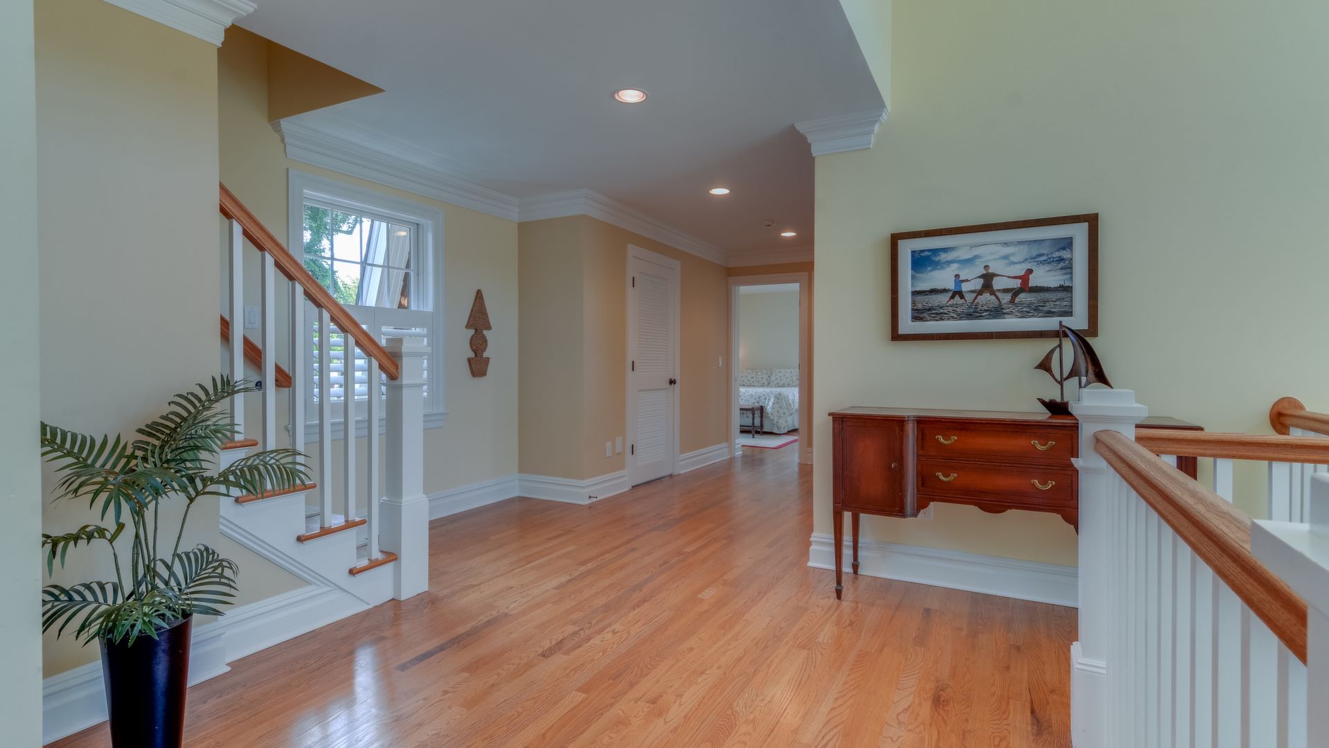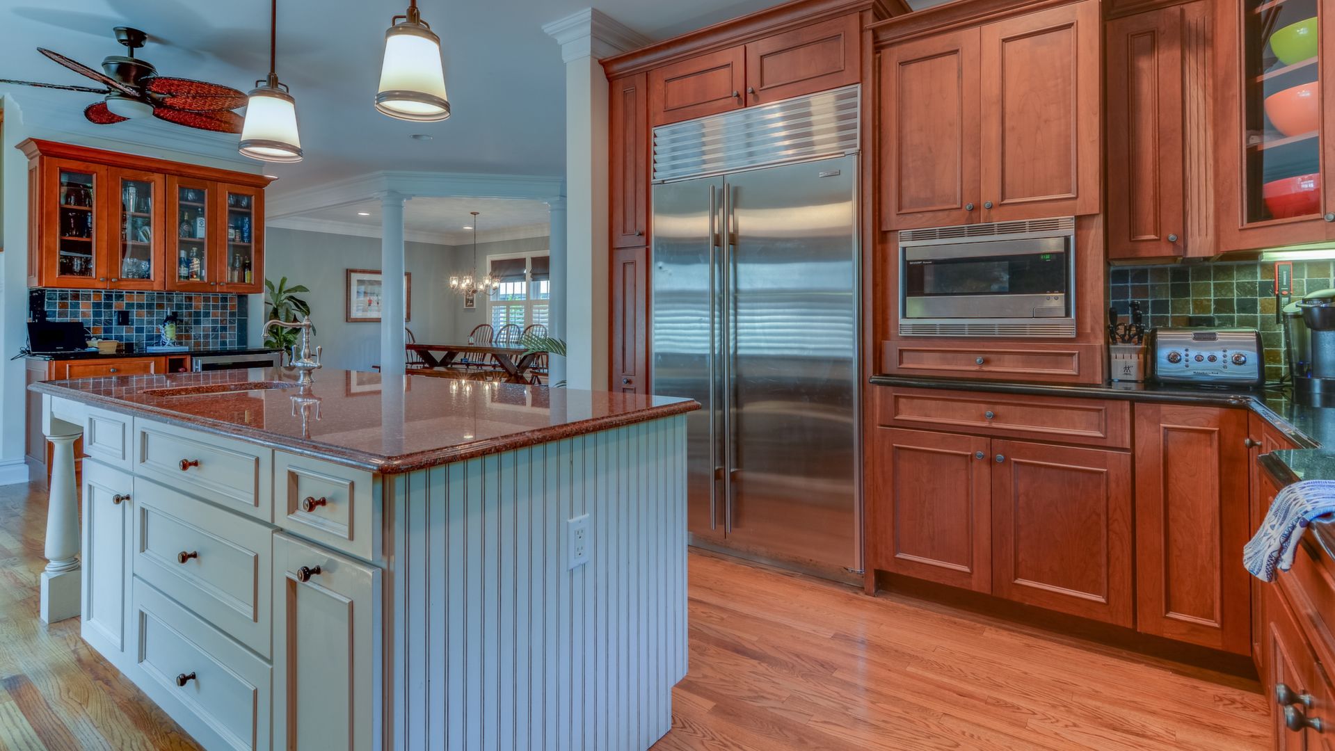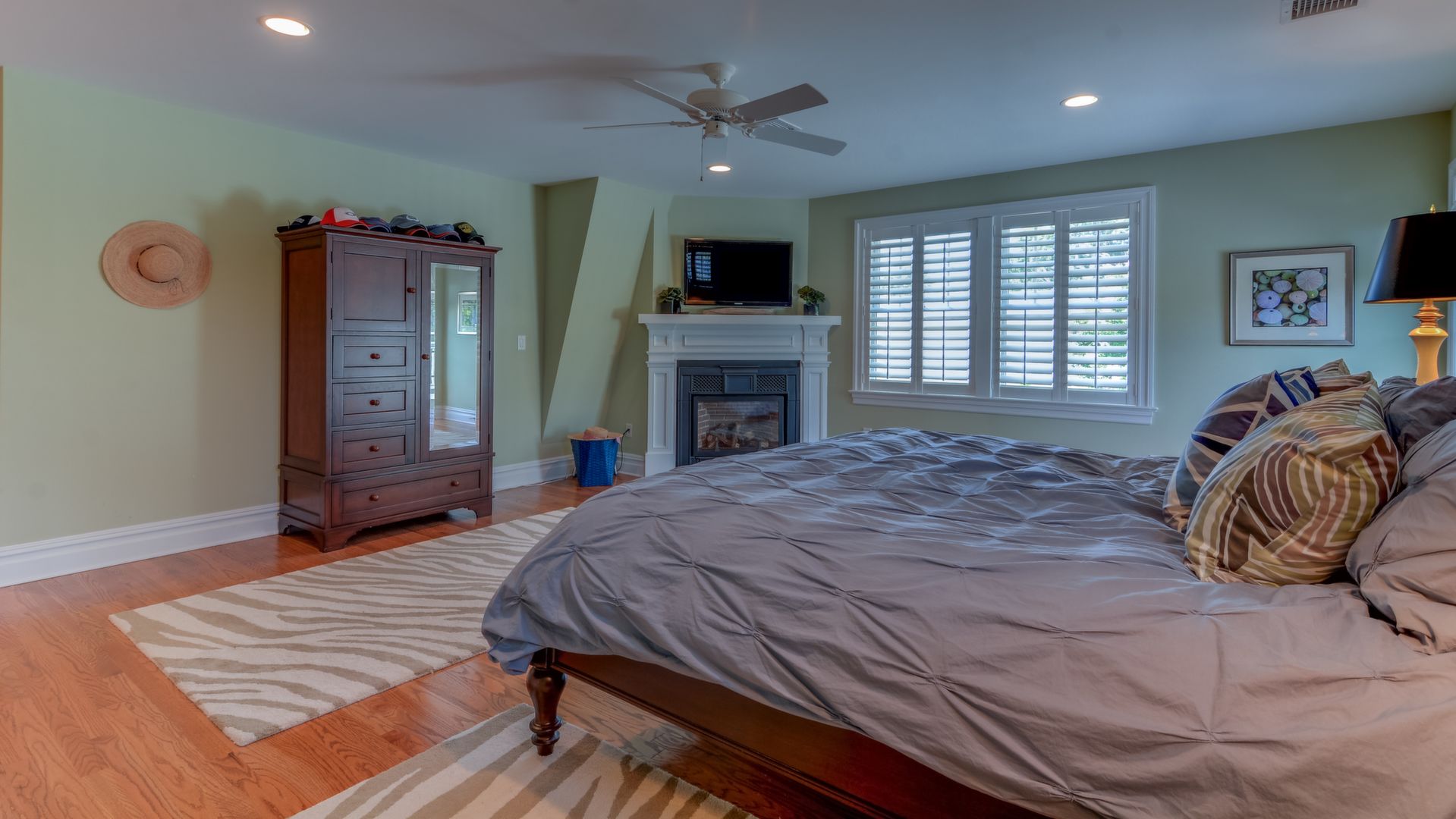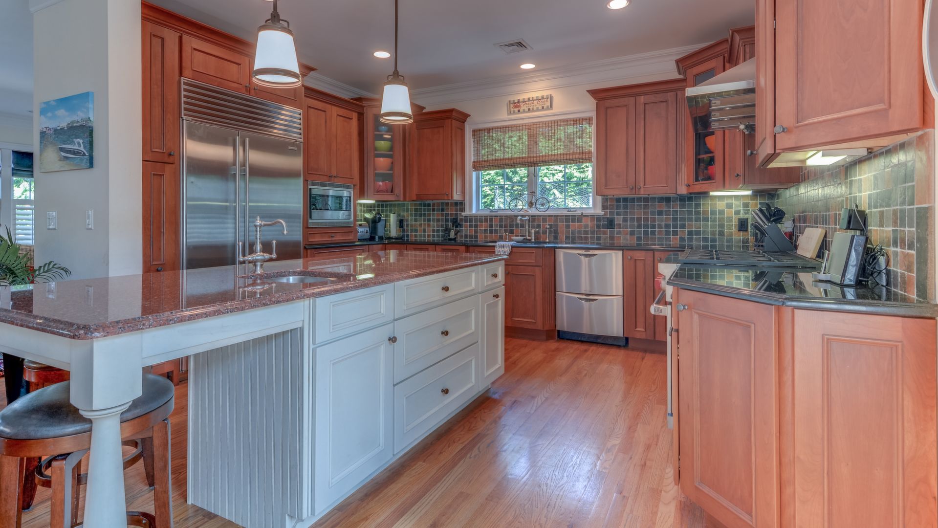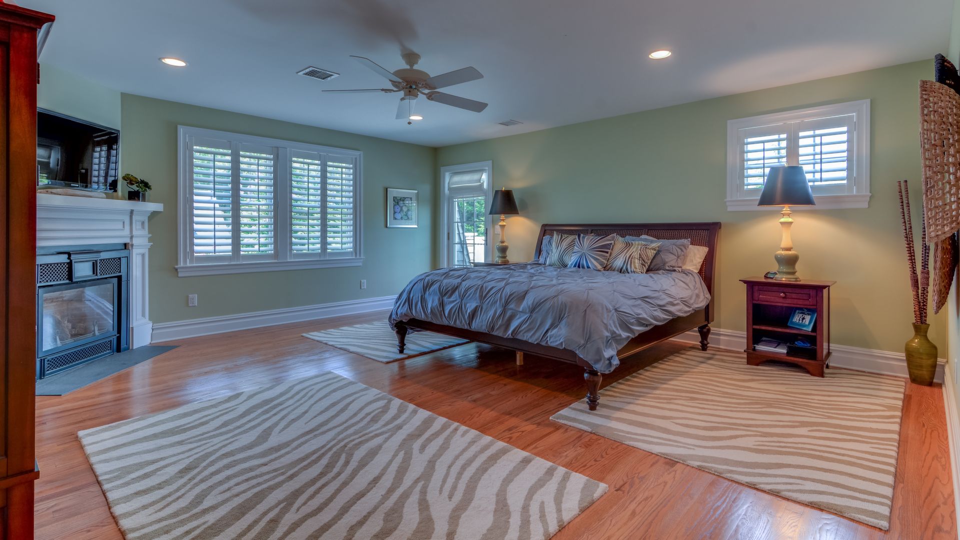 It opens to the living area w/gas fireplace & dining area seating 20+. HW floors, crown molding and custom plantation shutters throughout. 1st floor also has an ensuite bedroom. Front-and-back staircases bring you to the 2nd floor with 5 additional br's including a luxurious master suite with his/her closets, fireplace, & balcony.
