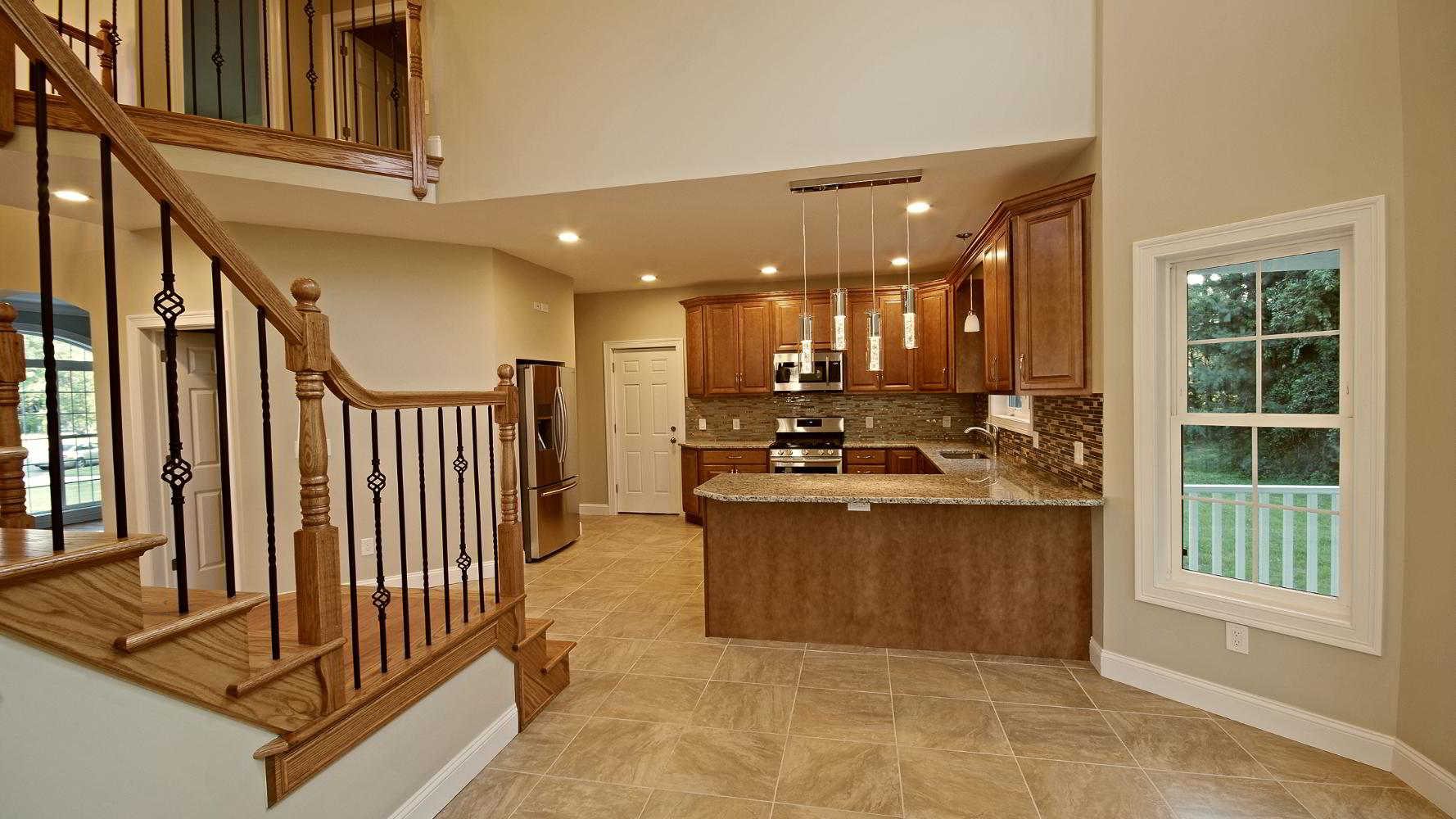 Gorgeous granite kitchen with attractive backsplash, SS appliances, walk-in pantry, sliders to generous covered porch/recessed lights o'looking private yard.